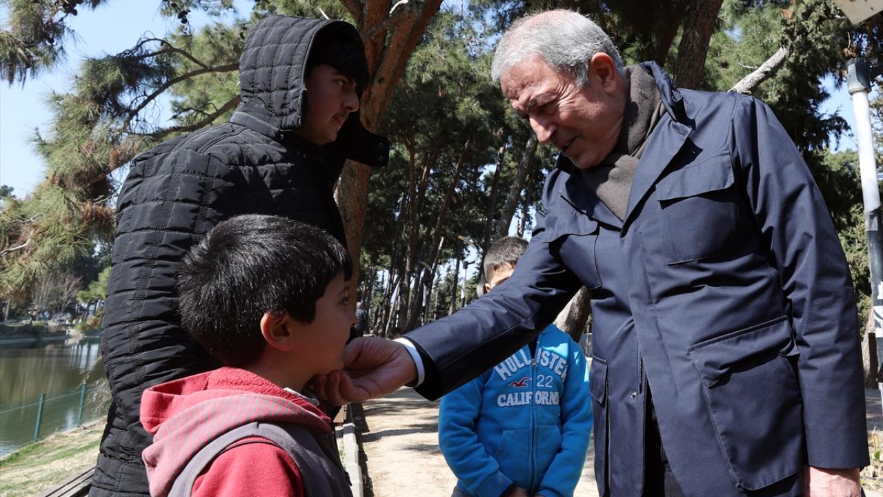 Çadır kentteki depremzedelerle bir araya gelen Akar, çocuklarla da yakından ilgilendi. Depremzedelerin taleplerini tek tek dinleyen Akar, "Deprem çok geniş bir alanda etkisini gösterdi. Bütün bakanlıklar, kurum kuruluşlar, devletimiz, milletimiz bütün 85 milyon ayakta. Acımız, kederimiz büyük. Bu yaraları sarmak için ilk günden itibaren asil milletimizle birlikte omuz omuza çalışarak tek yumruk, tek yürek olarak inşallah tüm bu sıkıntıların üstesinden gelecek, yaralarımızı saracağız." diye konuştu.