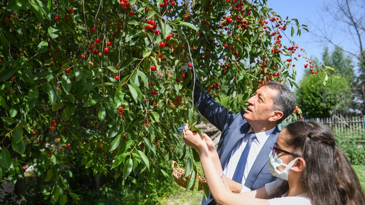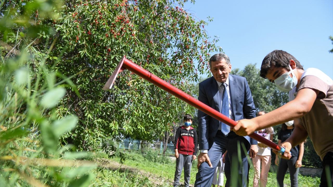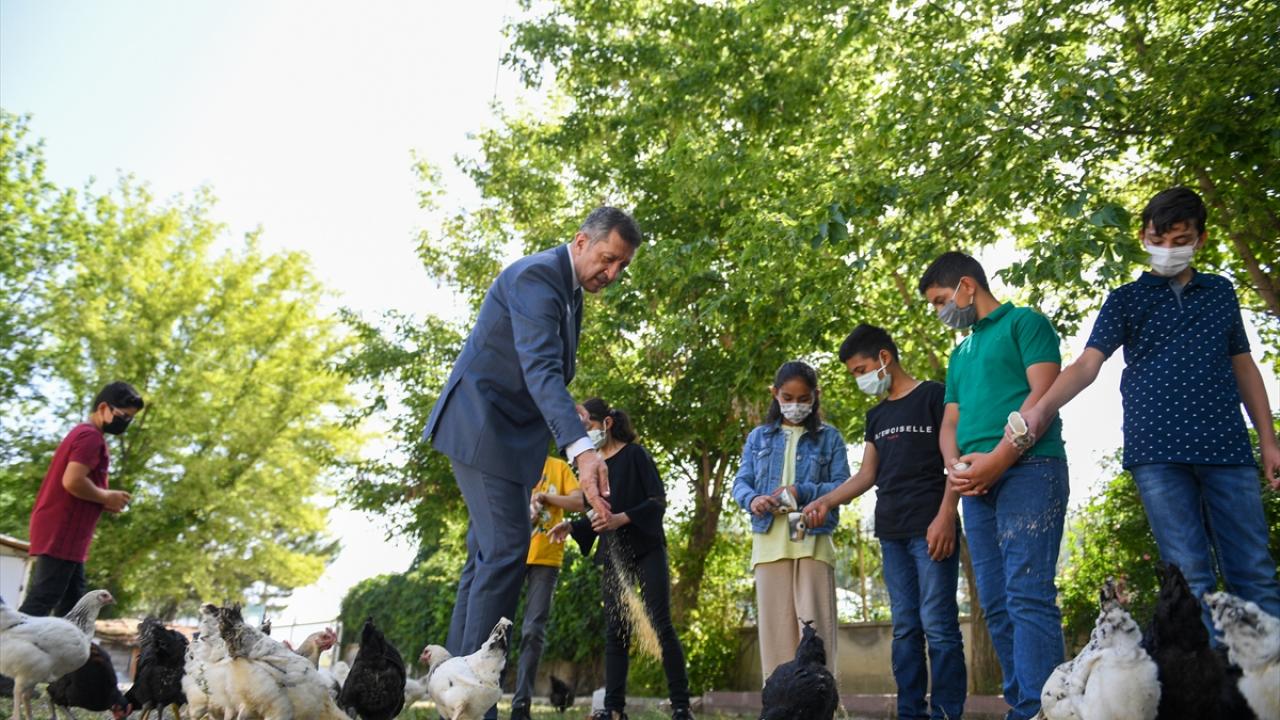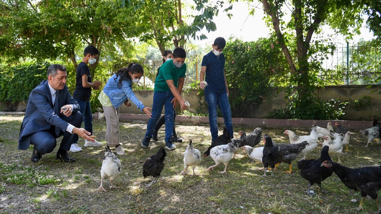 Telafi etkinlikleri kapsamında tarım atölyesinde yer alan öğrencilerle bir araya gelen Selçuk, birlikte kiraz topladığı öğrencilerle kümesteki tavukları besledi ve bahçede çapa yaptı.