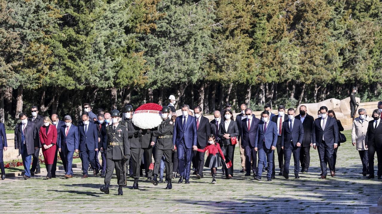 Heyettekiler maske takarken, Aslanlı Yol`daki yürüyüş, mozoleye çelenk bırakılması ve Anıtkabir Özel Defteri`nin imzalanması sırasında sosyal mesafe korundu.