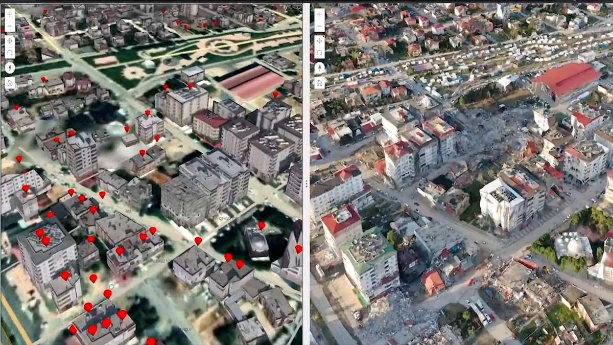 Çevre, Şehircilik ve İklim Değişikliği Bakanlığı'nca, Kahramanmaraş merkezli depremlerden etkilenen 10 ilde insansız hava aracı (İHA), dron ve Göktürk uydu görüntüleri ile dijital şehir ikizi görüntüleri karşılaştırılarak binalarda ön hasar tespit çalışmalar yürütülüyor.