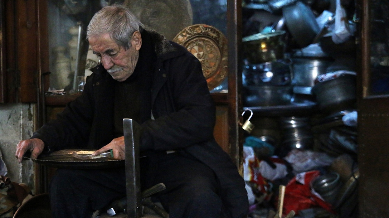 Gaziantep Bakırcılar Çarşısı'nın en yaşlı bakır ustası 80 yaşındaki Salman Çarlı, 7 yaşında çırak olarak başladığı mesleğini, elindeki çekiçle bakıra şekil vererek 73 yıldır sürdürüyor.