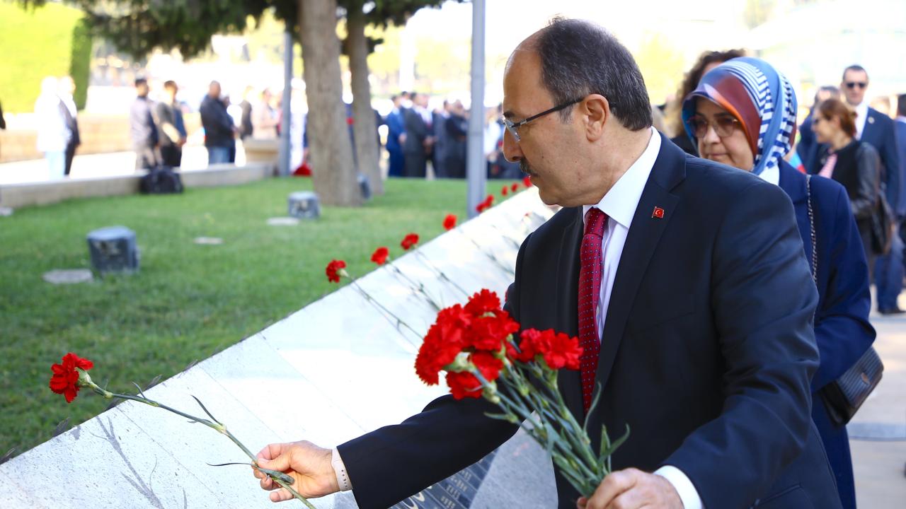Şehitlik anı defterini imzalayan Bağcı, temsili şehit mezarlarına karanfil bıraktı.