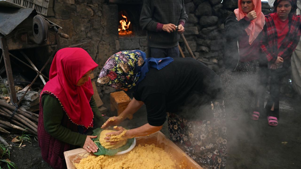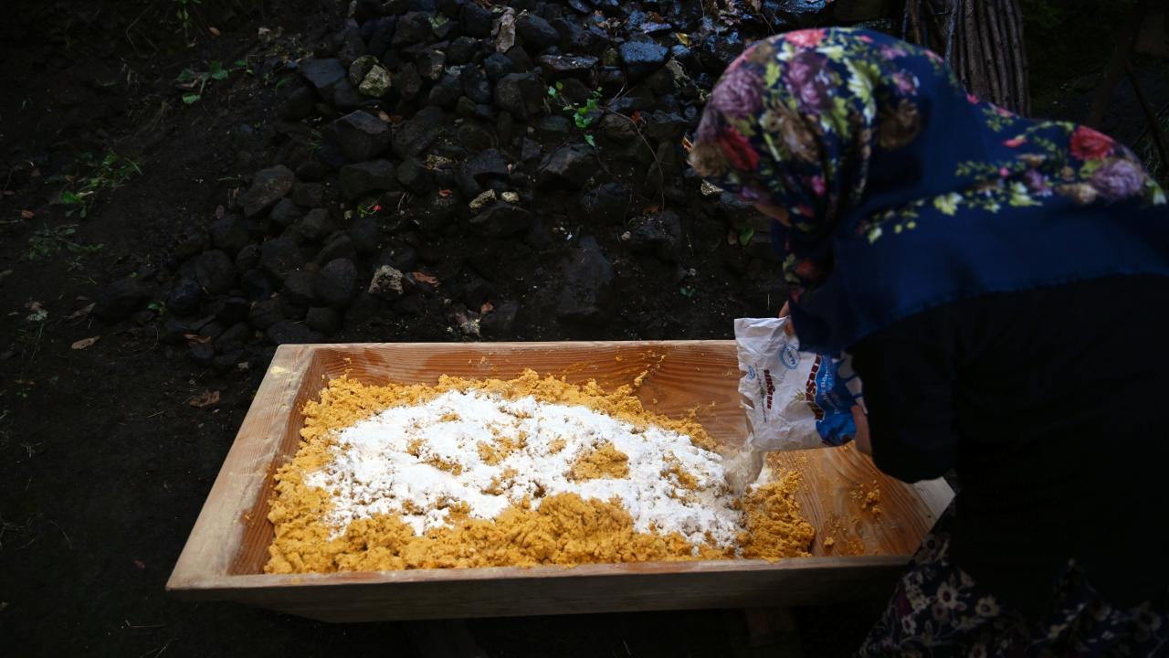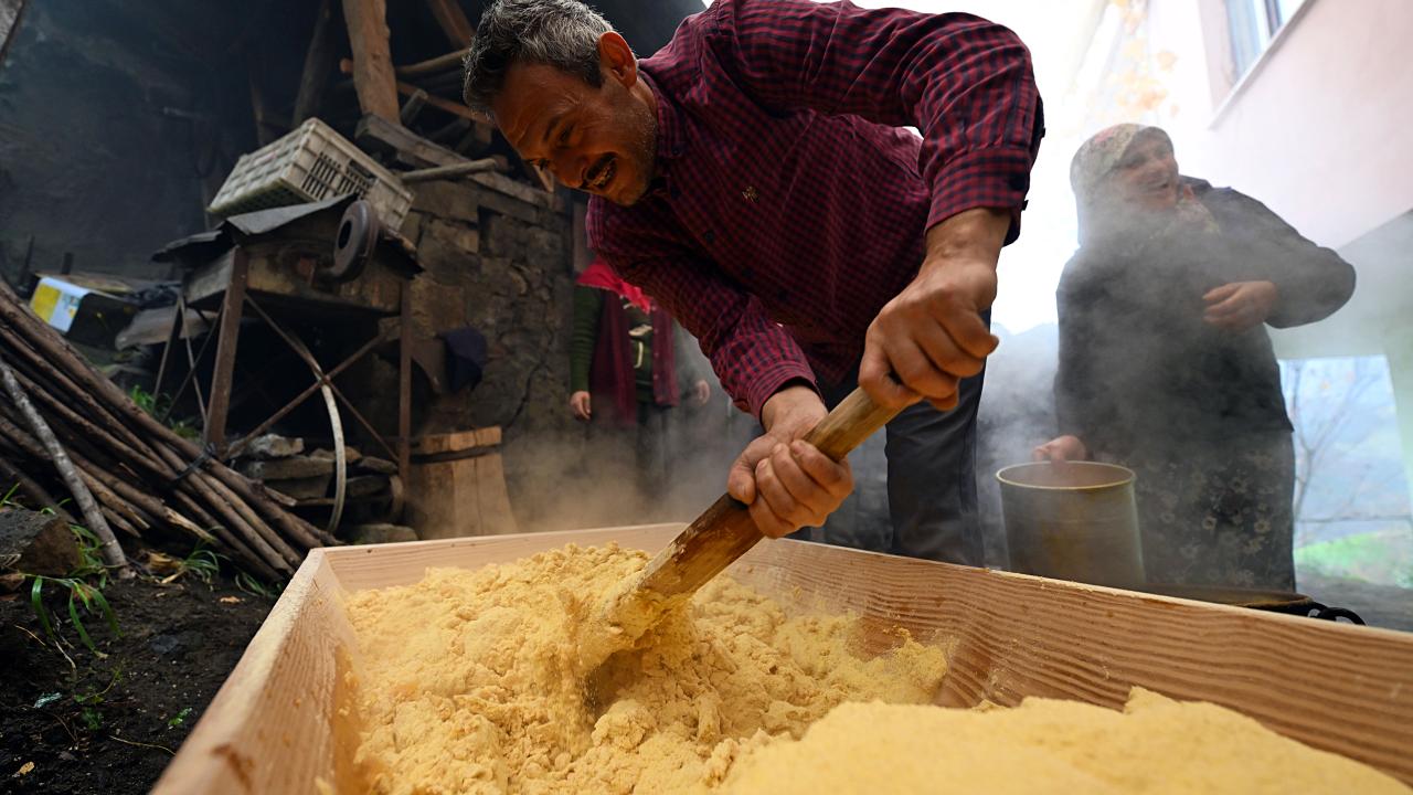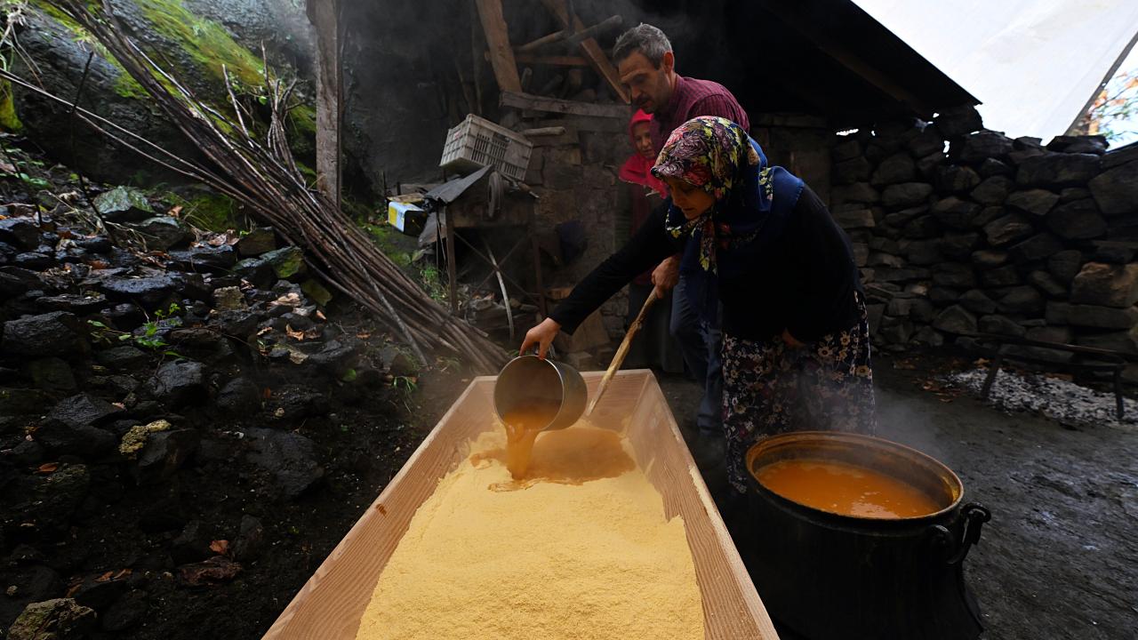 Tarlalarında yetişen bal kabaklarını toplayıp sabahın erken saatlerinde kazanda pişirmeye başlayan aile üyeleri, ahşap ekmek teknesinde mısır ununu eleyip tuz ve az miktarda buğday unuyla buluşturuyor.