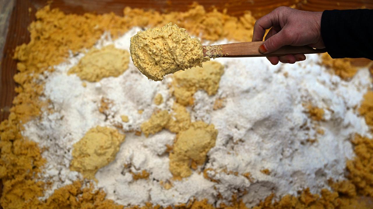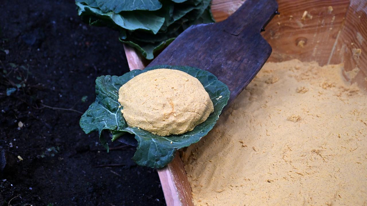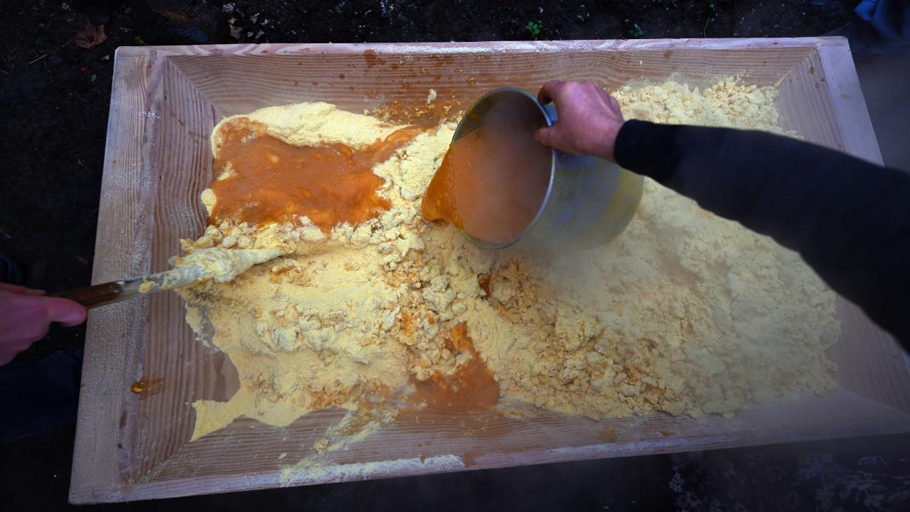 Karışıma kazanda püre haline gelen kabakların eklenmesiyle oluşan hamur yaklaşık 2 saat dinlendiriliyor. Elle yoğurulan hamur, ekşi mayayla karıştırılarak 2 saat daha mayalanmaya bırakılıyor.
