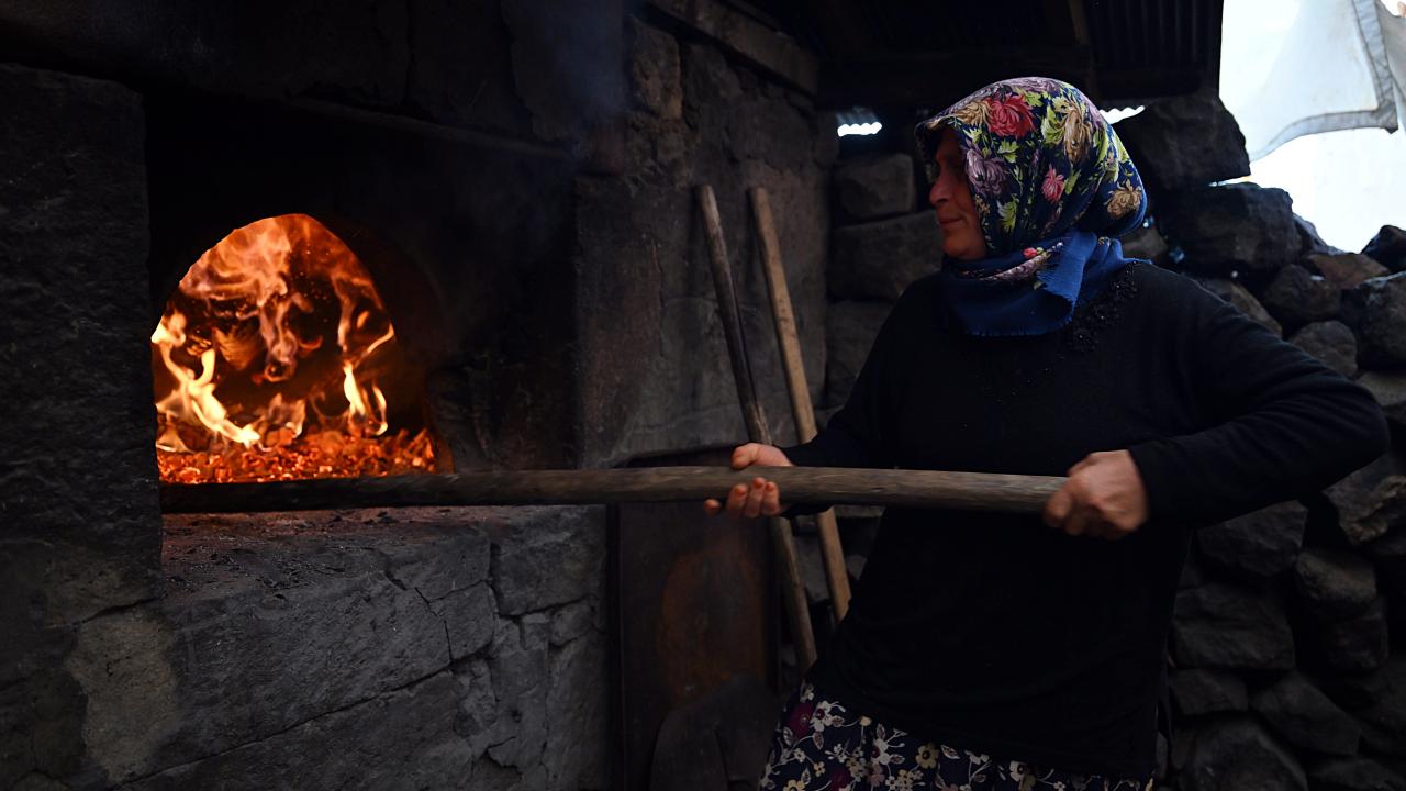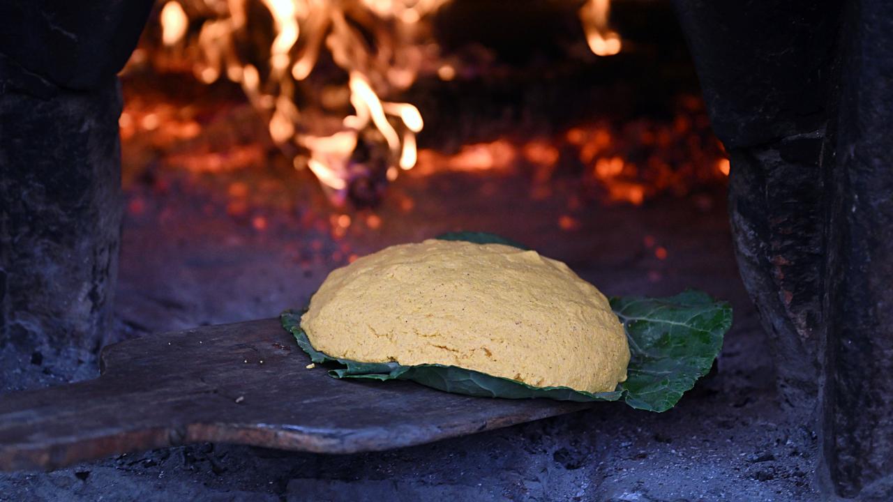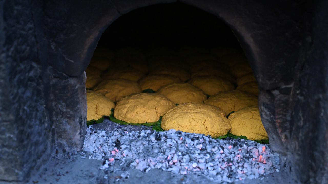 Büyük bir özenle hazırlanan hamur karalahana yaprağı üzerinde önceden odun ateşiyle yakılan taş fırında pişirilmeye başlanıyor. Aile üyelerinin kontrol ederek pişirdikleri bal kabaklı mısır ekmekleri, 24 saatin sonunda sofraya geliyor.