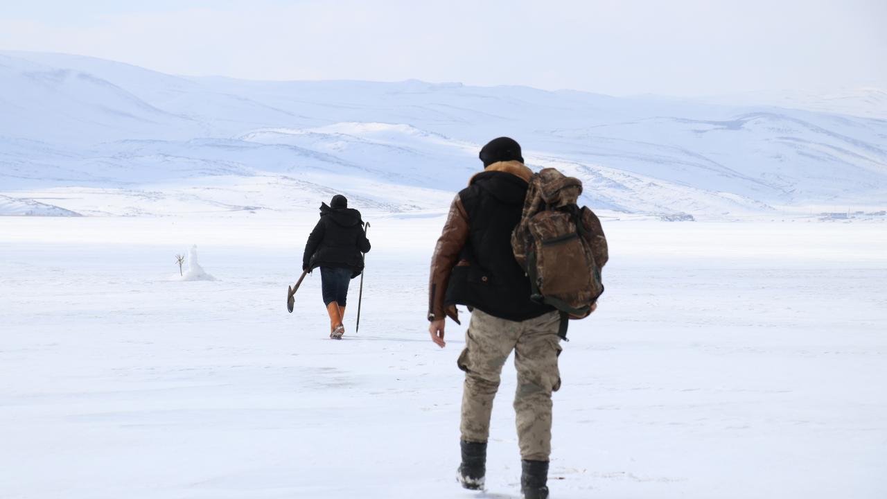 Yörede geçimini balıkçılıkla sağlayan göl çevresindeki köylüler, ilk olarak dondurucu soğukta yüzeyi buzla kaplı gölün üstünde uzun süre yürüyerek balıkların fazla olduğu yerleri tespit ediyor.