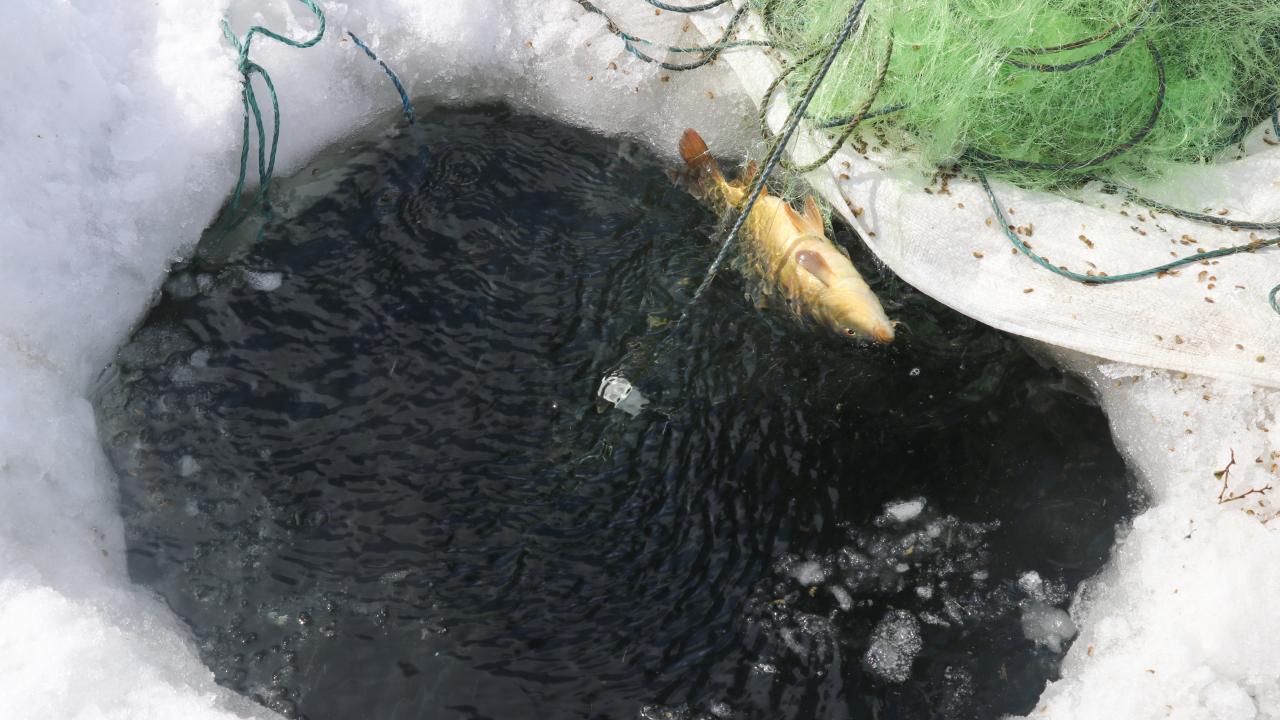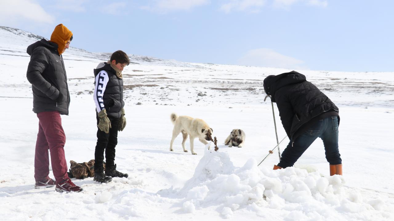 Yer yer 40 santimetre kalınlıktaki buzları kırarak belirli aralıklarla ağları göle bırakan köylüler, daha sonra bu yerleri işaretleyerek beklemeye koyuluyor.