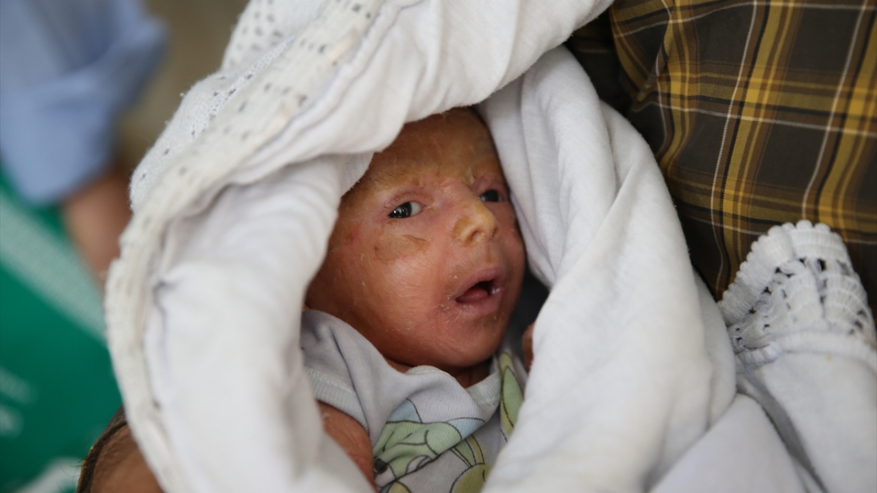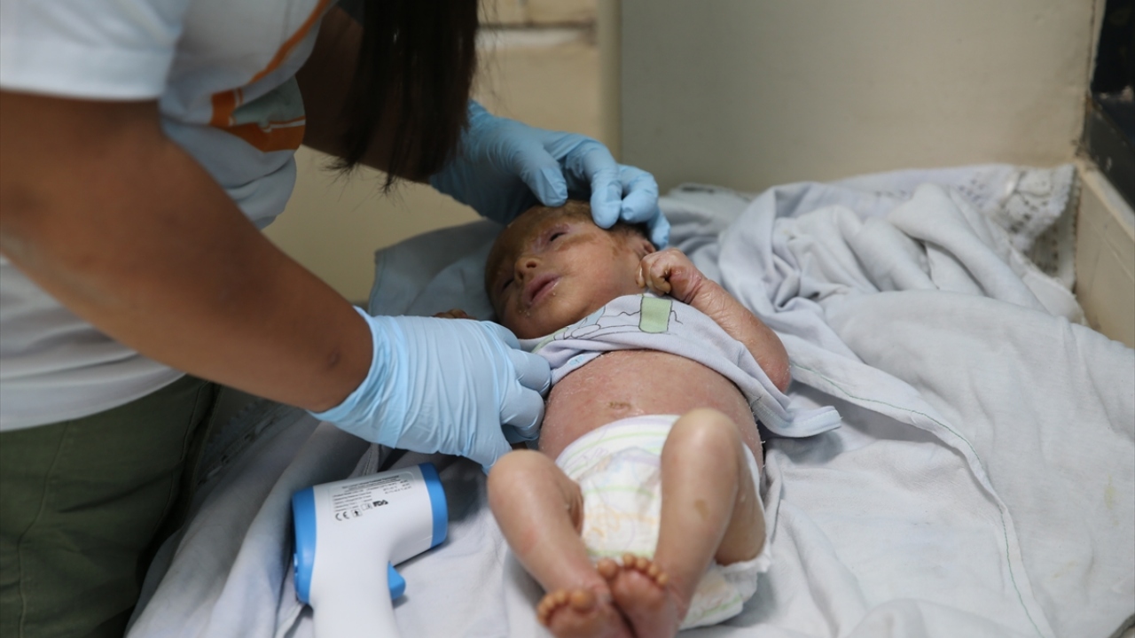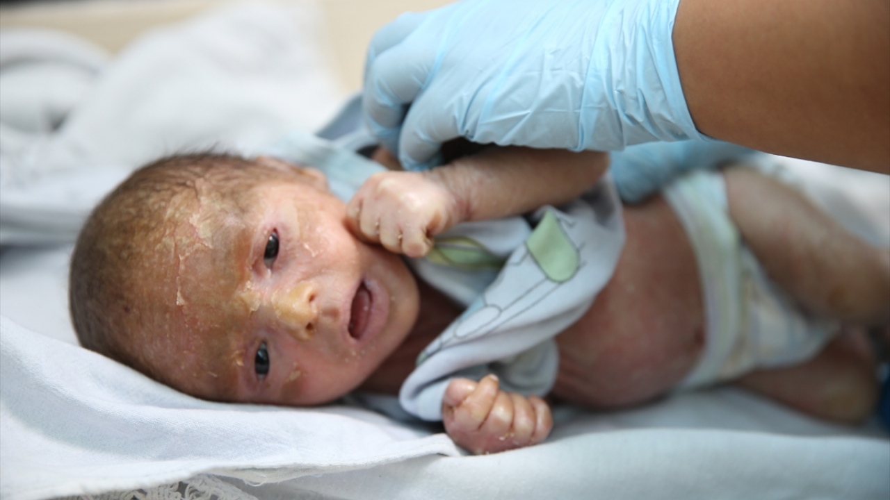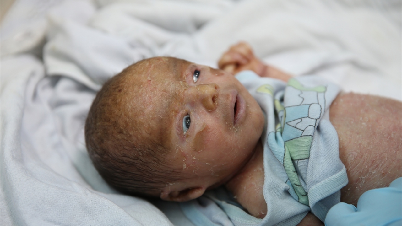 Suriye'nin İdlib kentindeki Sermin beldesinde balık pulu (iktiyozis vulgaris) hastası olan 18 günlük Mutaz, İçişleri Bakanı Süleyman Soylu'nun talimatıyla tedavisi için Türkiye'ye getirildi.