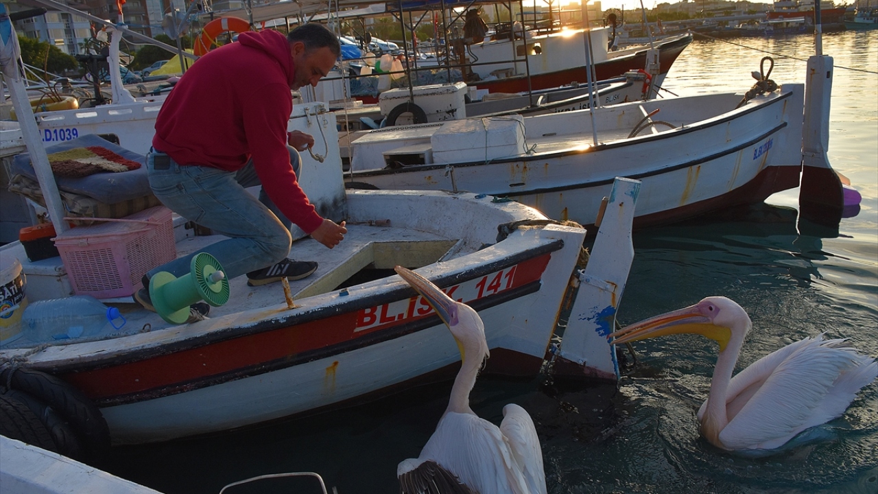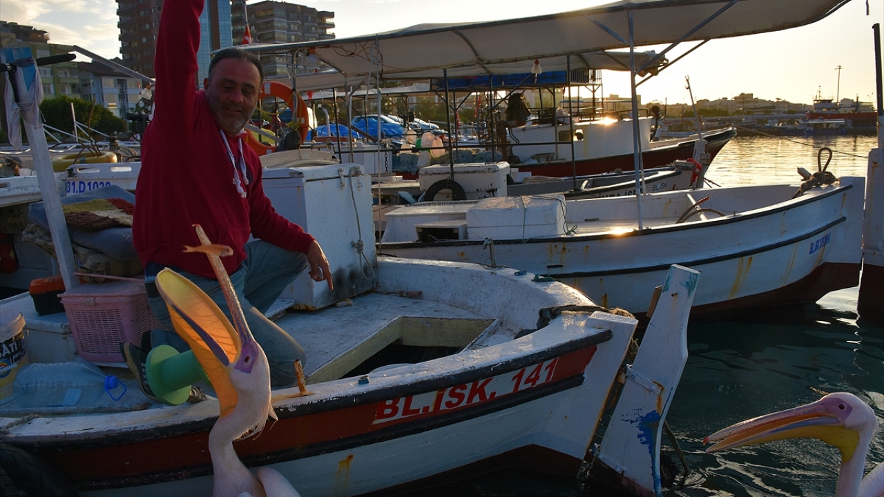 "Pelikanlar buranın artık yerlisi sayılır. Balıkçı arkadaşlarımız bu ikisini denizde yaralı olarak bulup buraya getirdiler. Burada biz besliyoruz. Denizden geldiğimiz zaman balıklarını biz veriyoruz. Artık ailemizden biri oldular. İkisi beraberler, birbirlerini bırakmıyorlar."