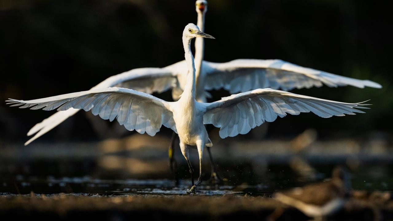 Günün ilk ışıklarıyla bataklık alanlarda sürüler halinde toplanan farklı türler, azalan sularda avlarını kolaylıkla yakalıyor.