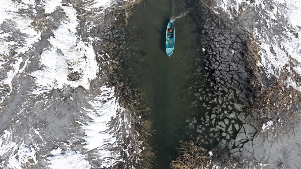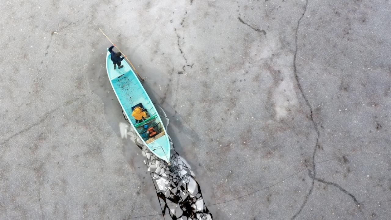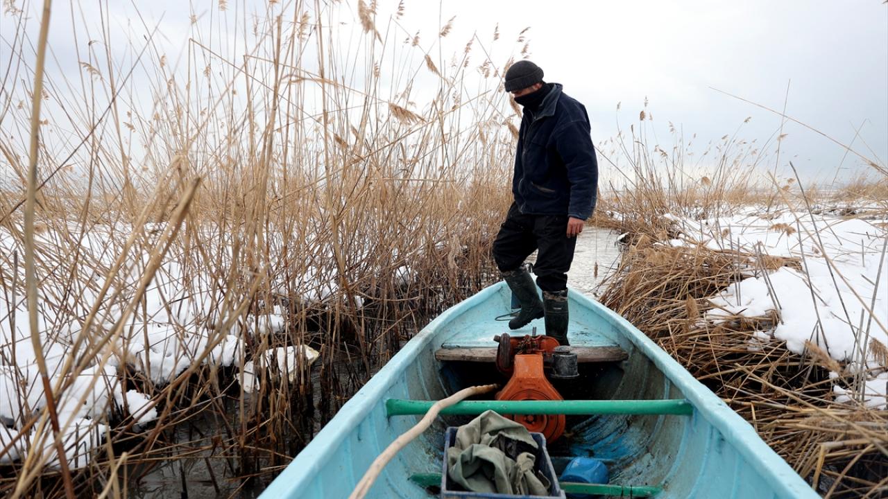 Ağır şartlarda avlanmanın çilesini fazlasıyla hisseden balıkçılar, erken saatlerde açıldıkları yüzeyi buzla kaplı gölde teknelerini güçlükle ilerleterek geç saatlere kadar mesailerini sürdürüyor.