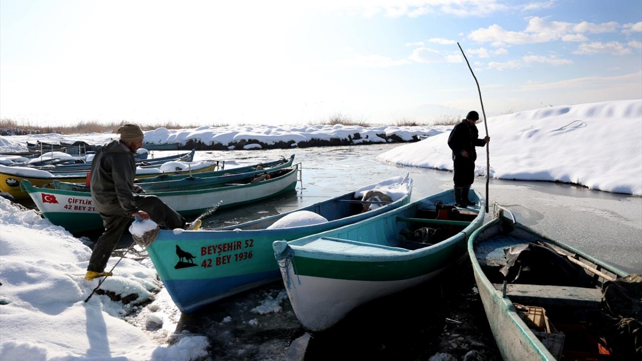 Türkiye'nin en büyük tatlı su kaynağı Beyşehir Gölü'ne kıyısı olan mahallelerde geçimini balıkçılıkla sağlayanlar, dondurucu soğuğa rağmen buz kırarak ekmek mücadelesi veriyor.