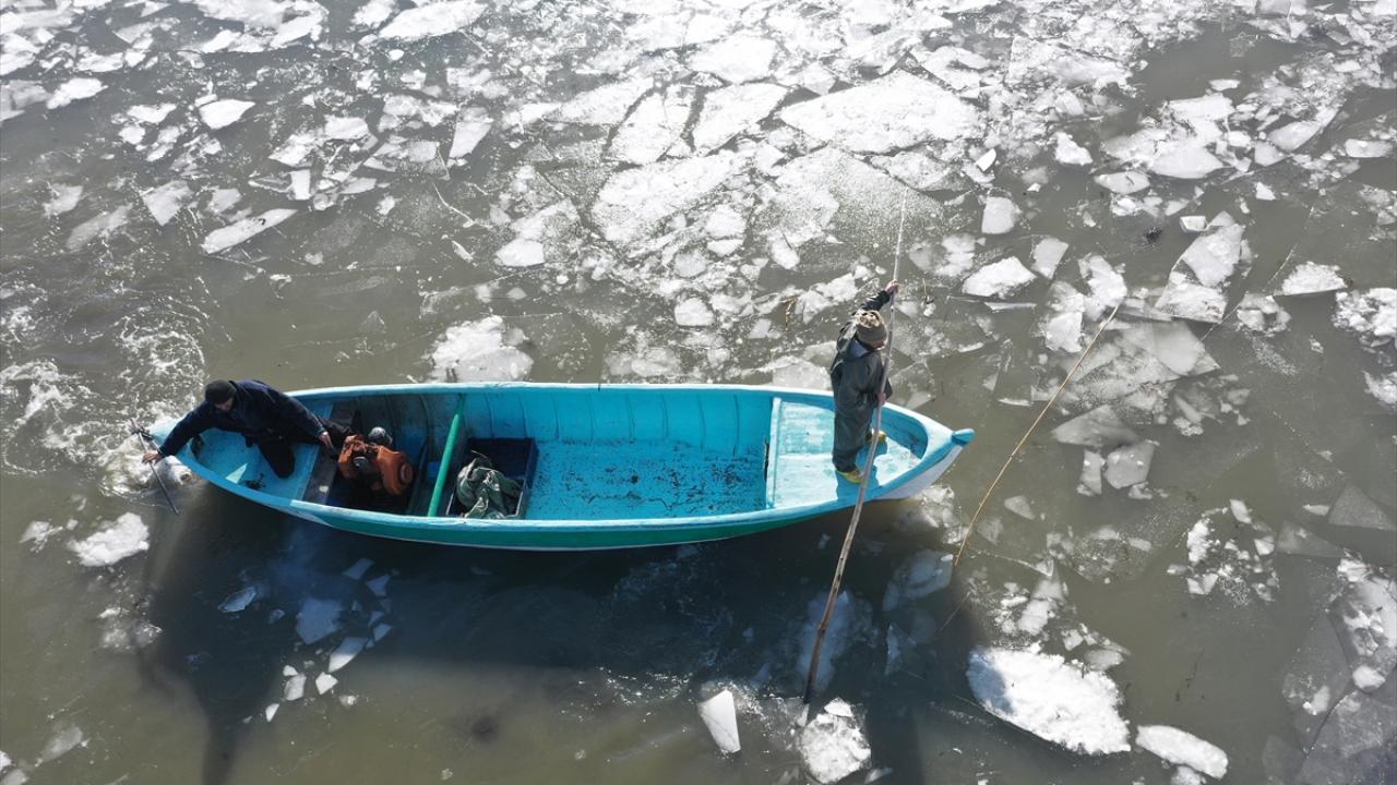 Balıkçılar, yer yer 20-30 santimetre kalınlığındaki buzları ellerindeki sopalarla, ayaklarıyla veya baltalarla kırarak ilerliyor.