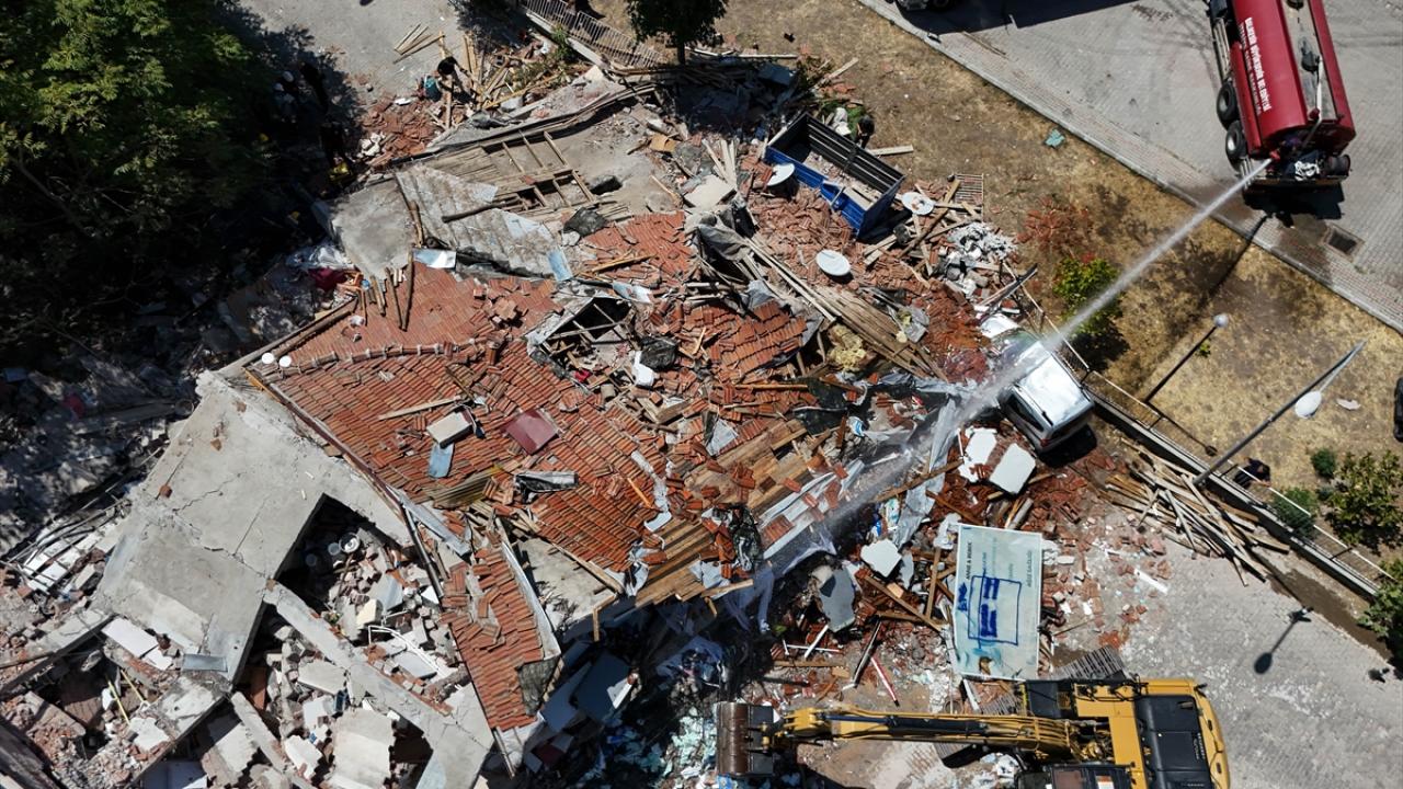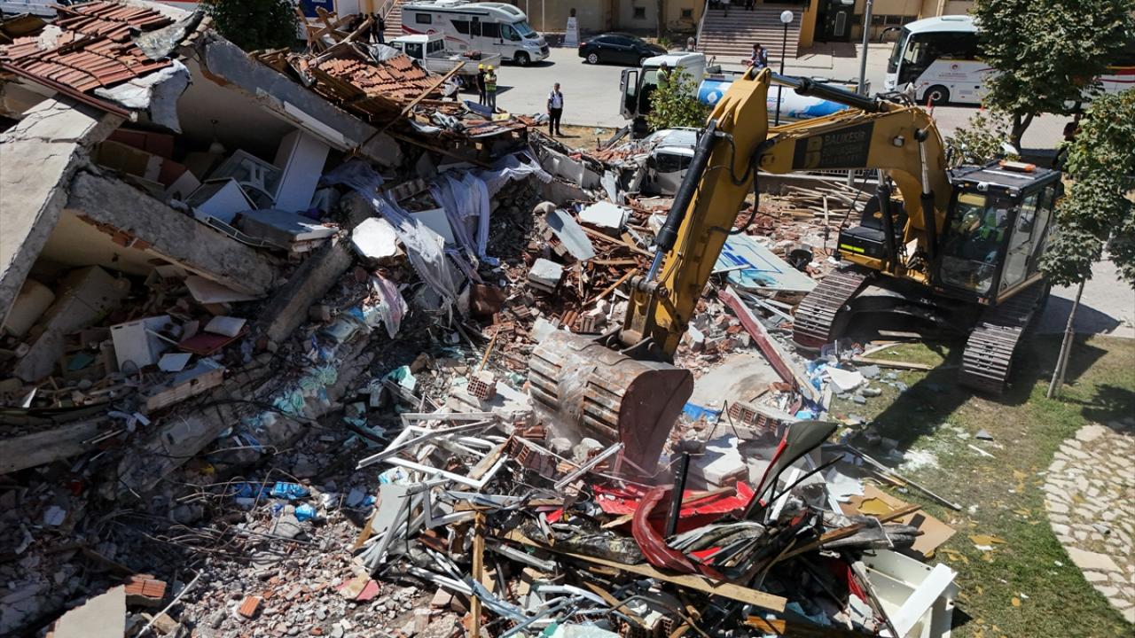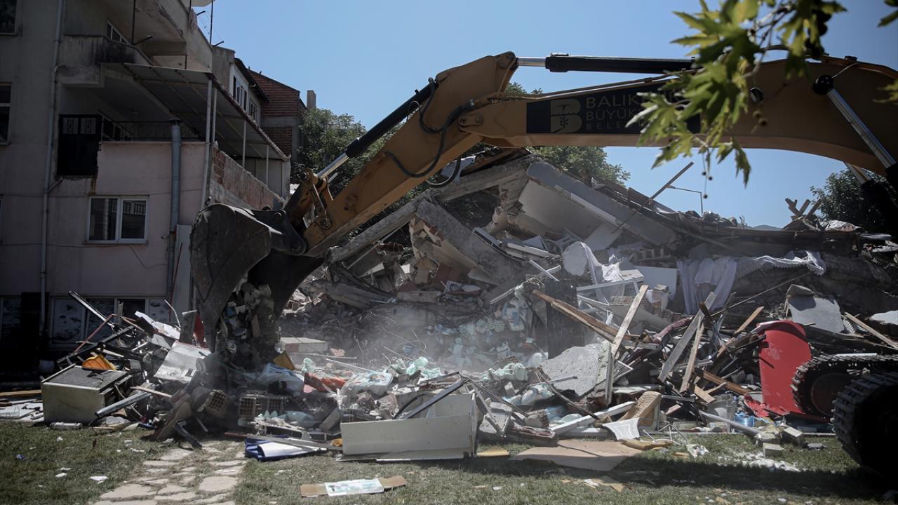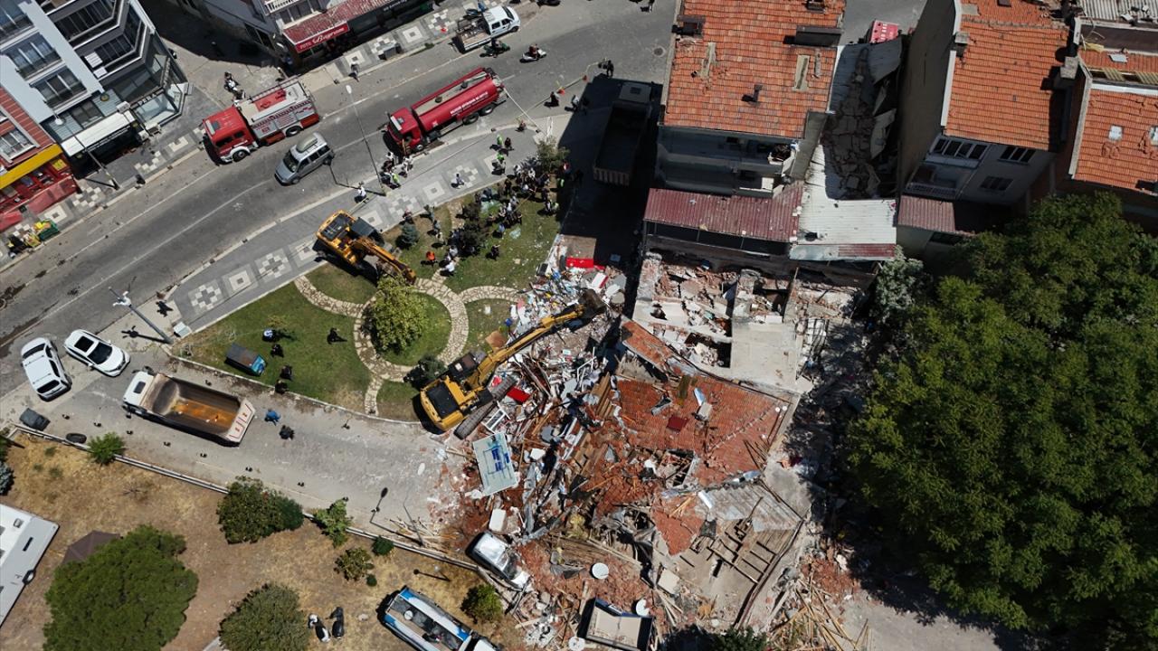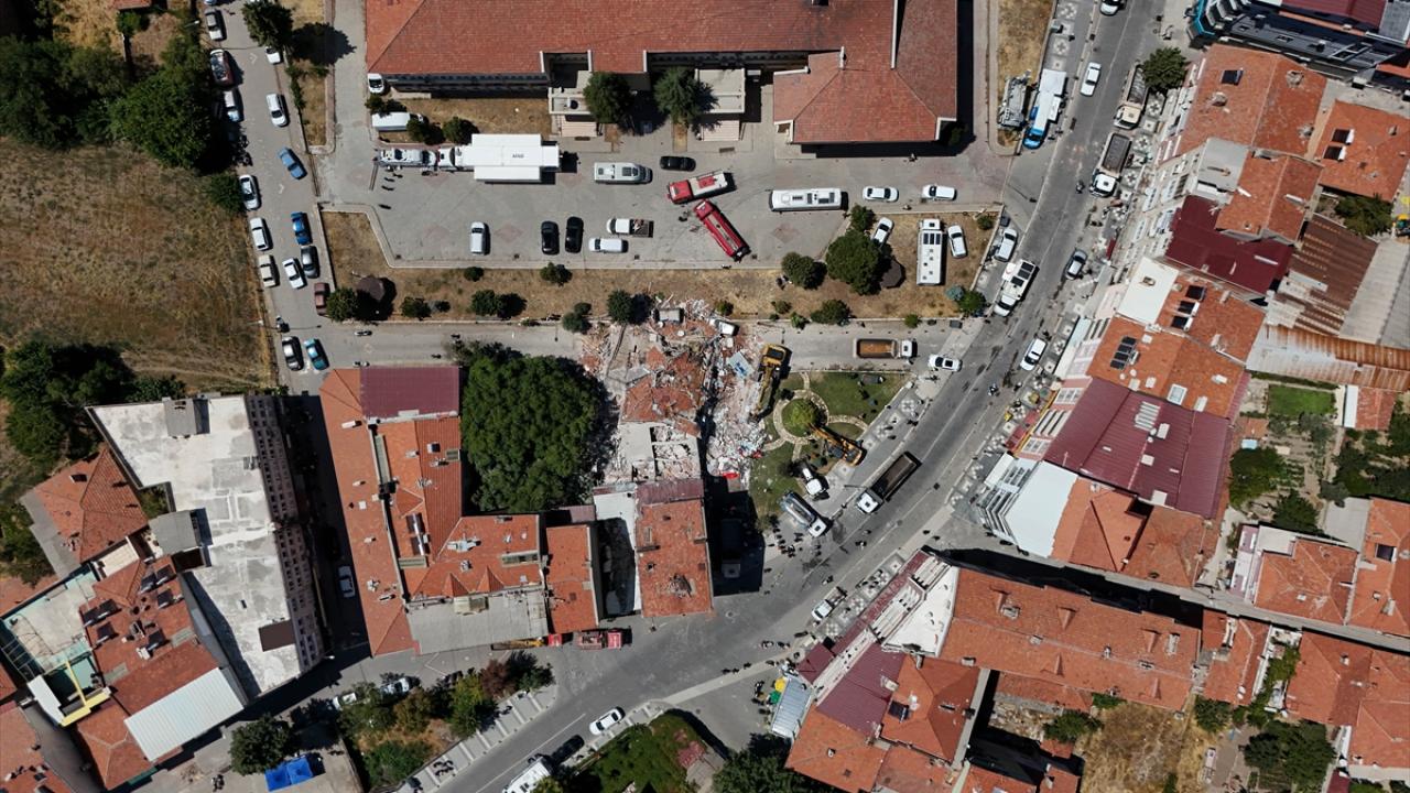 Ekipler, binanın enkazından çıkan molozları iş makineleriyle kamyonlara yüklendi. Bölgedeki enkaz kaldırma çalışmaları dronla görüntülendi.