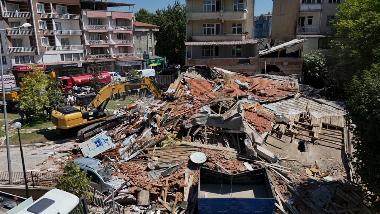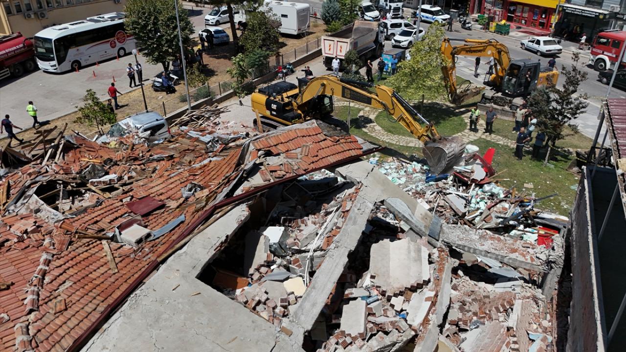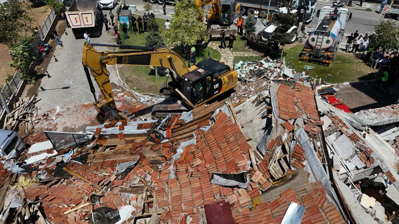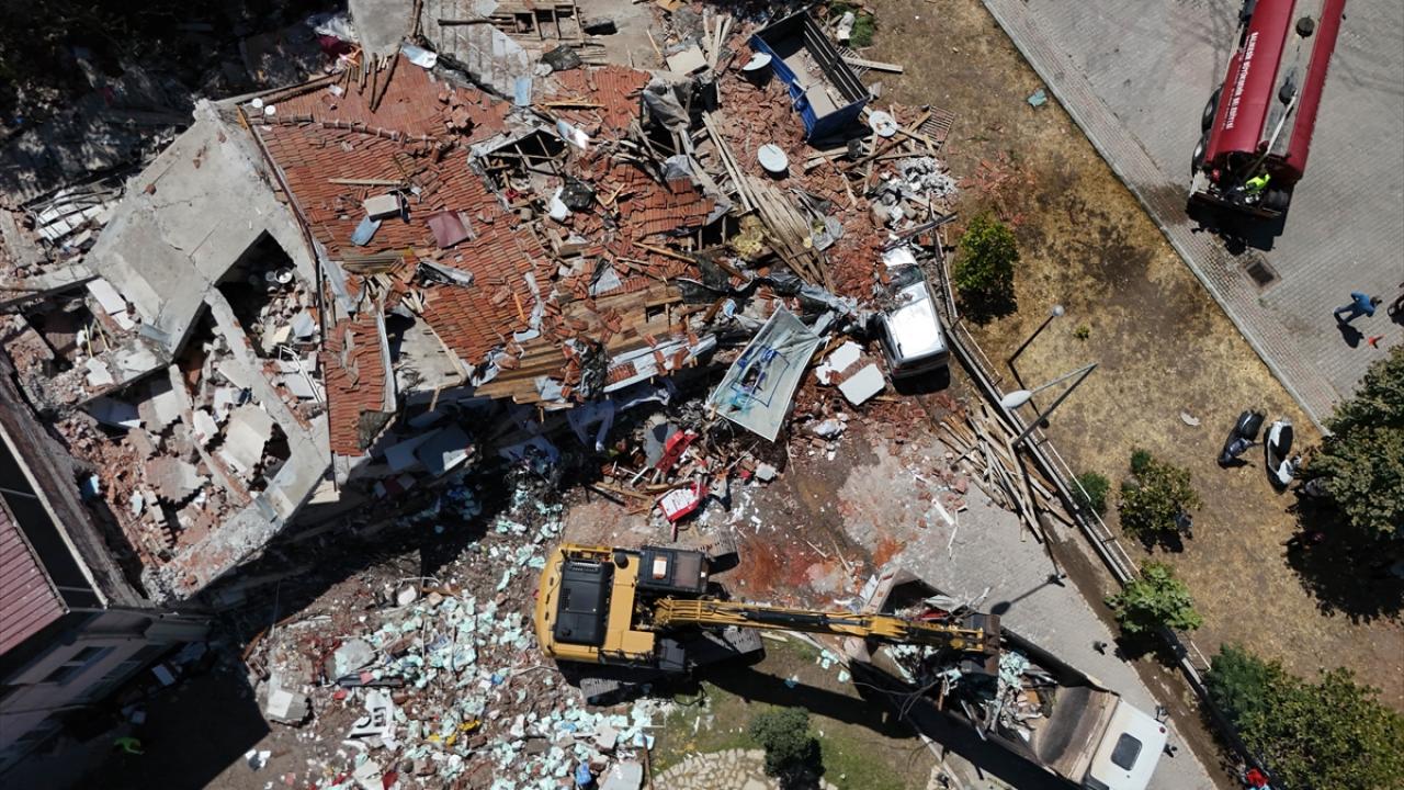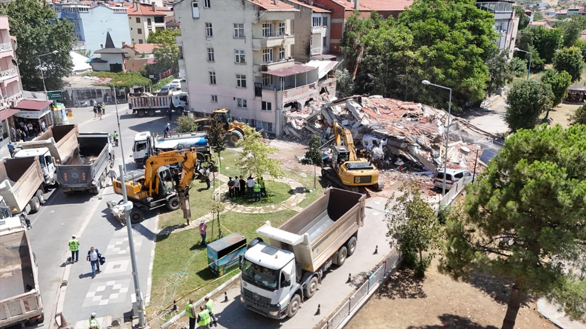 Ekipler, binanın enkazından çıkan molozları iş makineleriyle kamyonlara yüklendi. Bölgedeki enkaz kaldırma çalışmaları dronla görüntülendi.