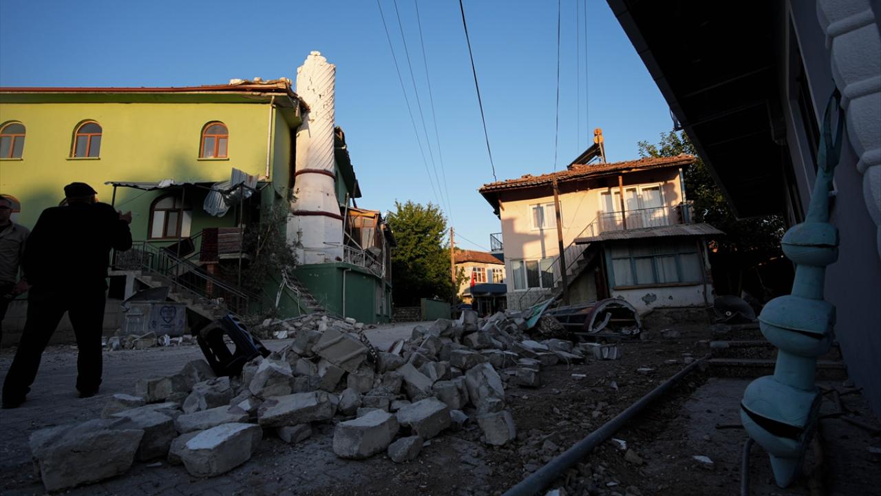 AA ekibince, dronla görüntülenen caminin minaresindeki alem, külah, şerefe ve gövdenin sokağa devrildiği görüldü.
