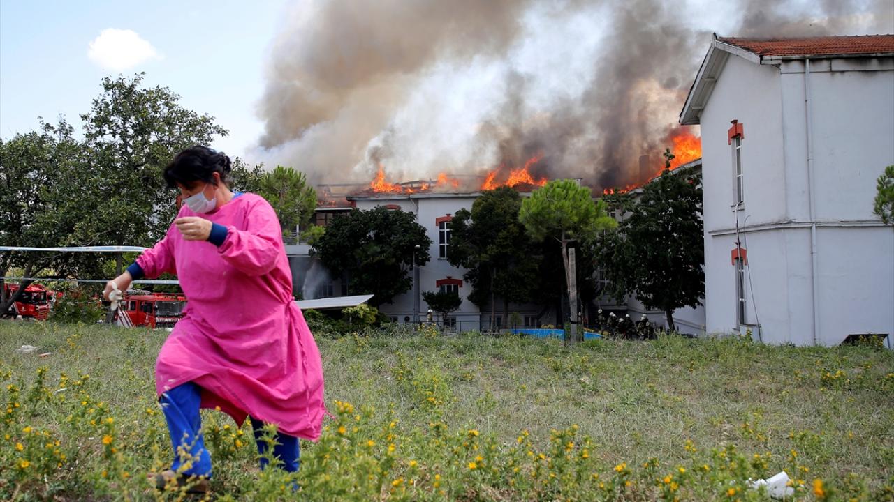 Alevlerin kısa sürede binanın tüm çatısını sardığı yangın devam ederken, hastane tahliye edildi.
