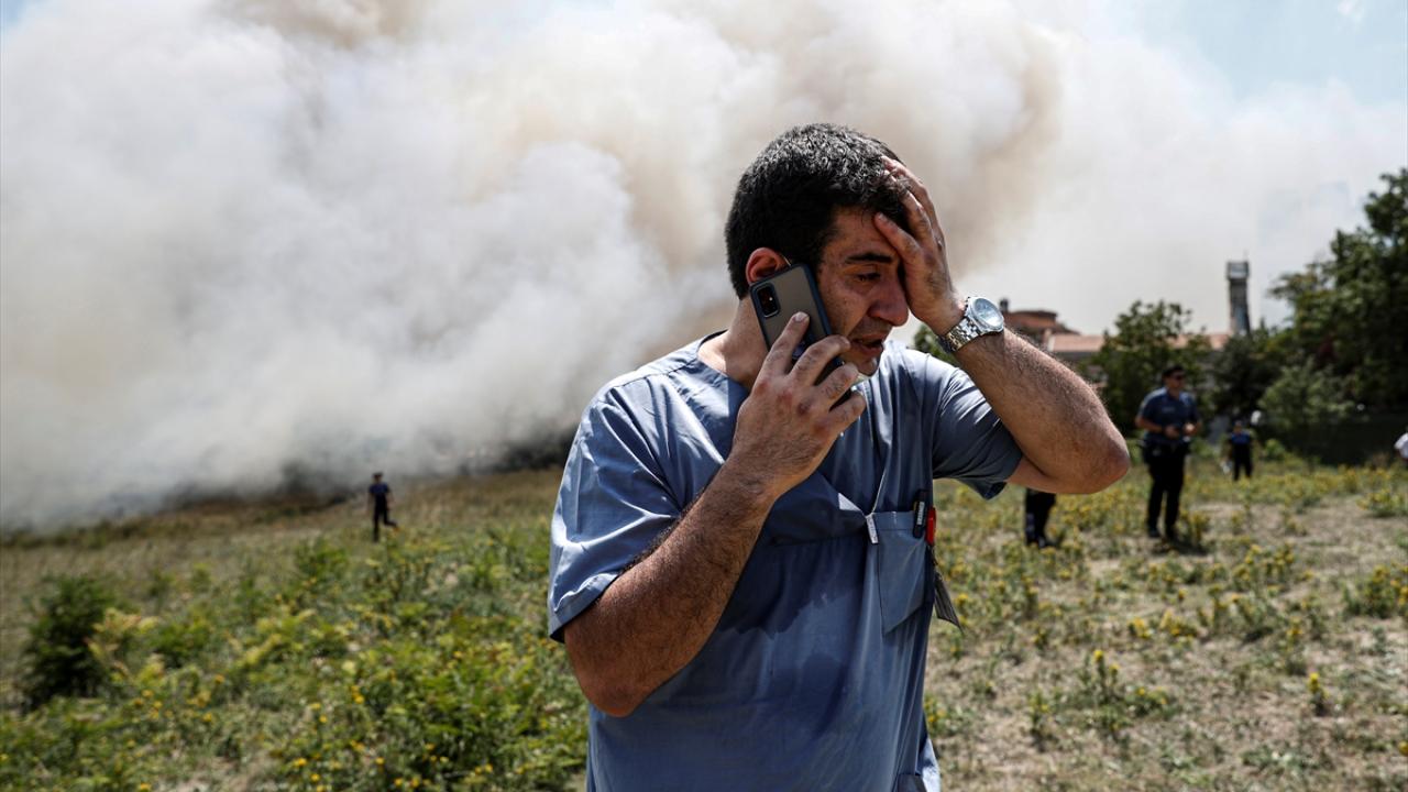 Polis bölgede geniş güvenlik önlemi alırken, yangın nedeniyle dumandan etkilenen vatandaşlara sağlık ekipleri müdahale etti.