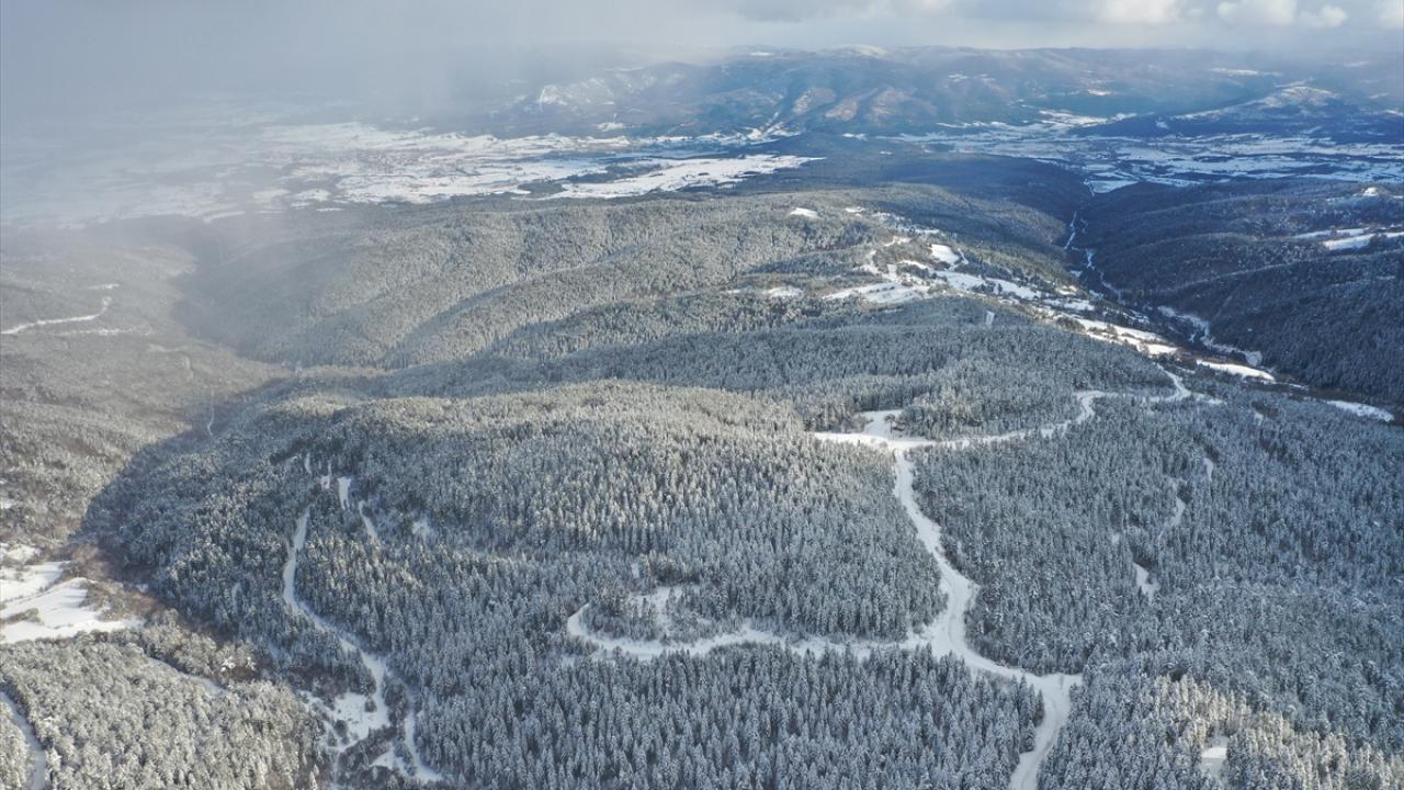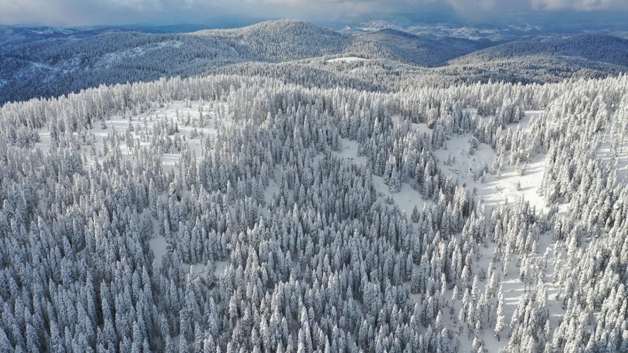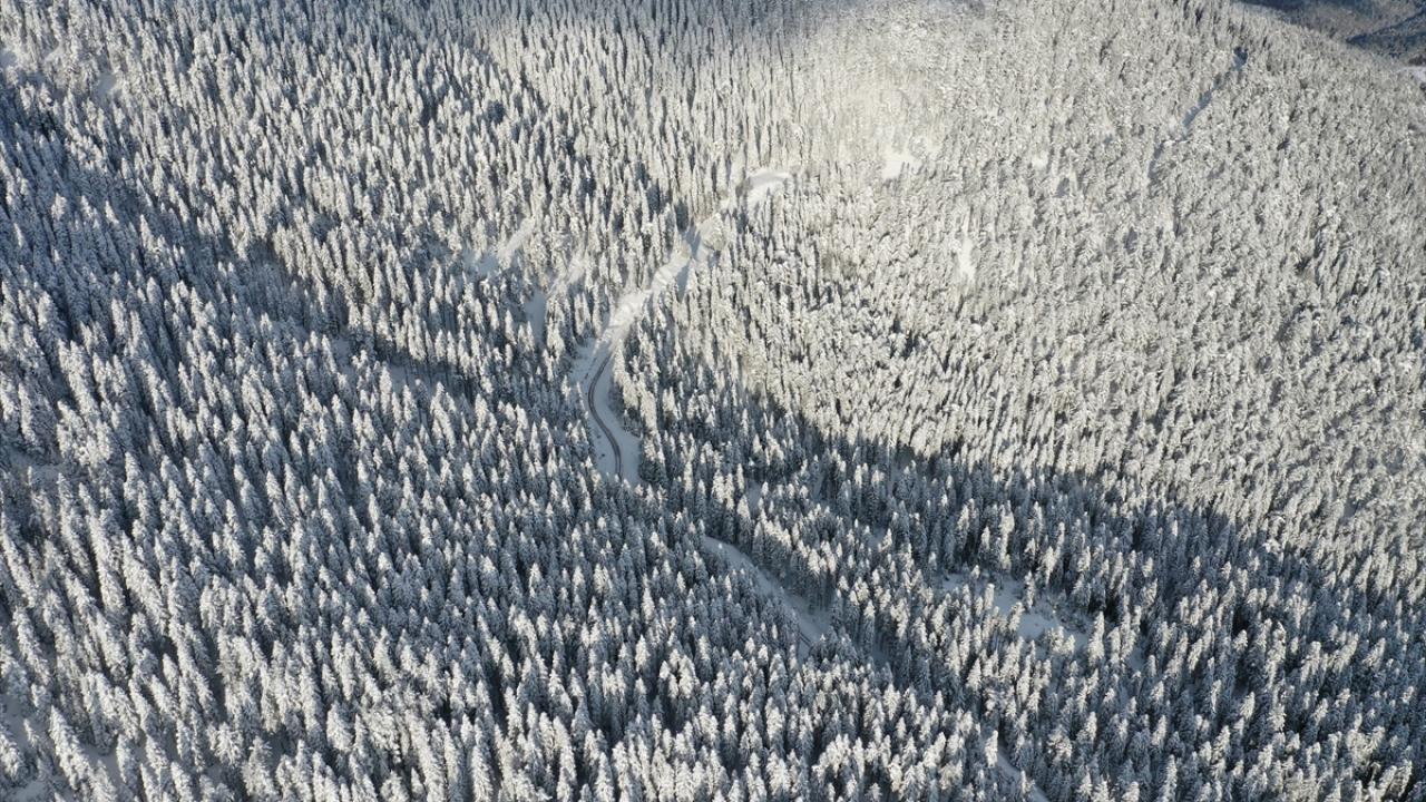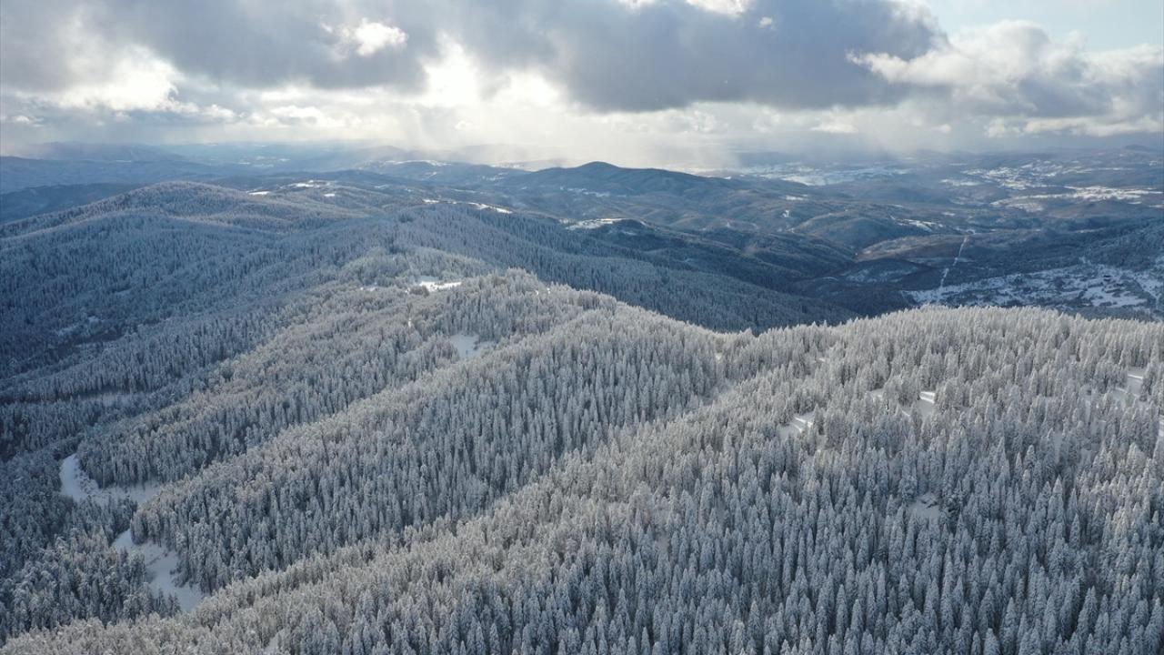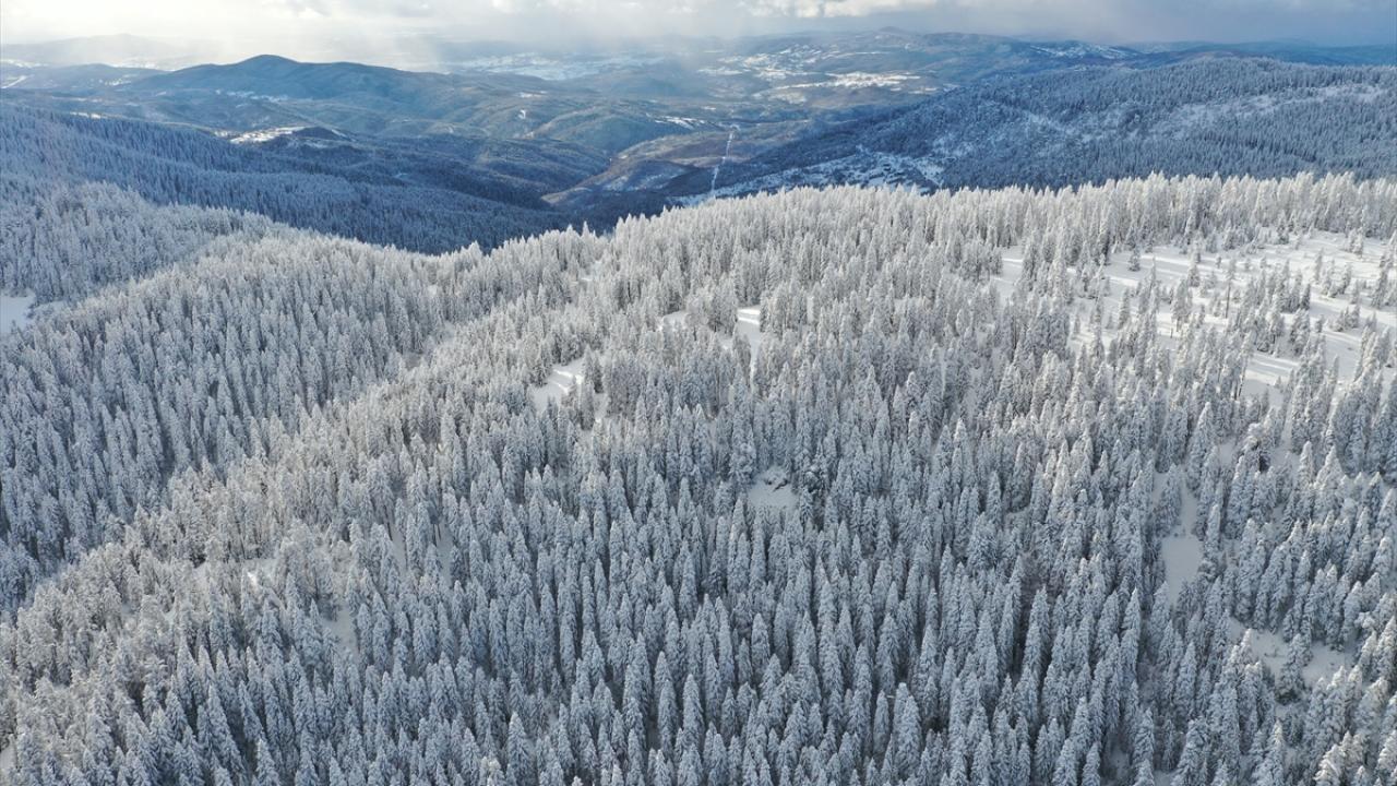 Kastamonu'nun Daday ilçesinde kar yağışının ardından beyaza bürünen çam ve meşe ağaçlarıyla kaplı Ballıdağ, dronla görüntülendi.