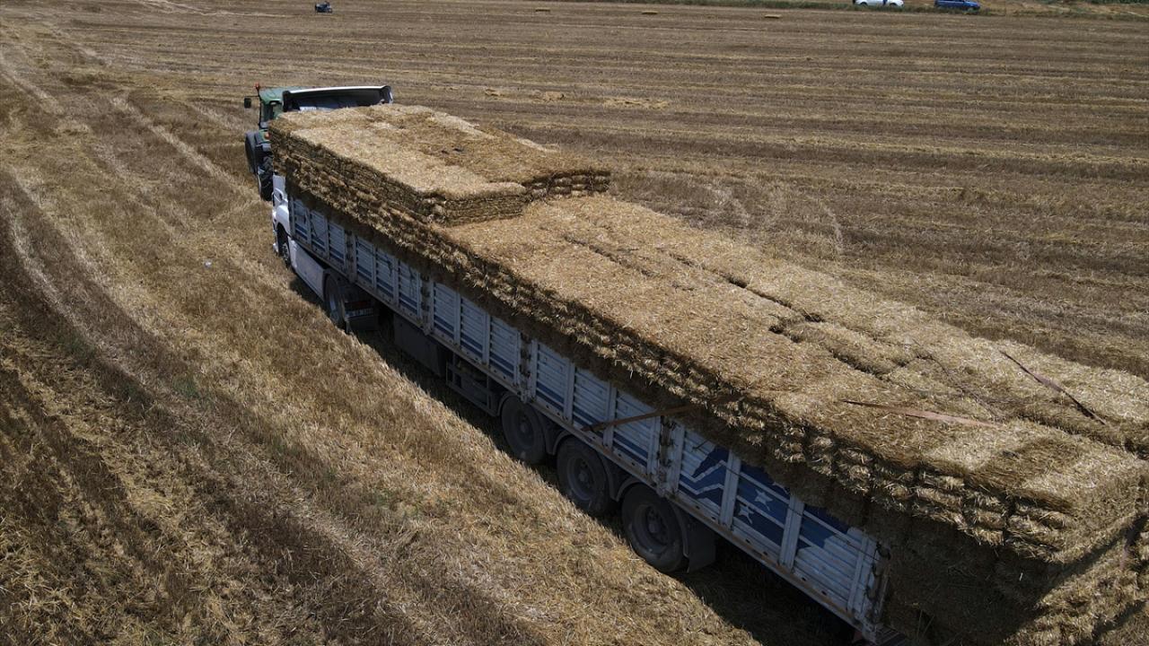 Saman balyaları daha sonra tarlalardan ahırlara götürülmek üzere bölgede "balyacılar" olarak adlandırılan sezonluk işçiler tarafından kamyonlara ve traktör römorklarına yükleniyor.