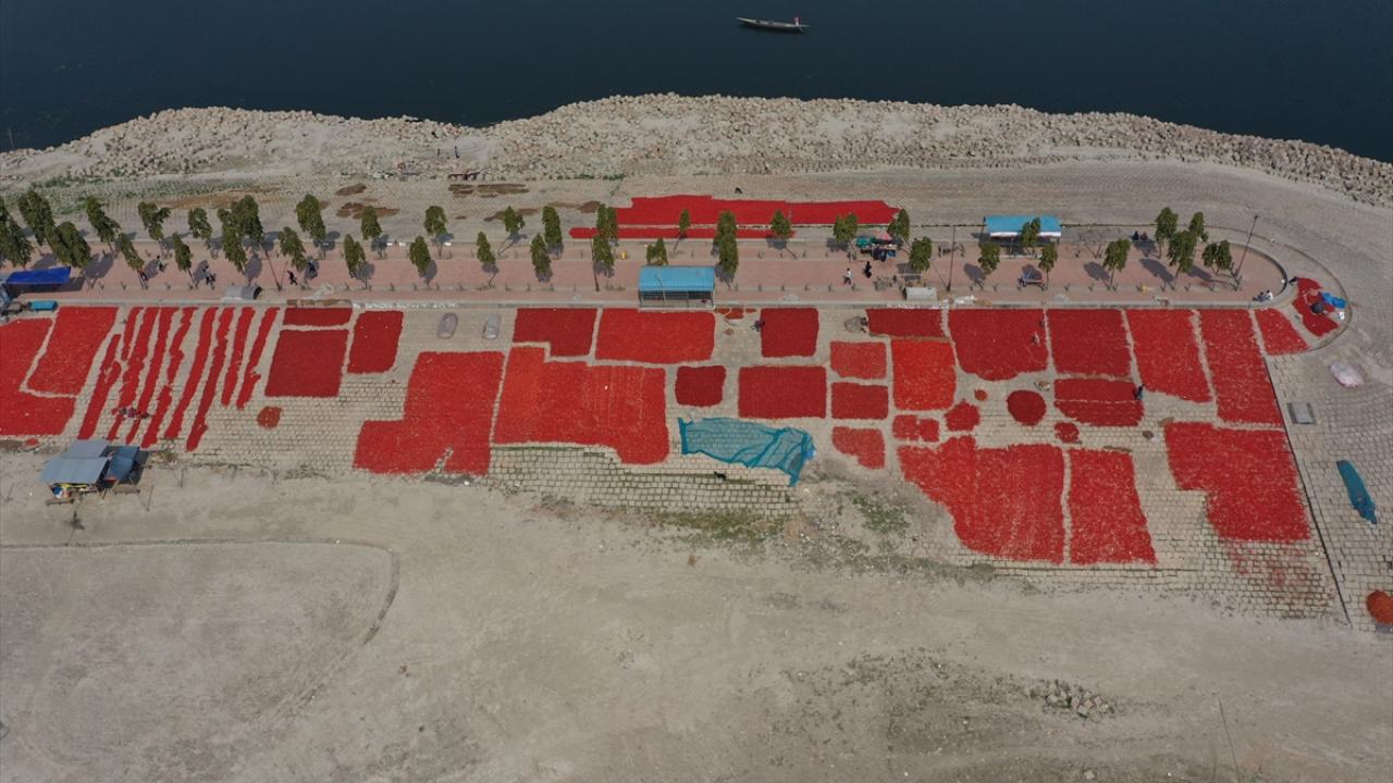 Kurumaya bırakılan biberler havadan görüntülendi.