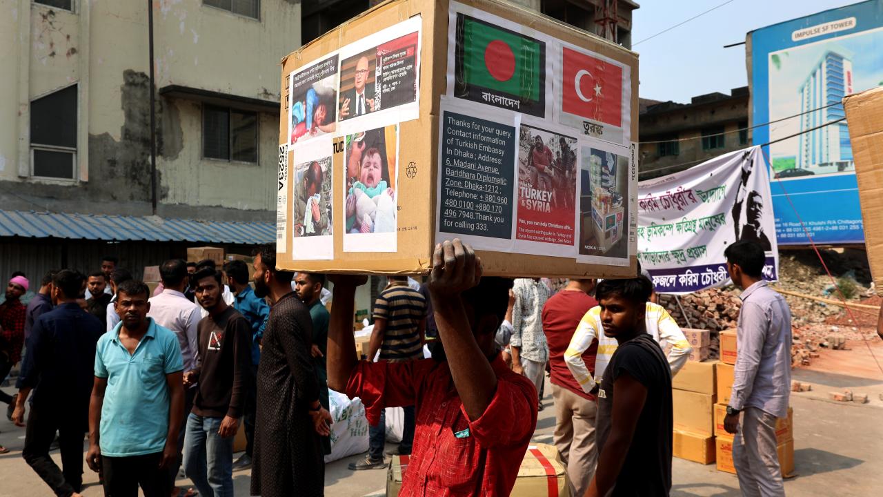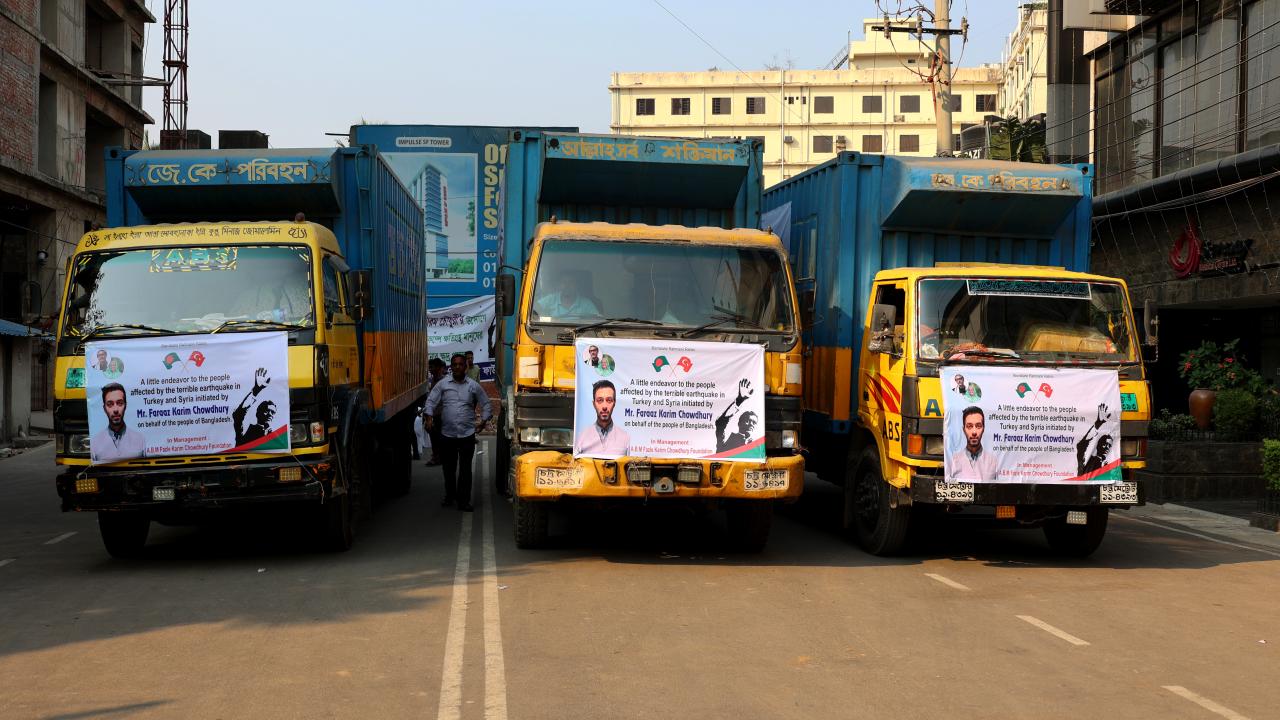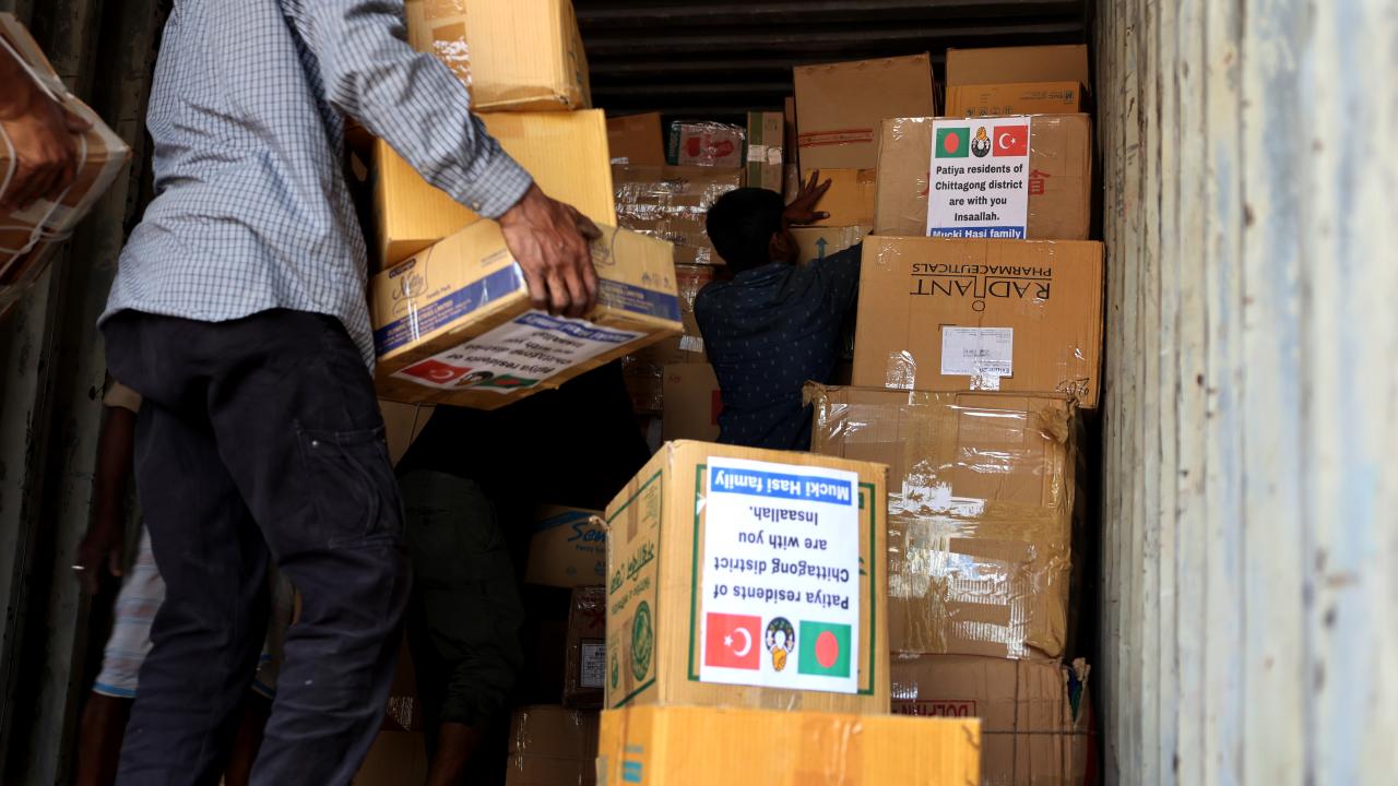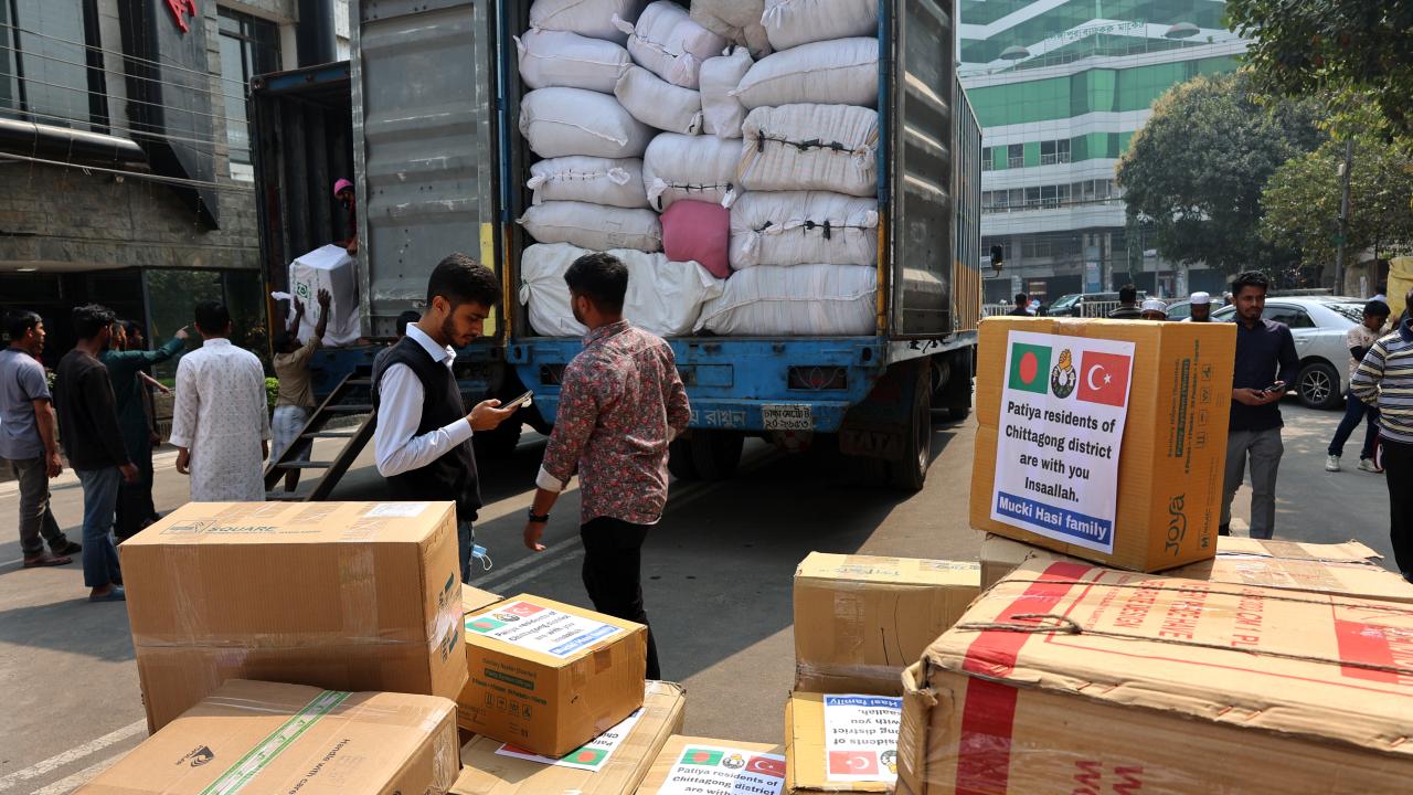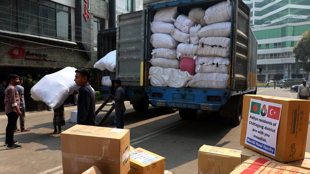 Bangladeş'in Çitagong kentinde, "asrın felaketi" olarak nitelendirilen Kahramanmaraş merkezli depremlerden etkilenen afetzedeler için insani yardım toplandı. Yardım gönüllüleri toplanan yardımları kamyonlara yükledi.