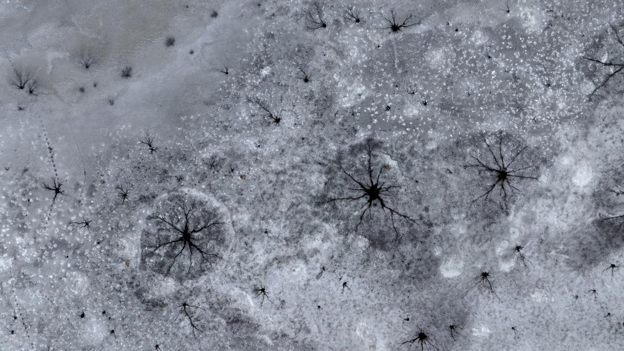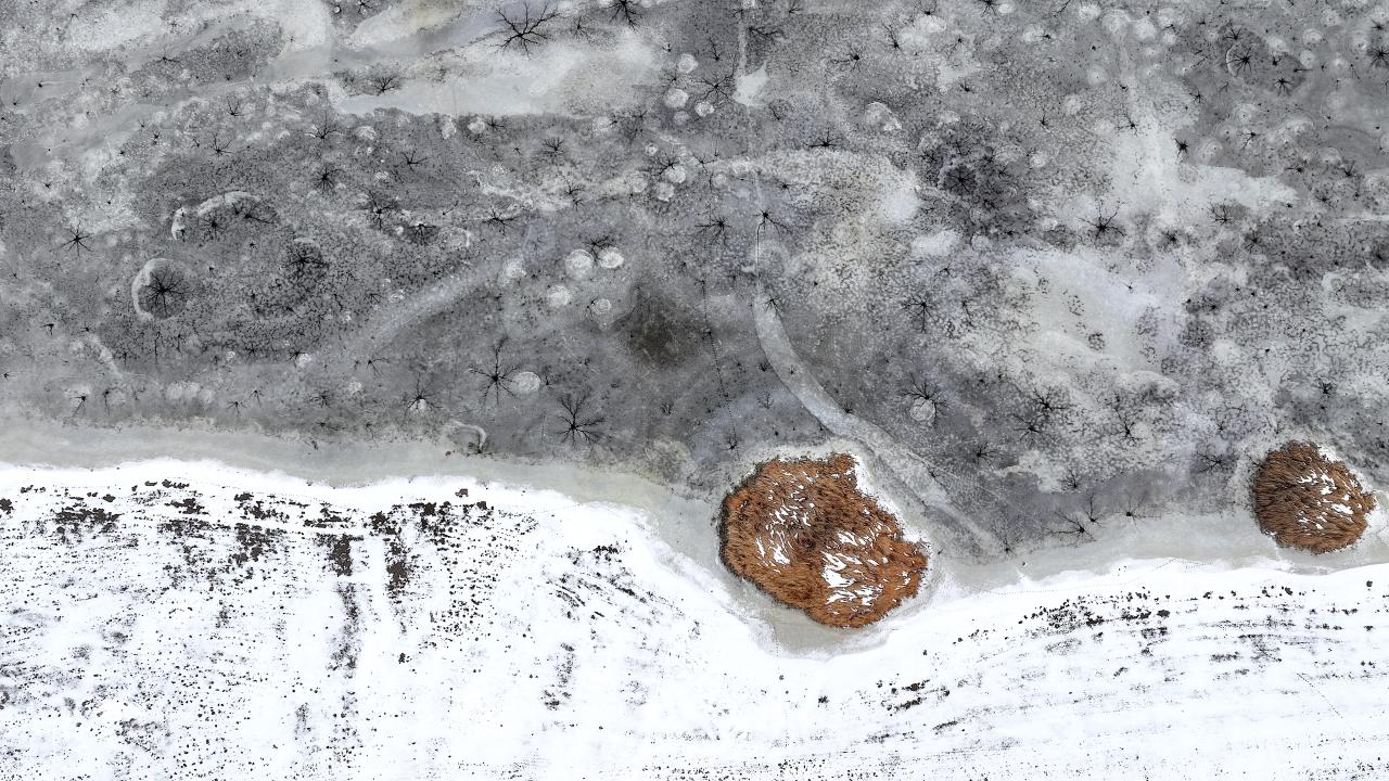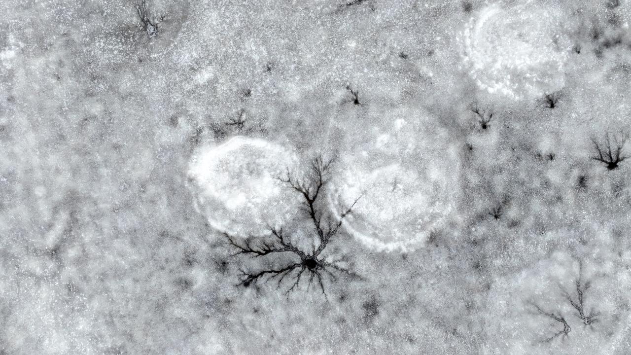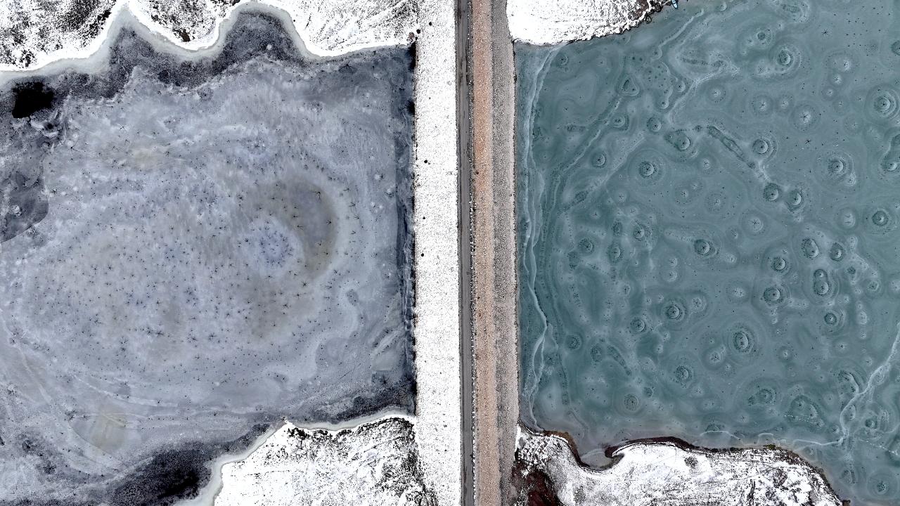 Kayseri'nin Develi ilçesindeki Gümüşören Barajı'nda, soğuk havanın etkisiyle oluşan ve göz bebeklerine benzeyen buz oluşumları dronla görüntülendi.