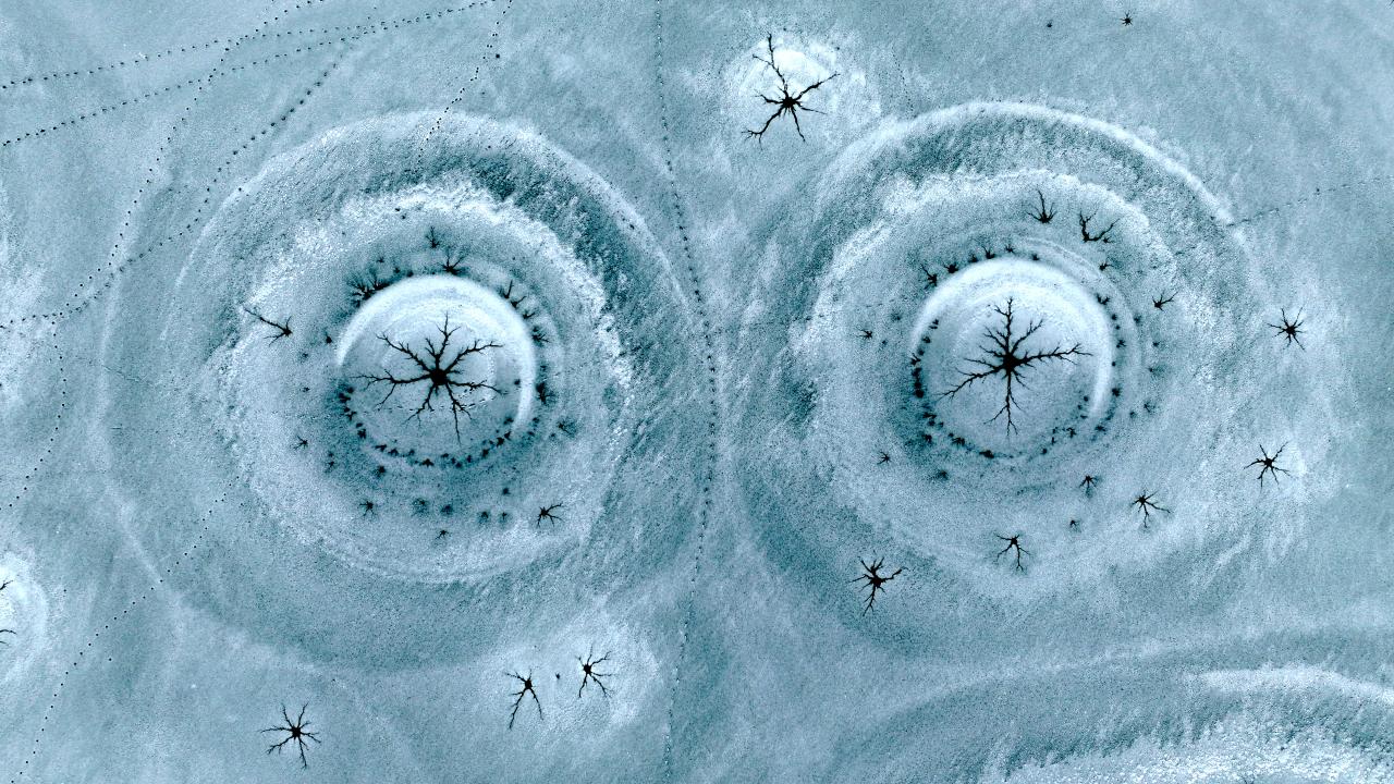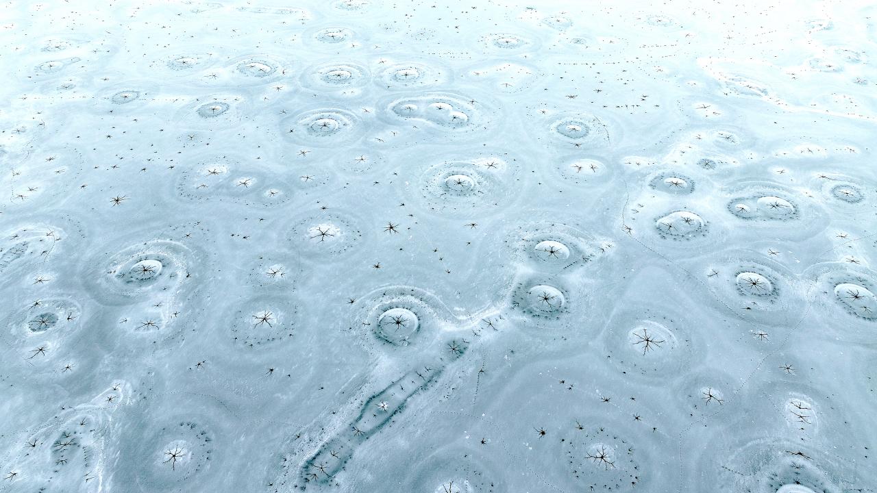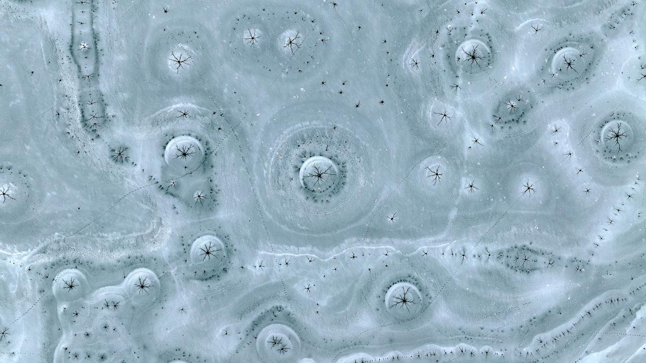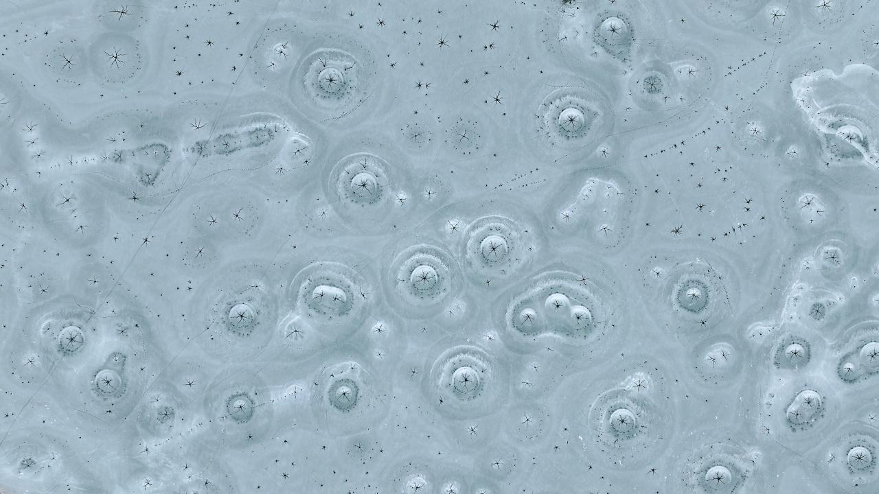 Beyaz ve açık mavi tonların hakim olduğu buz tabakası, havadan bakıldığında insan gözünün iris ve göz bebeğini çağrıştıran doğal desenler oluşturdu.