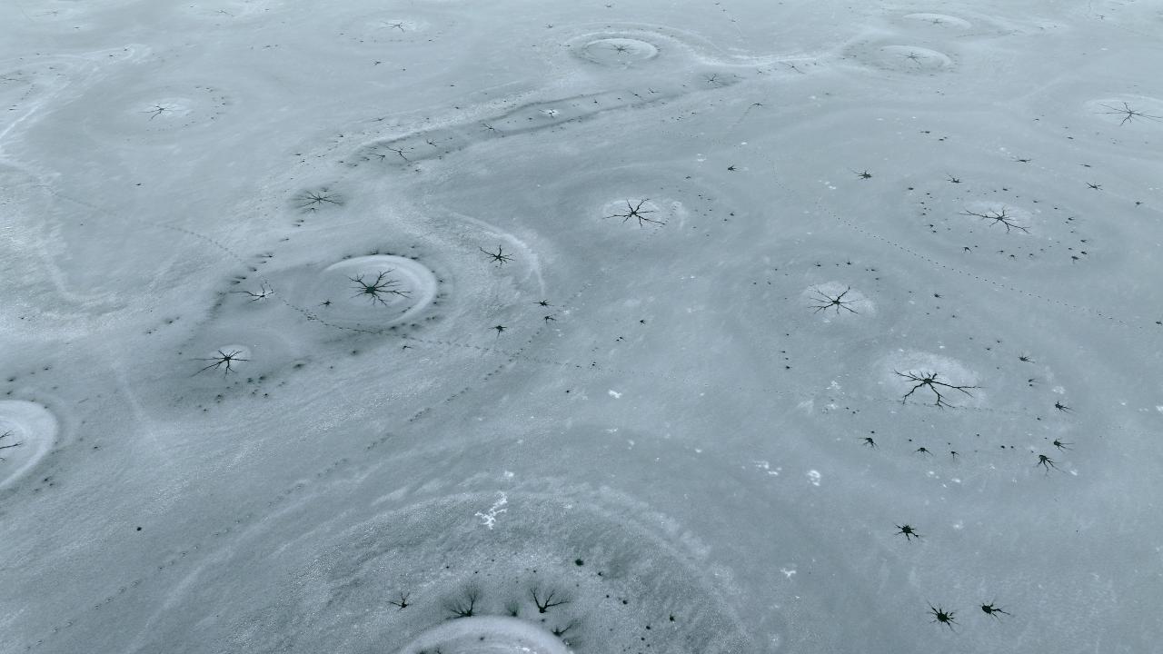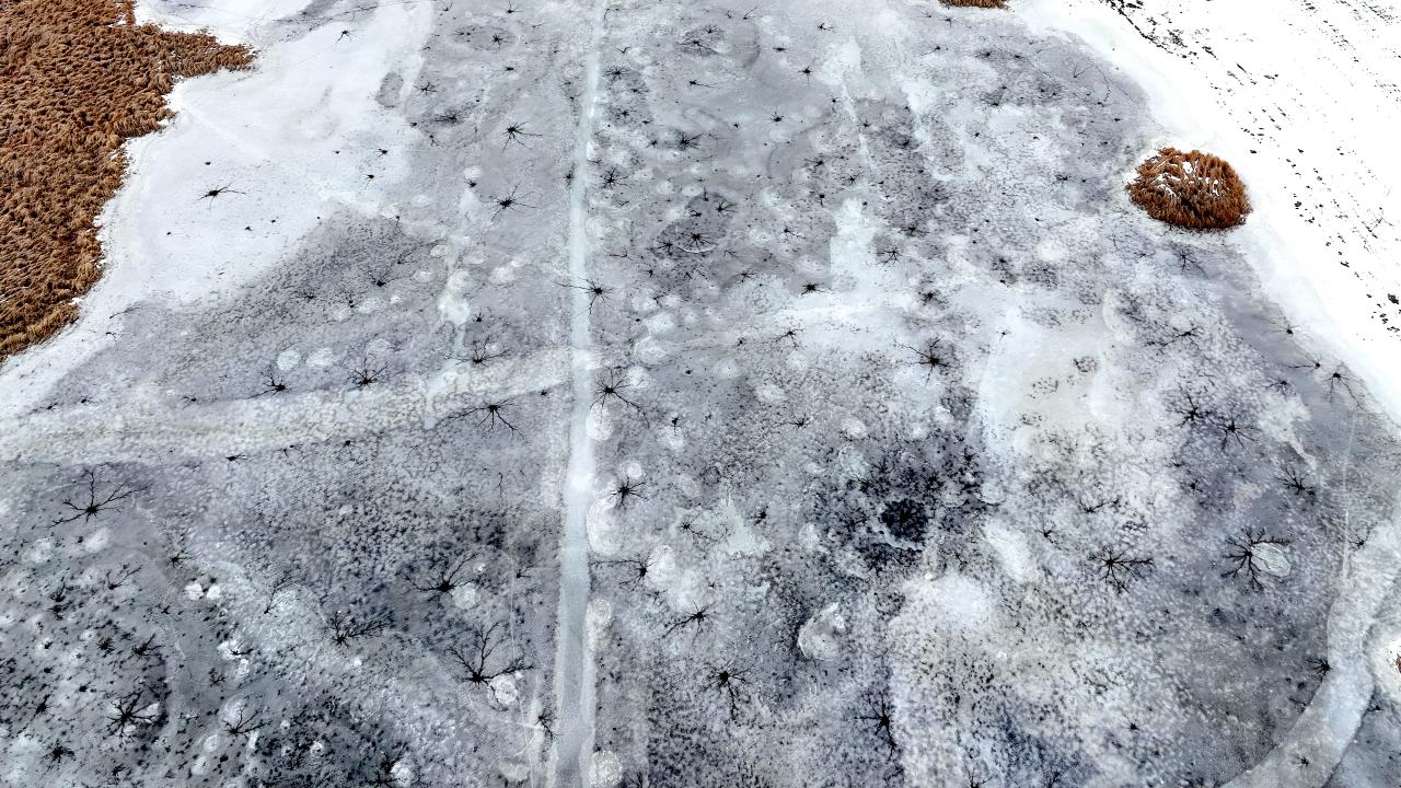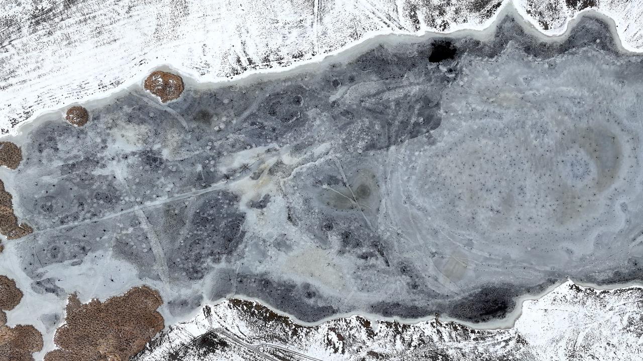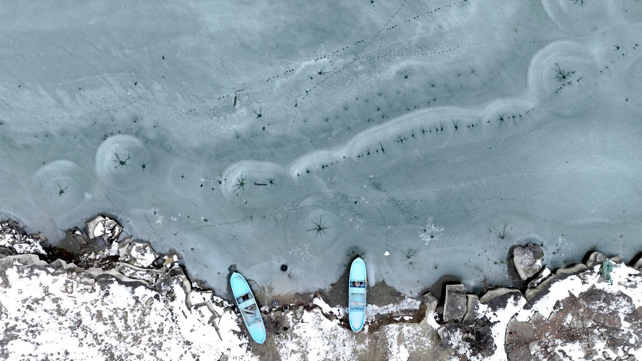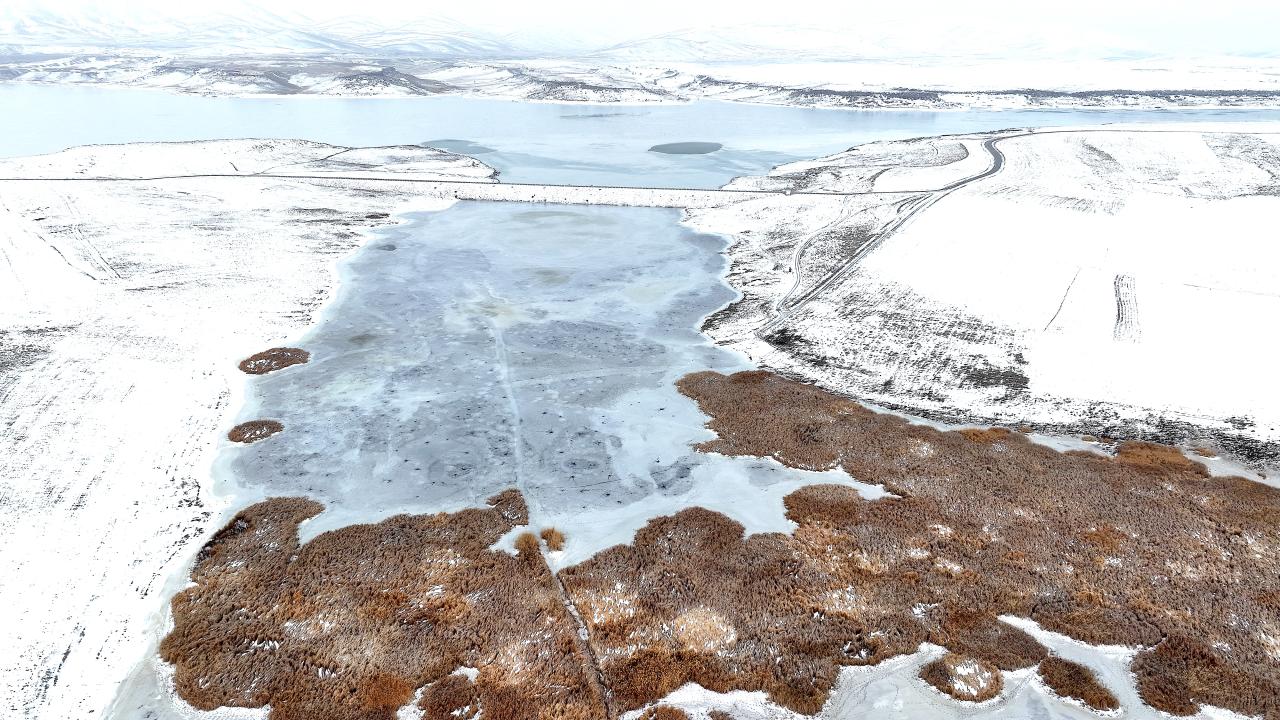 Dronla kaydedilen görüntülerde, göl yüzeyinde oluşan halka şeklindeki buz yapıları ve merkezlerinden yayılan çatlaklar dikkati çekti.