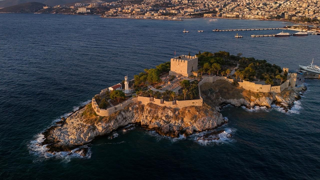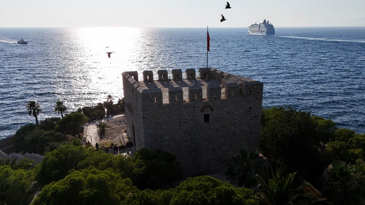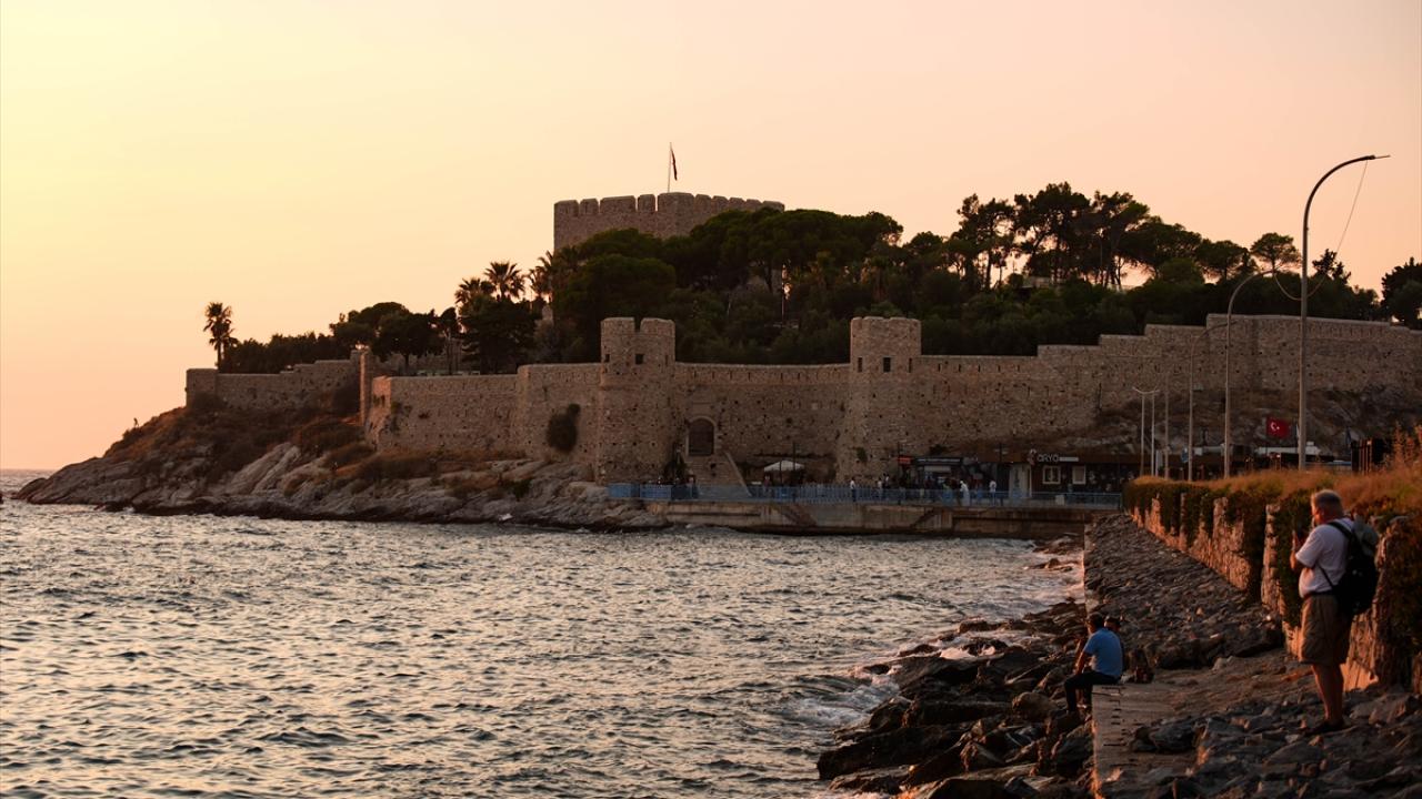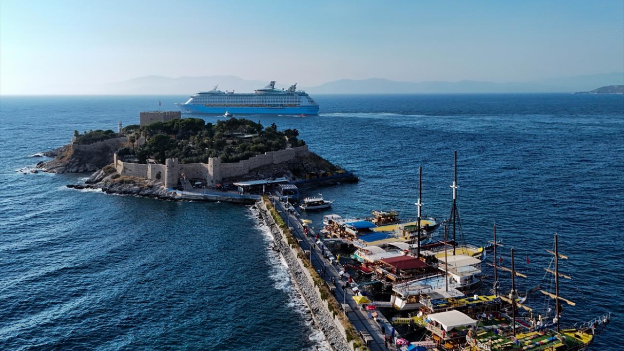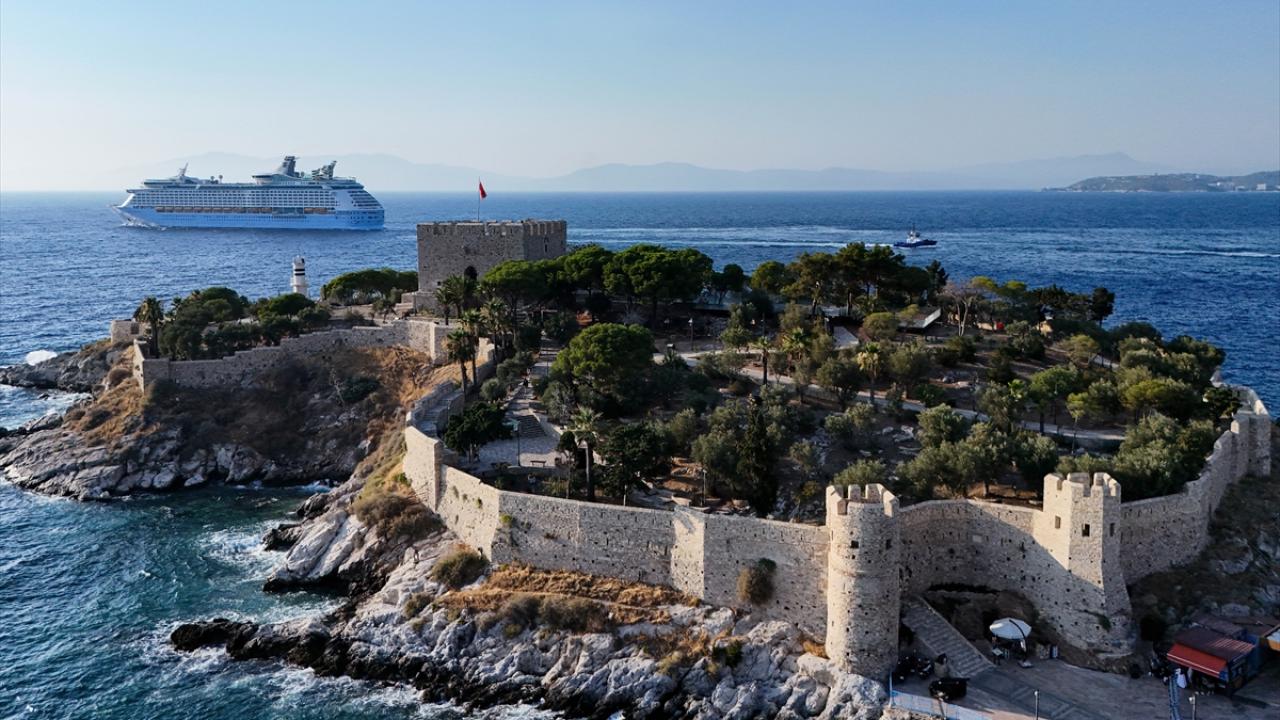 Ege'nin önemli turizm merkezlerinden Aydın'ın Kuşadası ilçesinde, limana yakın konumda bulunan Güvercinada Kalesi, limana yanaşan dev yolcu gemilerindeki turistleri karşılıyor.