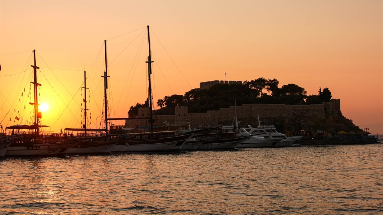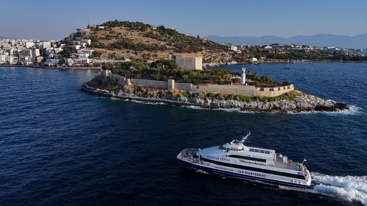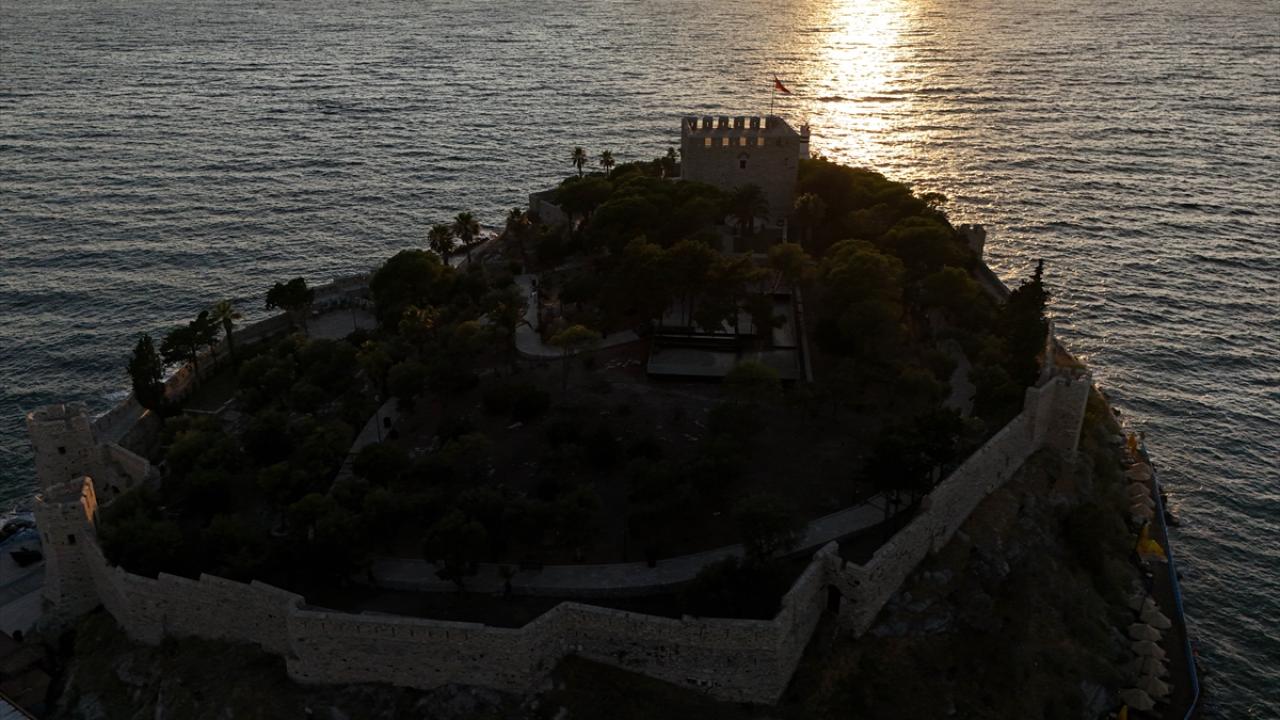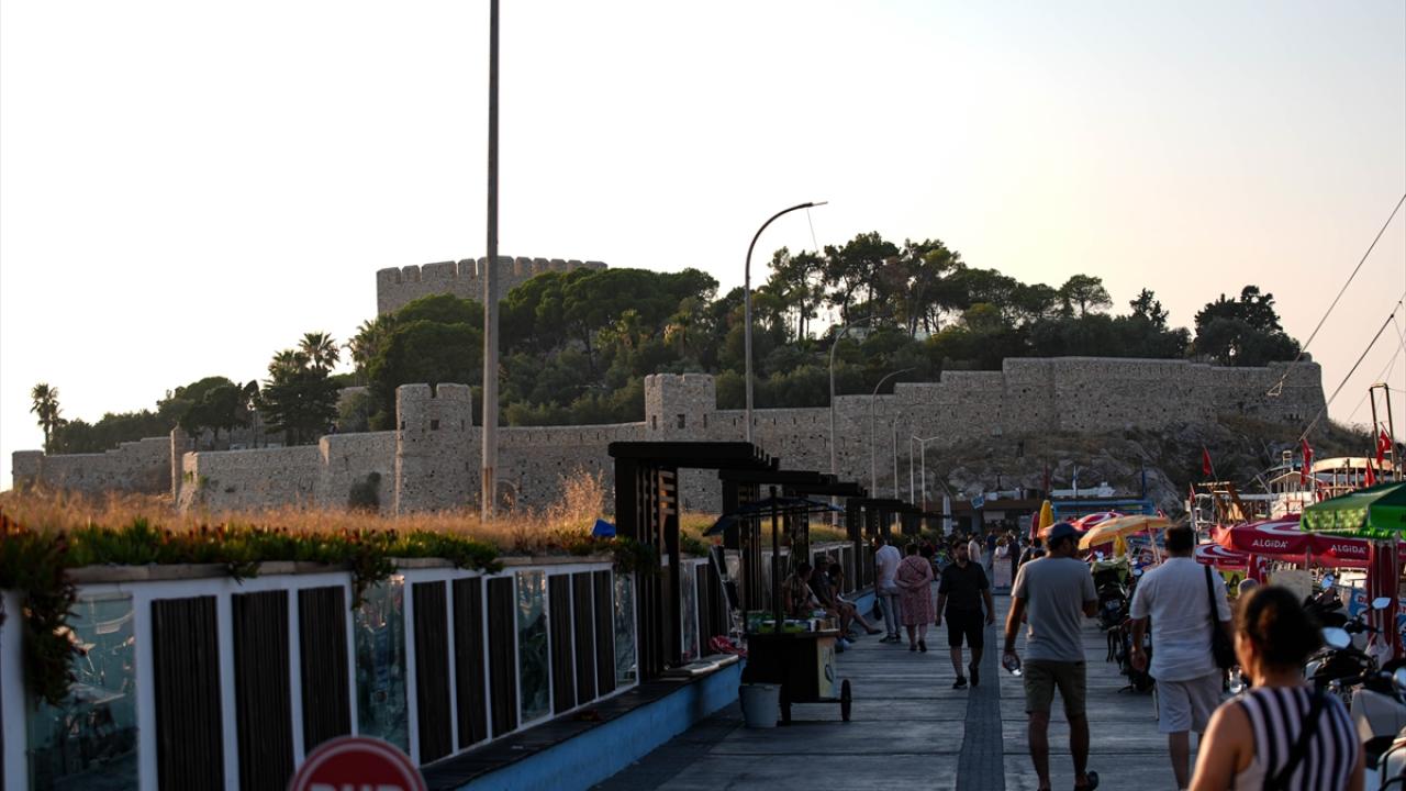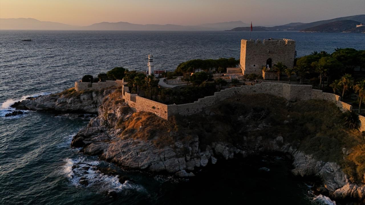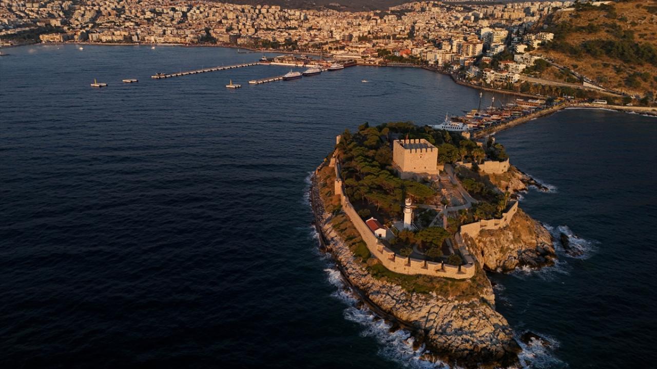 Ege'nin önemli turizm merkezlerinden Aydın'ın Kuşadası ilçesinde, limana yakın konumda bulunan Güvercinada Kalesi, limana yanaşan dev yolcu gemilerindeki turistleri karşılıyor.