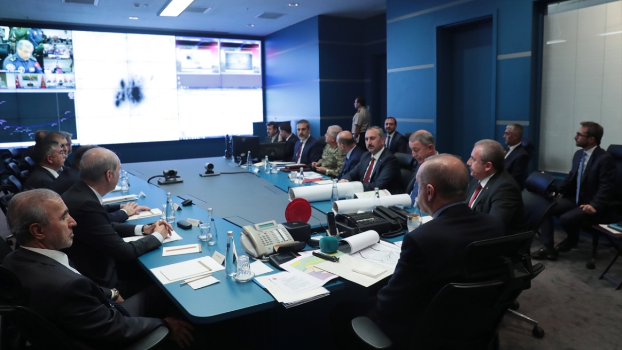 Cumhurbaşkanlığından toplantıya ilişkin yeni paylaşılan görüntülerde Erdoğan, toplantıya katılanlara teşekkürlerini ileterek, bölgeden video konferans yaptığı komutanlara başarılı ve emniyetli uçuşlar temennisinde bulundu.