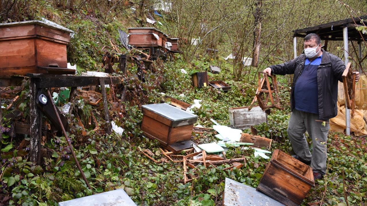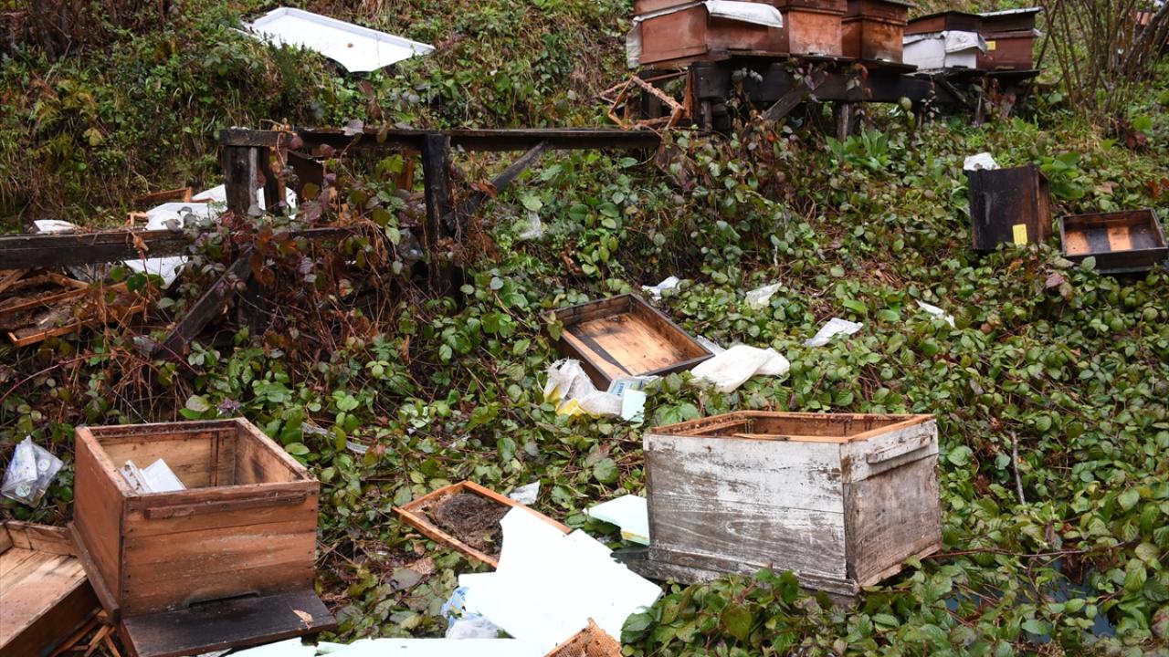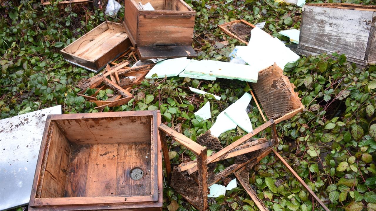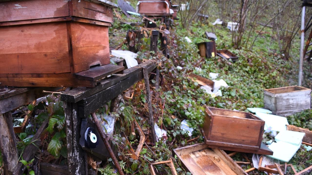 Bartın'ın Kurucaşile ilçesinde köye inen ayılar, 29 arı kovanına zarar vererek açtıkları peteklerdeki balı yedi.
