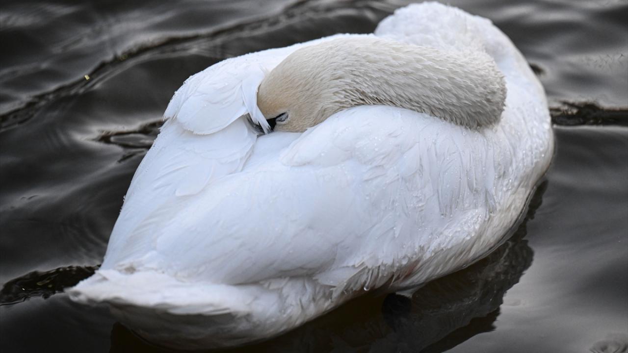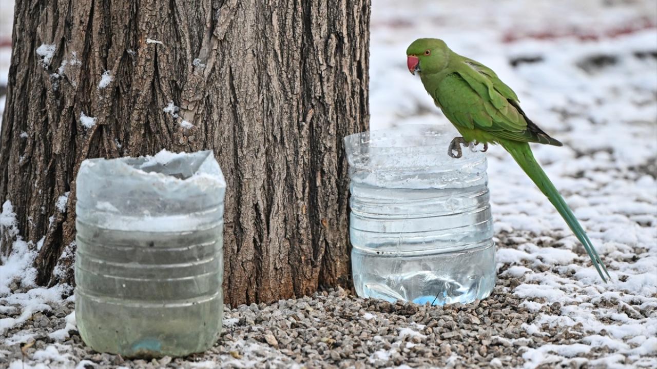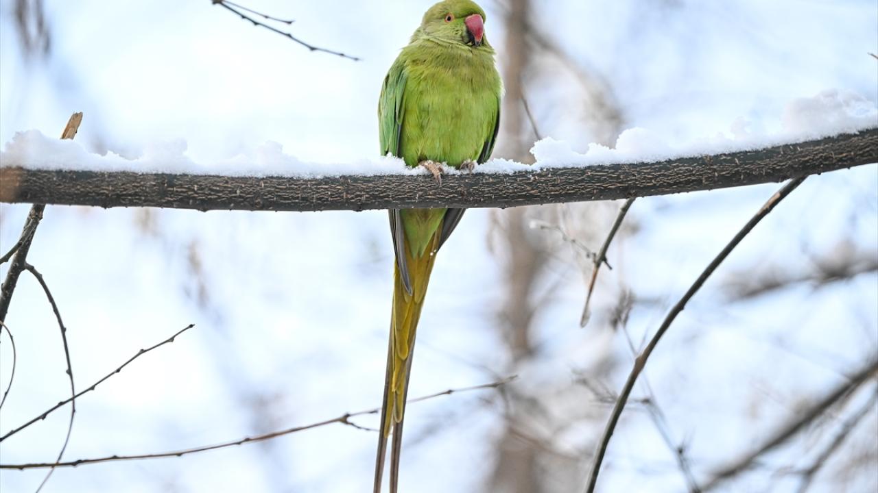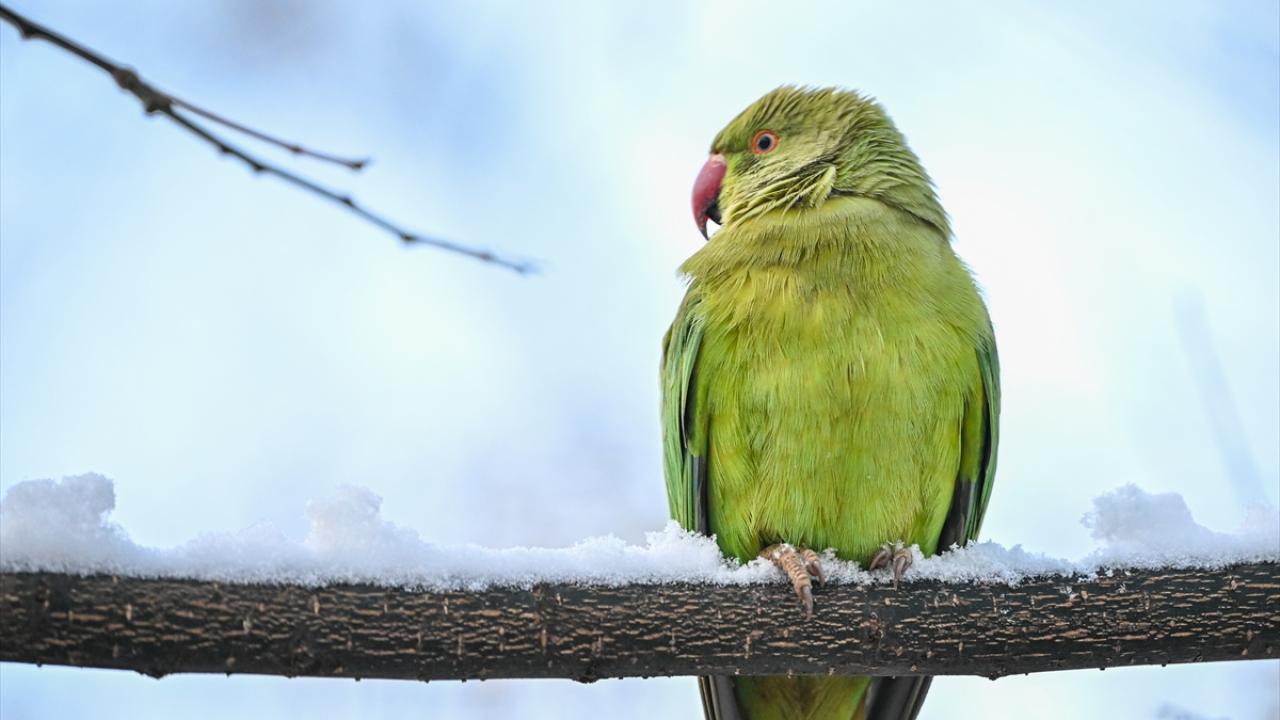 Doğal yaşam alanları Afrika ile Güney Asya olan ve anavatanları dışında popülasyonunu artırarak yerleşik bir tür haline gelen yeşil papağanlar (Psittacula Krameri), karla kaplı parkta yiyecek aradı.