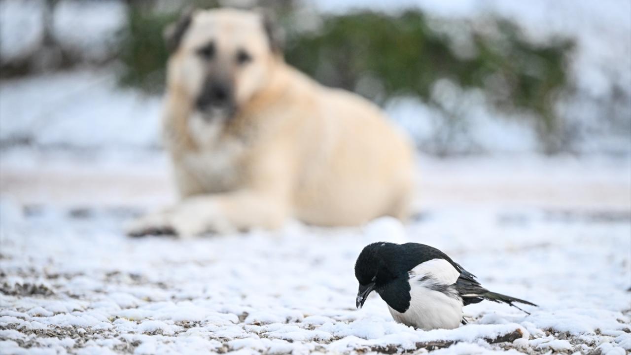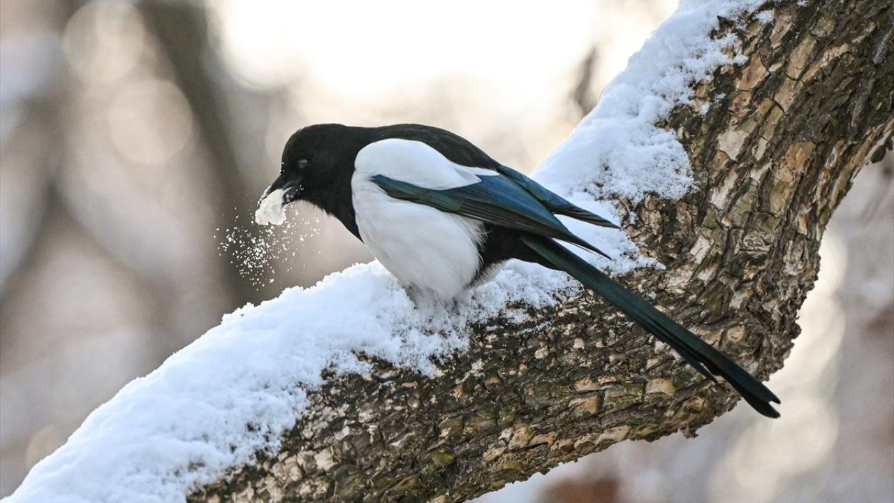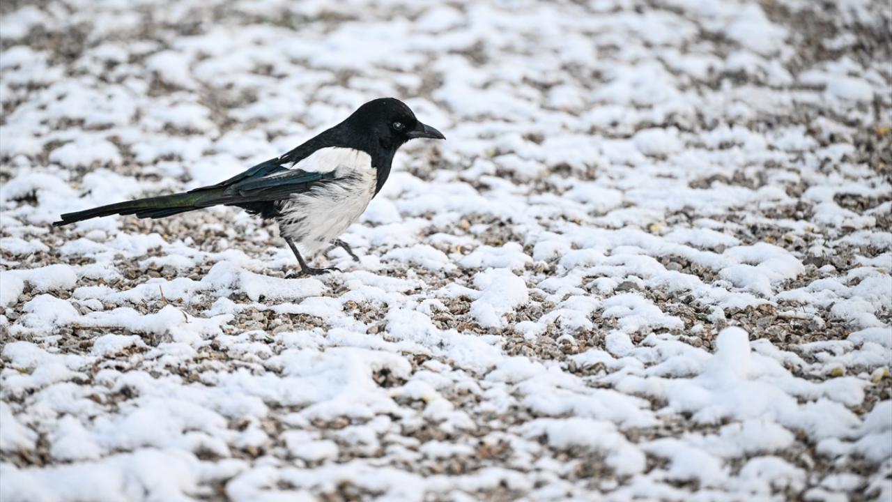 Saksağan kuşları, karla kaplı parkta yiyecek aradı.