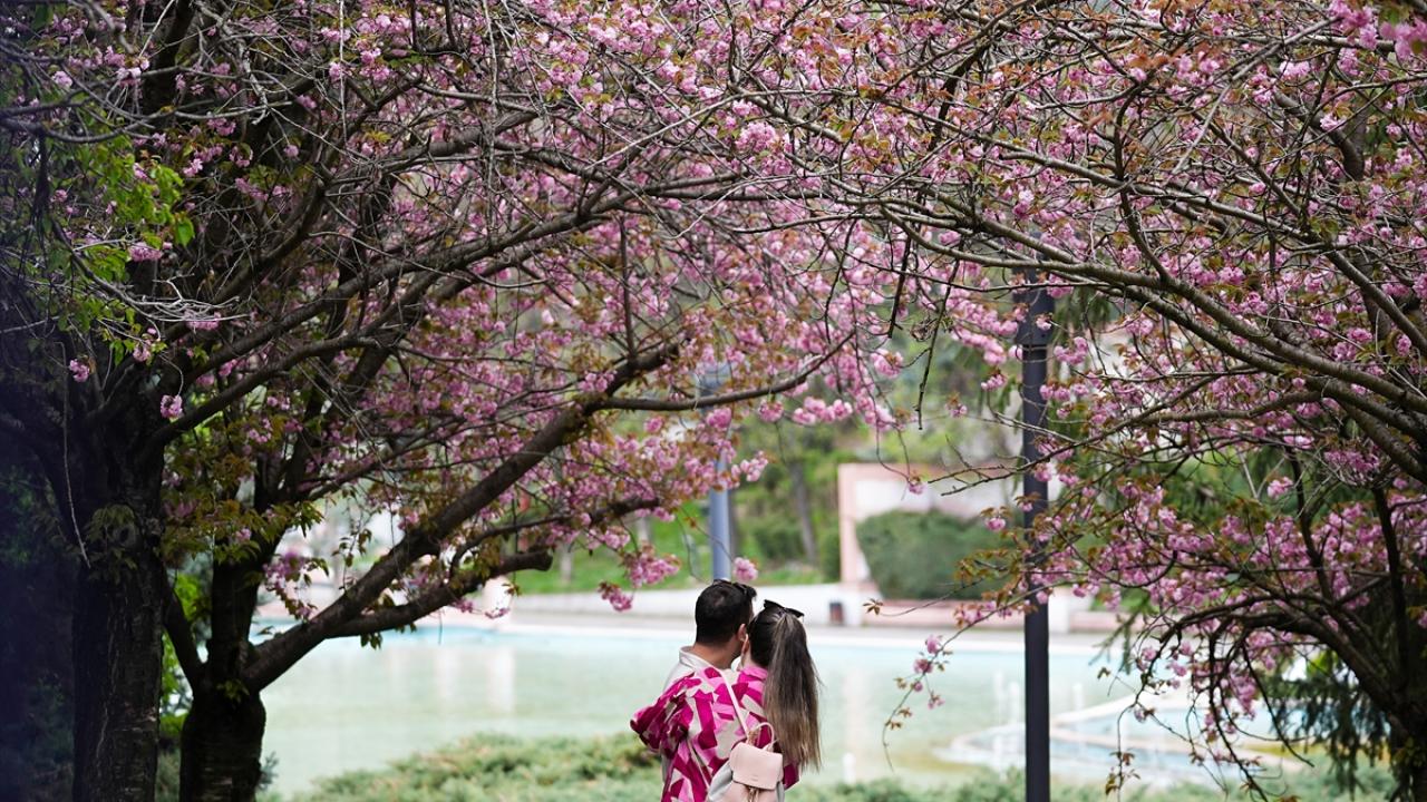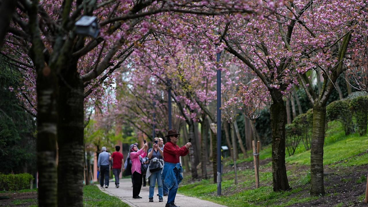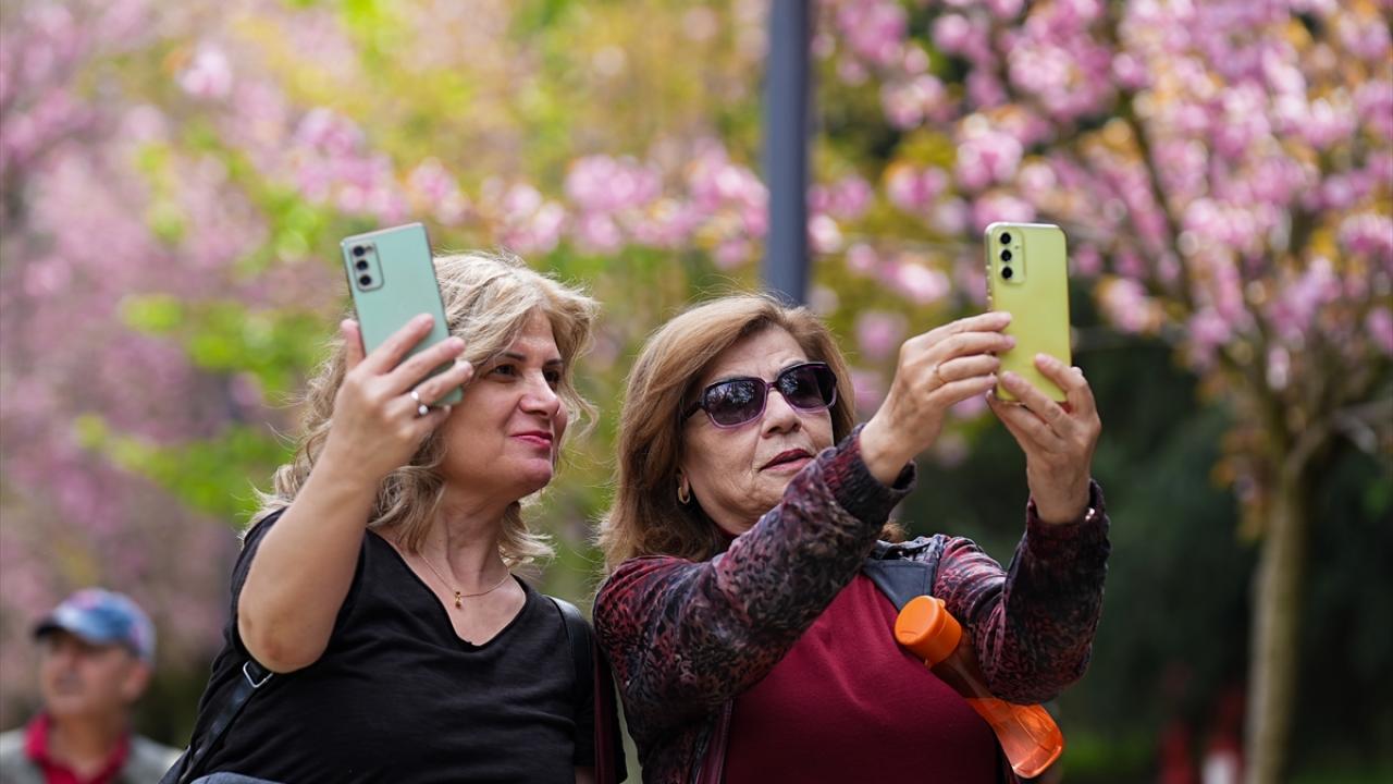 Vatandaşlar, pembenin tonlarına bürünen ağaçların arasında fotoğraf çekildi.