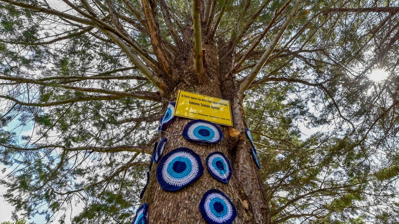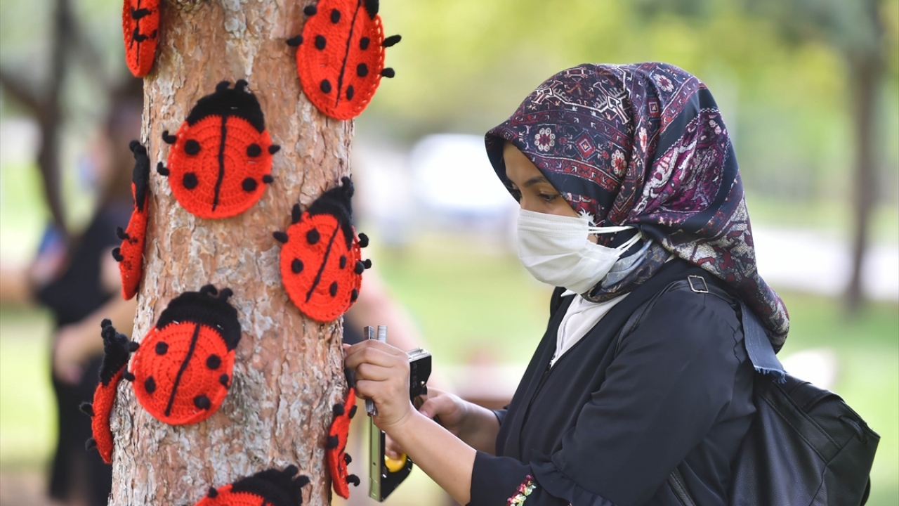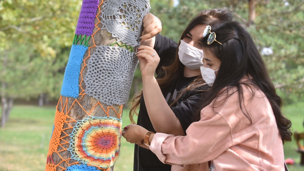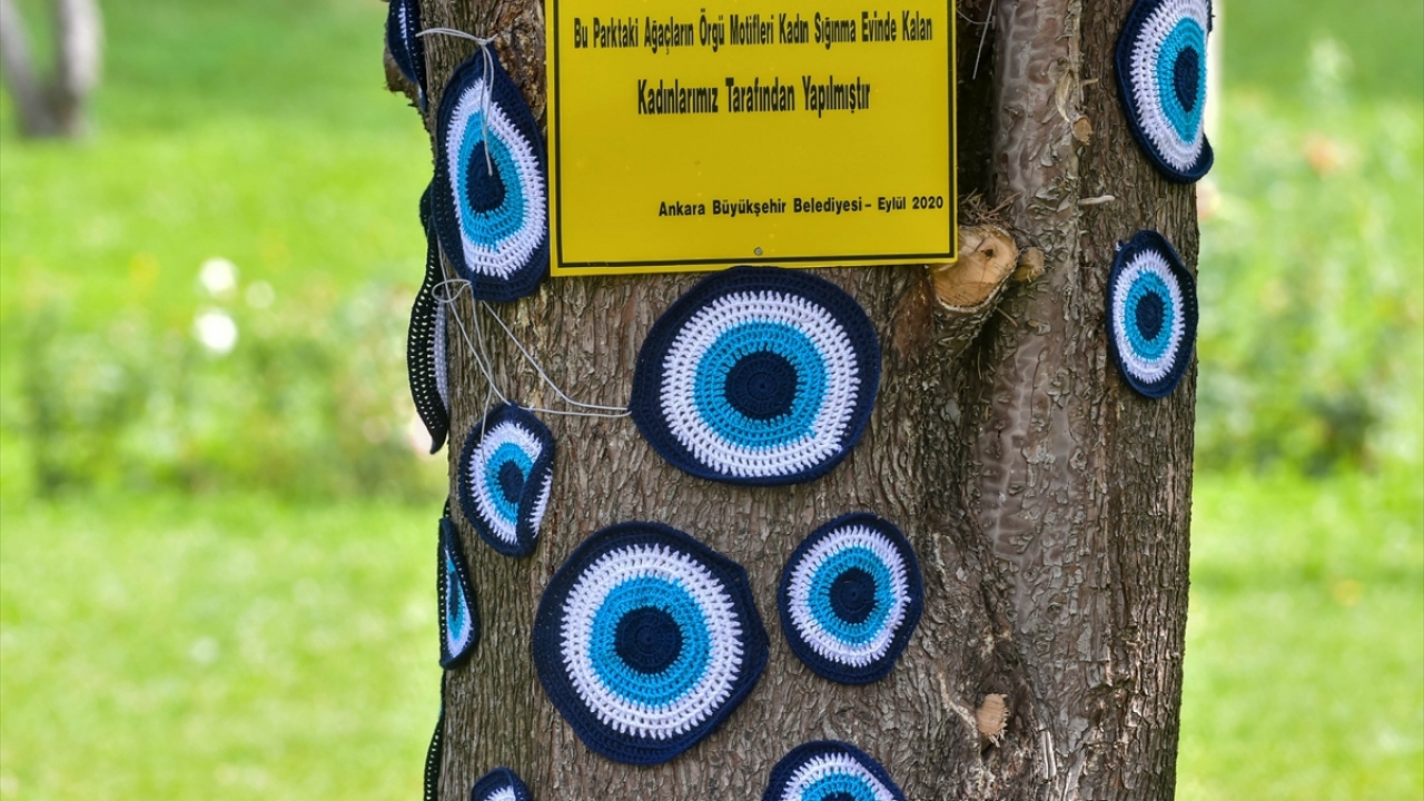 Ankara Büyükşehir Belediyesi'nin Kadın Sığınma Evleri'nde kalan kadınların el emeği süs örgüleri, 30 Ağustos Zafer Parkı'daki ağaçlara giydirildi.