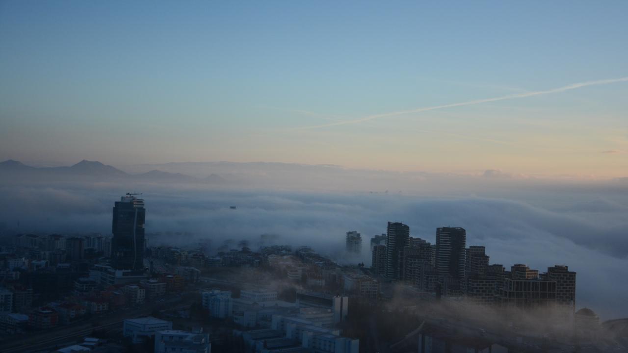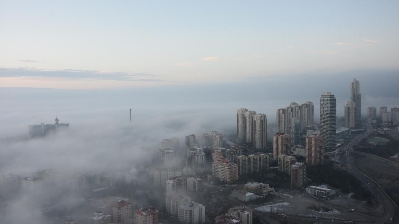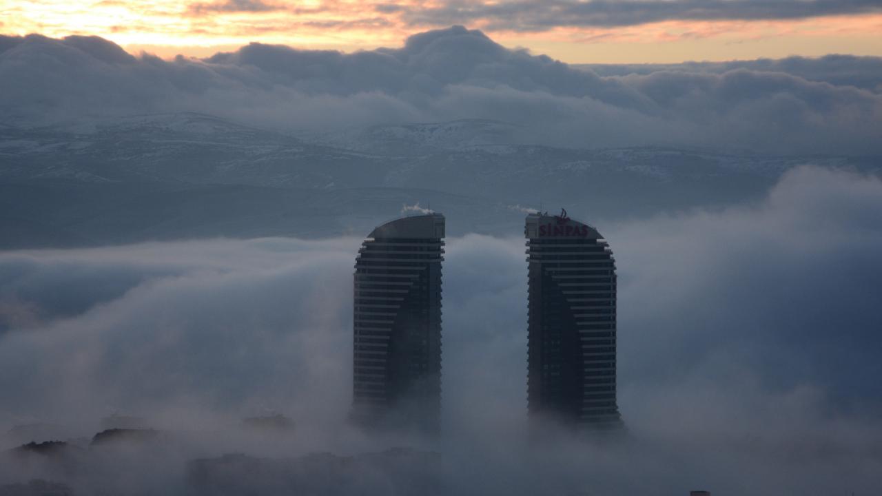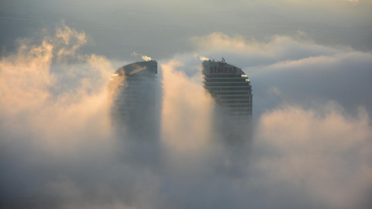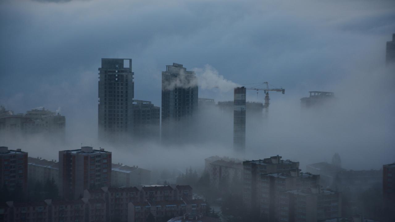 Sis bulutunun altında kalan şehirde binalar da gözden kayboldu.