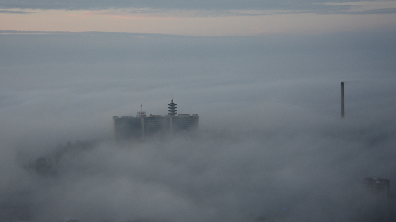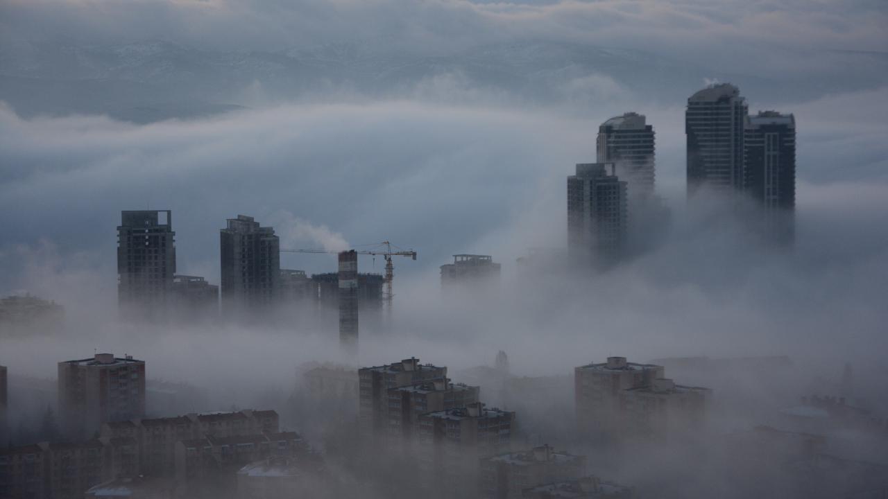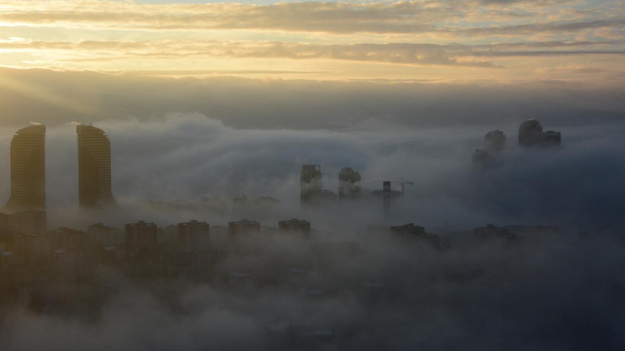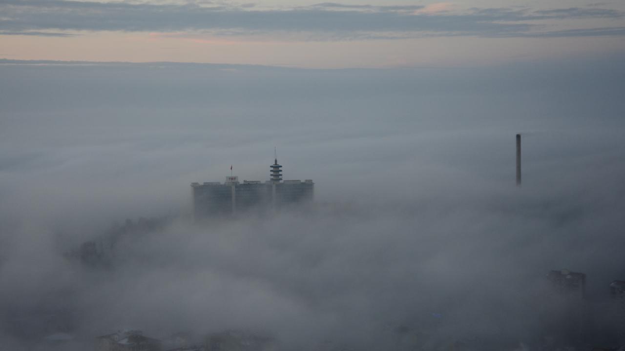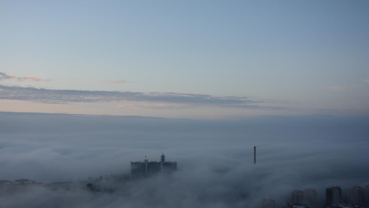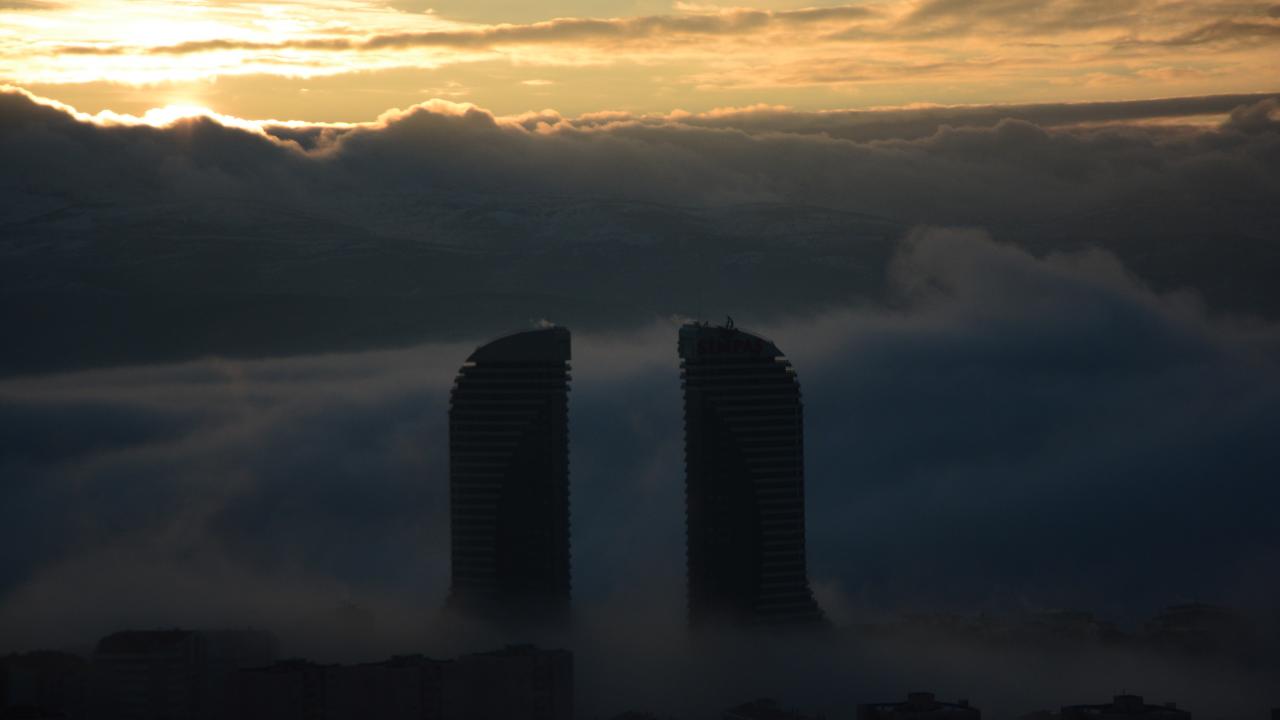 Sis bulutunun altında kalan şehirde binalar da gözden kayboldu.
