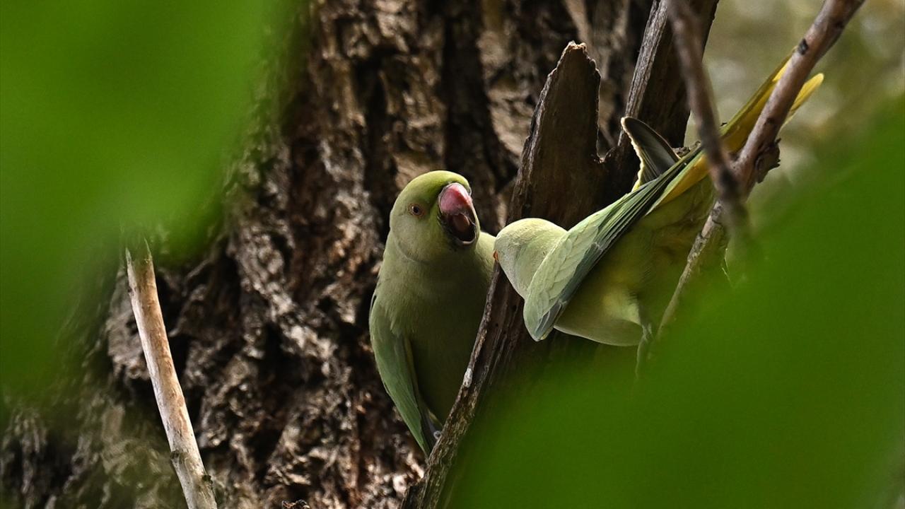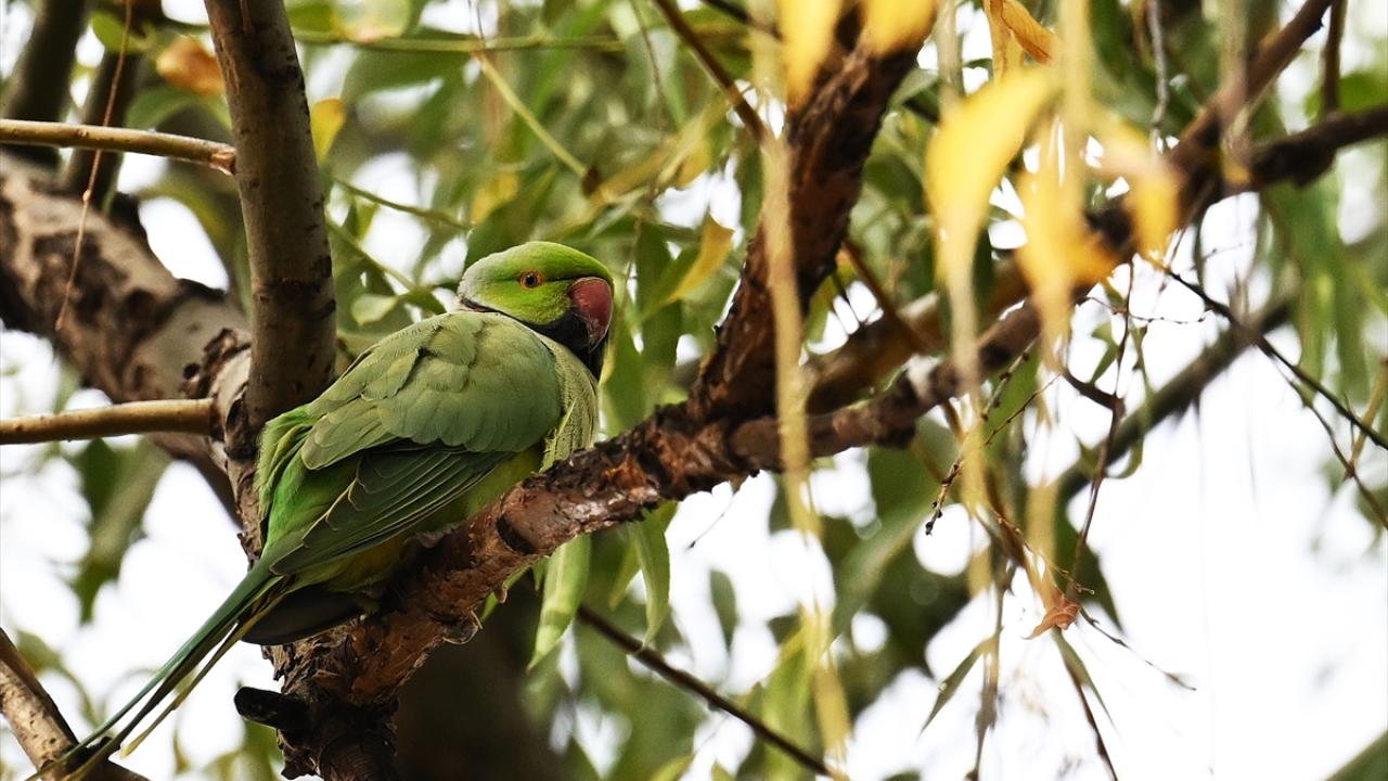 Doğal yaşam alanları Afrika ve Güney Asya olan yeşil papağanlar, Çankaya ilçesindeki parklarda sararan yaprakların arasında görüntülendi.