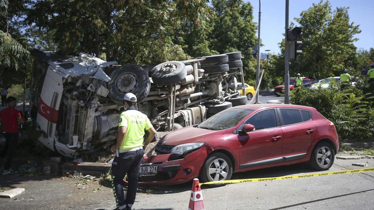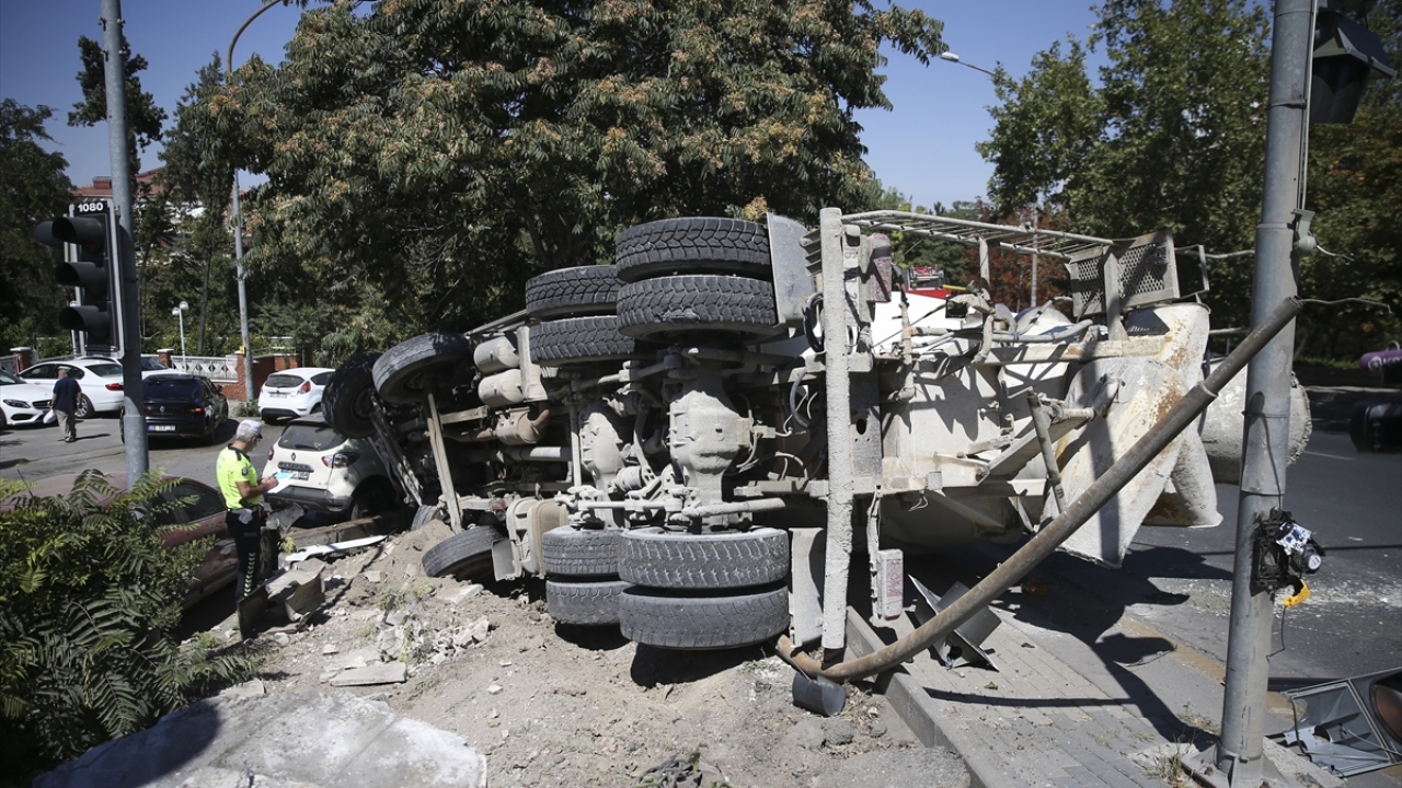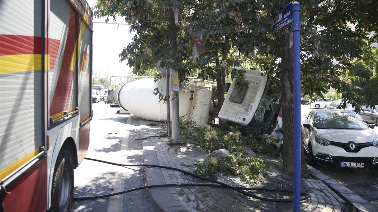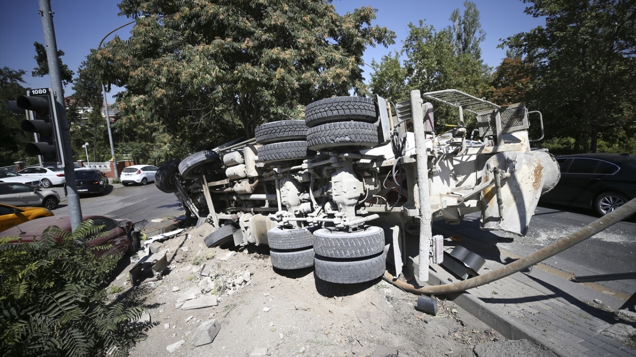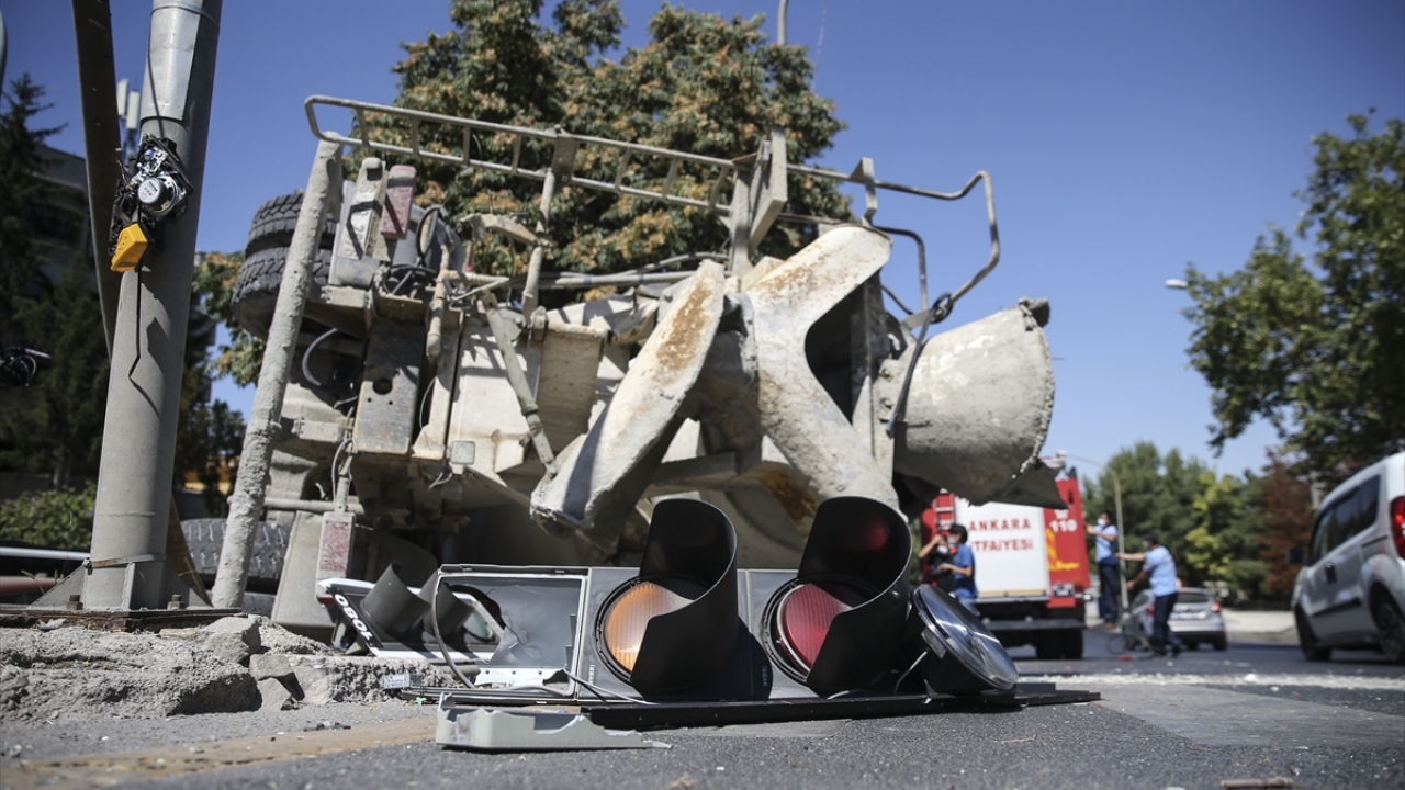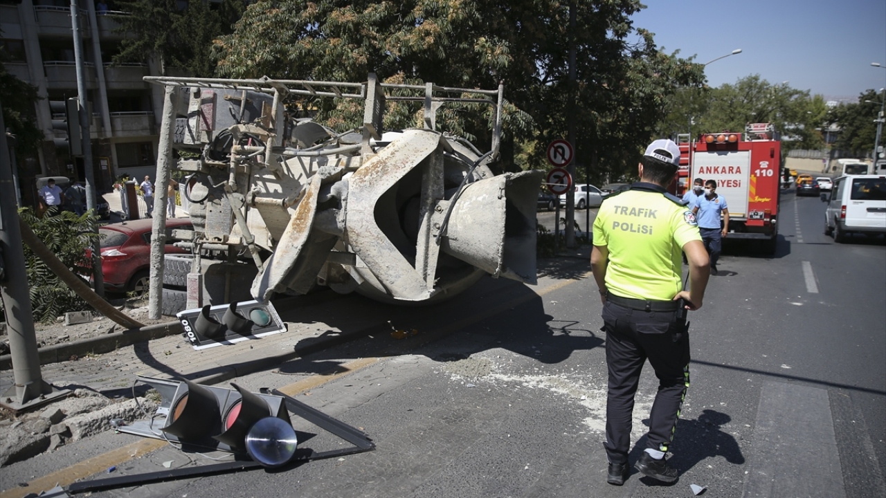 Başkentte, Atatürk Bulvarı'ndan 15 Temmuz Kızılay Milli İrade Meydanı istikametine giden beton mikseri, trafik ışıklarına çarpmasının arıdından devrildi.