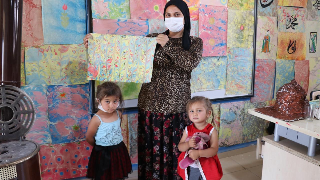 Ev ve tarla işleri ile çocuk bakımından arta kalan zamanlarını kursta değerlendiren 12 kadın, ebru sanatının öğrenmenin mutluluğunu yaşıyor.