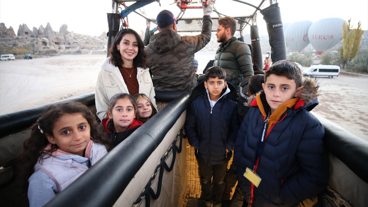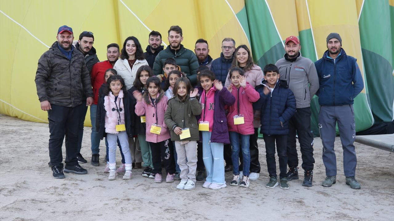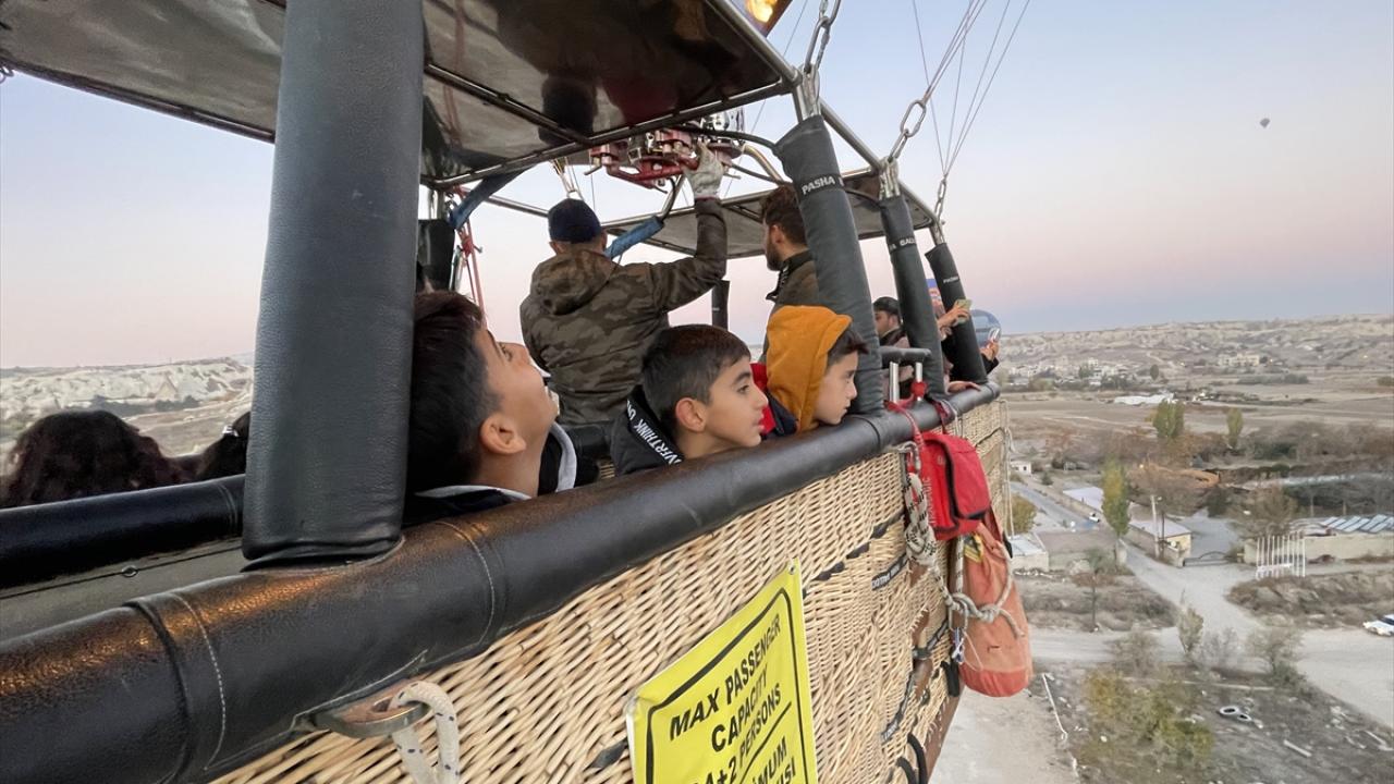 Nevşehir`e gelen 11 öğrenci ile 3 öğretmen, konakladıkları otelden alınarak Göreme beldesindeki sıcak hava balonları kalkış alanına getirildi. Hazırlanan sıcak hava balonuna binen öğretmen ve öğrenciler, yeni günü gökyüzünde karşıladı.