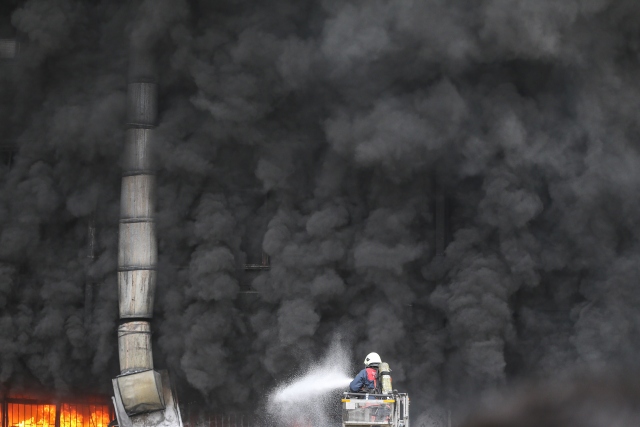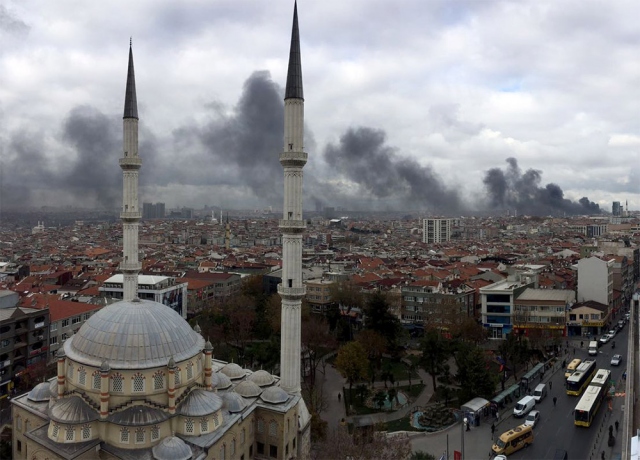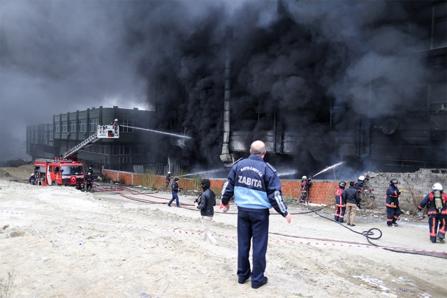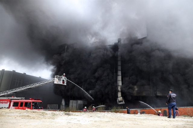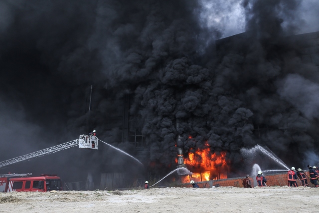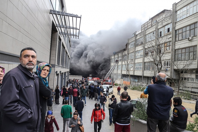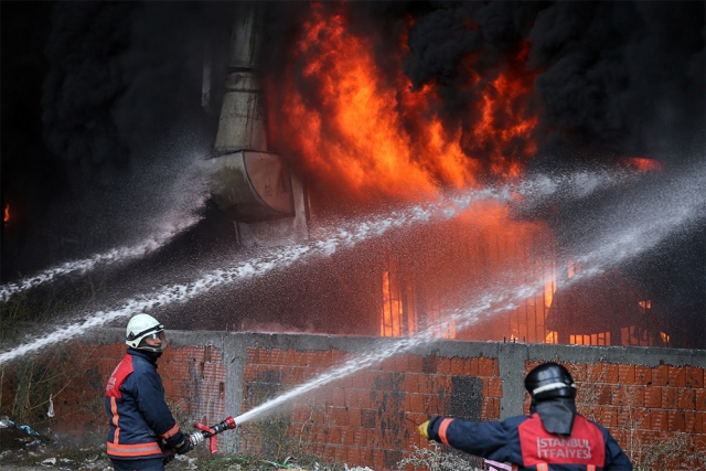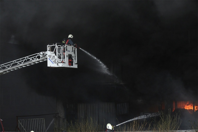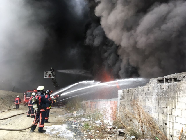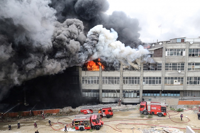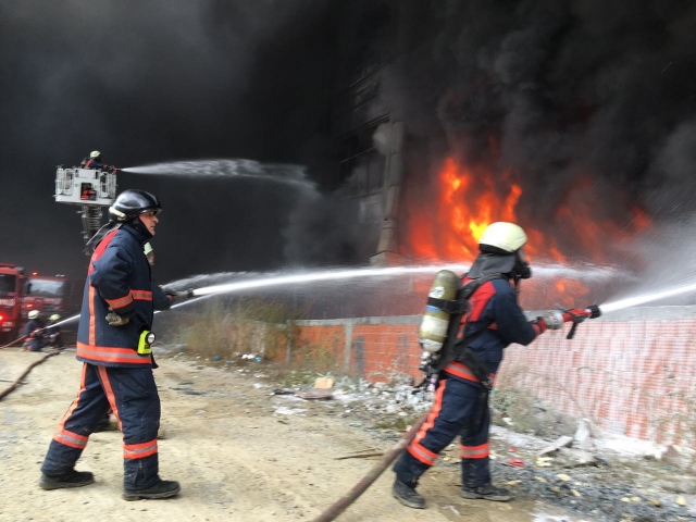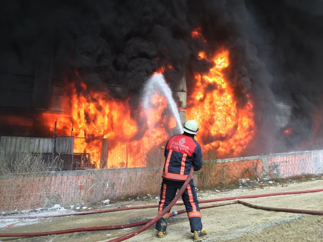Bayrampaşa'da 3 katlı atölyede çıkan yangın, itfaiye ekipleri tarafından kontrol altına alınmaya çalışılıyor.