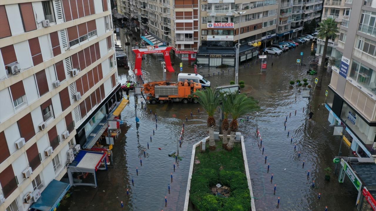 İzmir`in Karşıyaka ve Konak ilçelerinde yoğun yağışın ardından denizin taşması sonucu yollar su altında kaldı, çok sayıda iş yeri, apartman ve dükkanı su bastı.