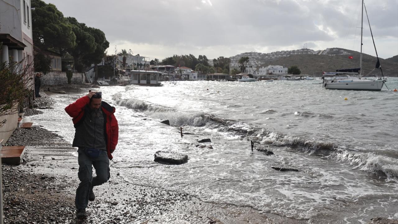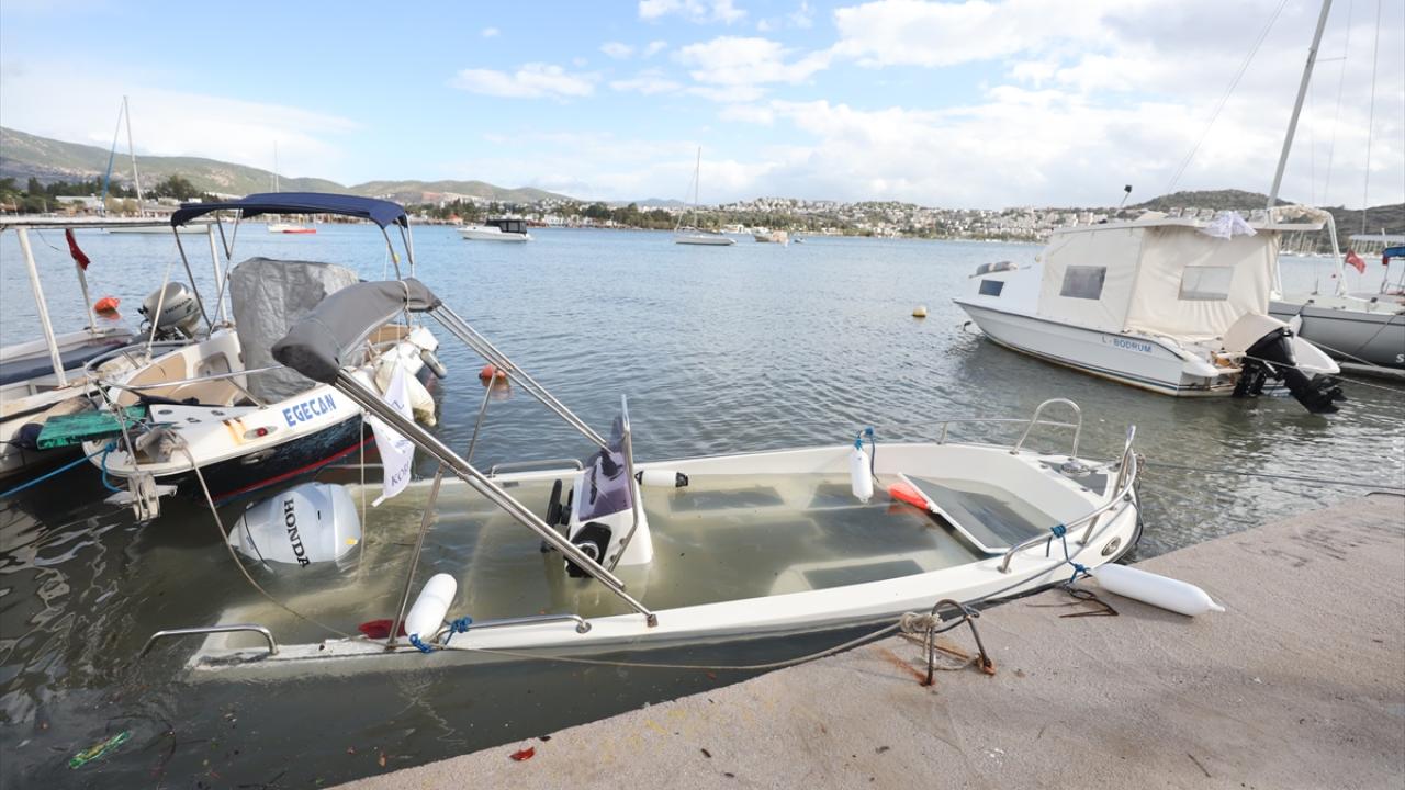 Bodrum ilçesinde fırtına ve sağanak, Ortakent Mahallesi`nde limandaki bir sürat botu ve yelkenli tekneyi batırdı.