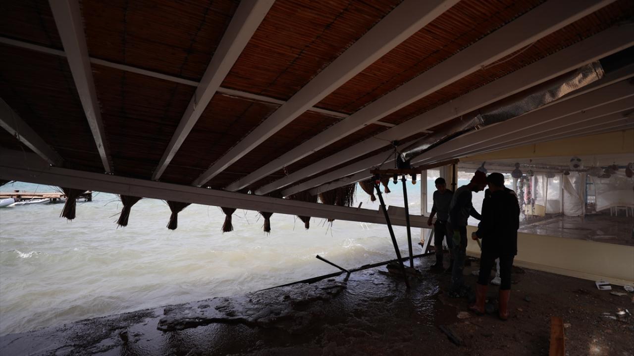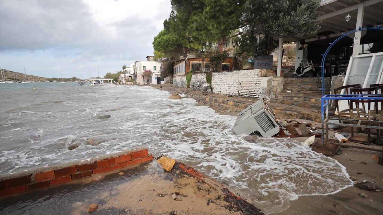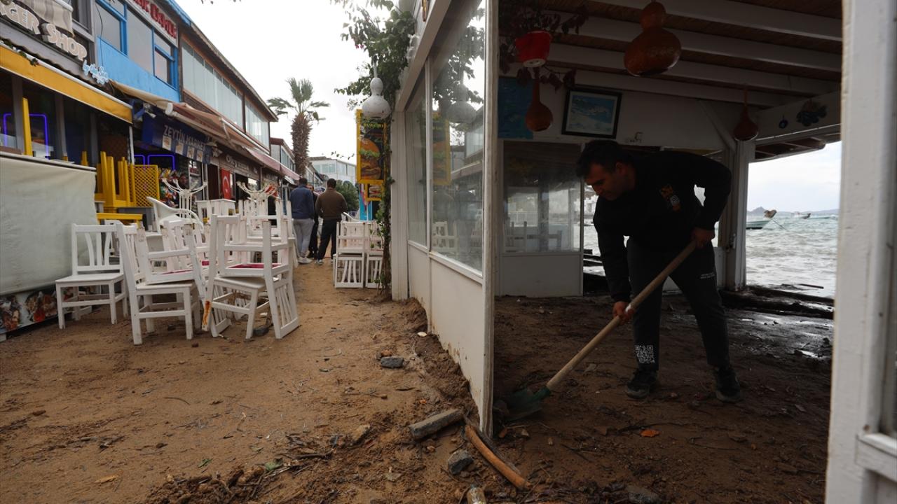 Gümüşlük Mahallesi`nde sahil kenarındaki 20`ye yakın işletmenin masa ve sandalyeleri sürüklendi, bazılarının çatıları uçtu.