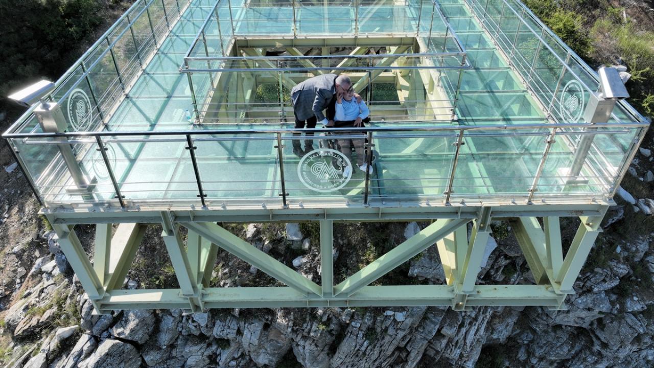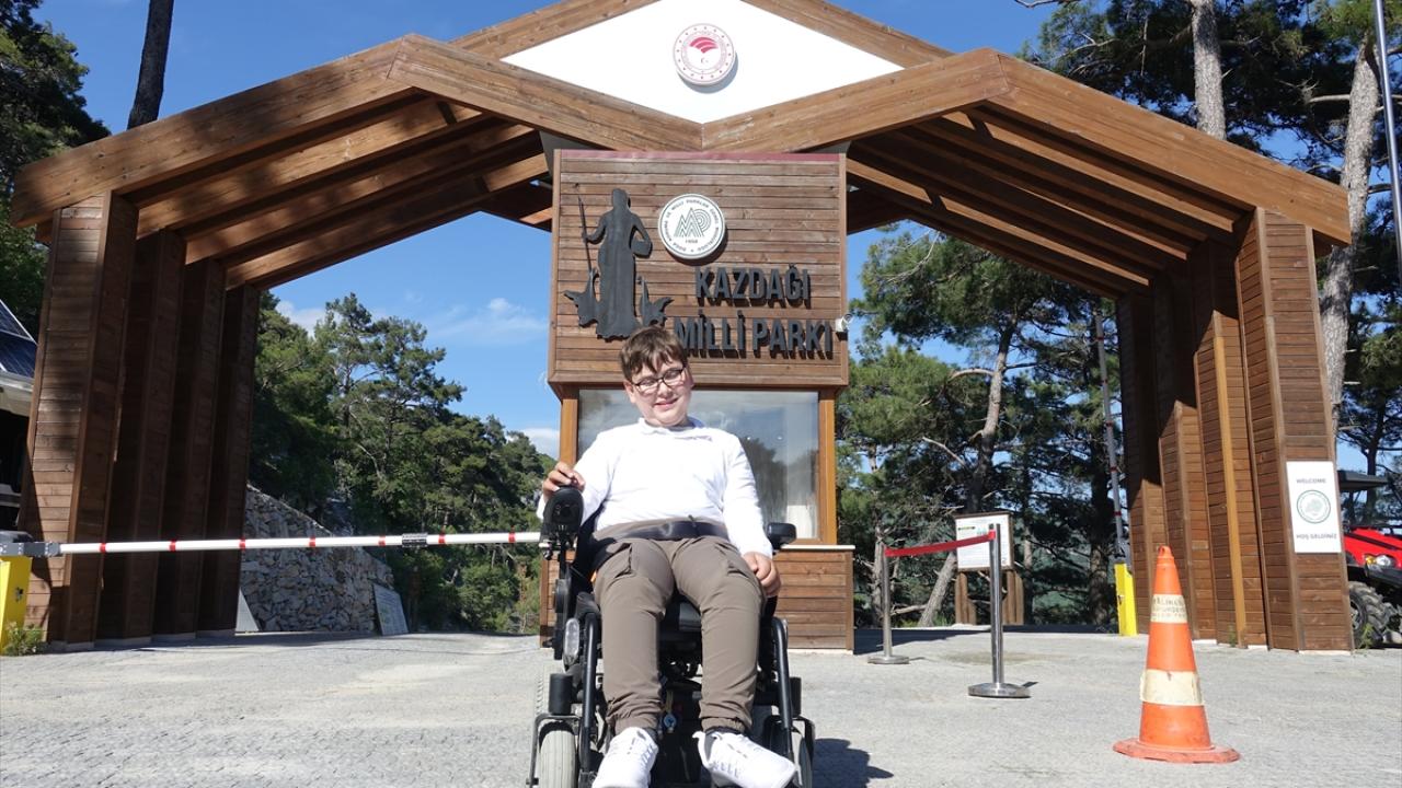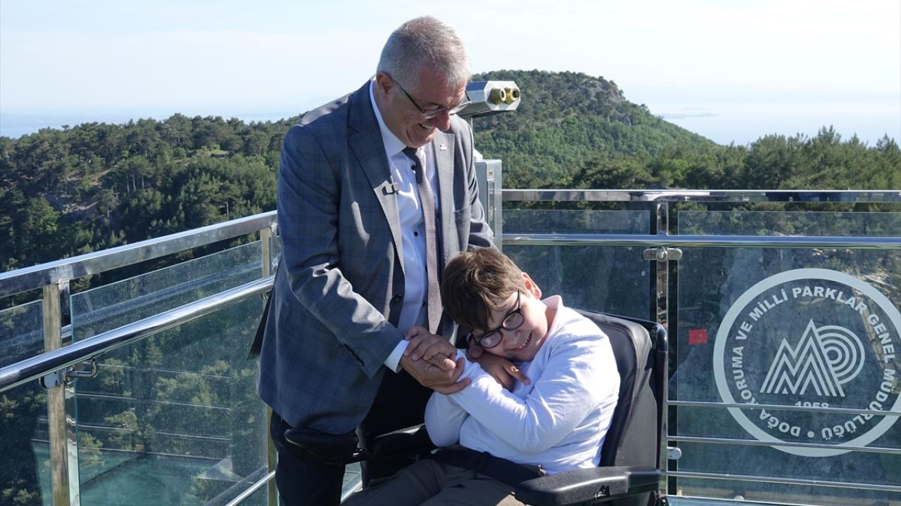 Kazdağları Milli Parkı sınırları içindeki Cam Seyir Terası`na götürülen Muhammet, denize uzanan yemyeşil ormanı seyretme imkanı buldu. Muhammet`e eşlik eden Ertaş, onunla Şahinderesi Kanyonu ve Edremit Körfezi`ni kuş bakışı seyrederek, sohbet etti.