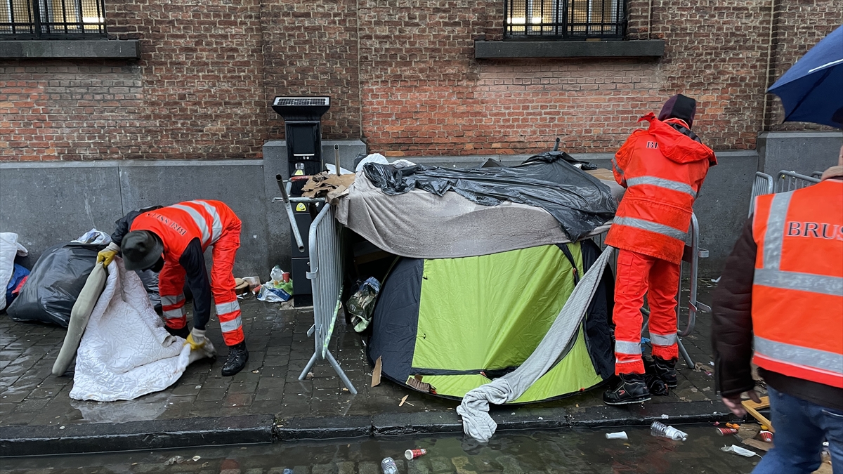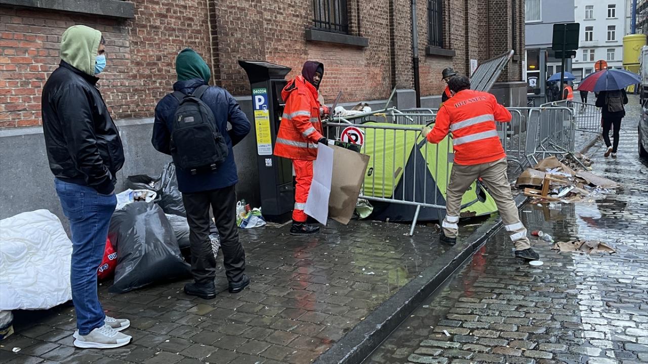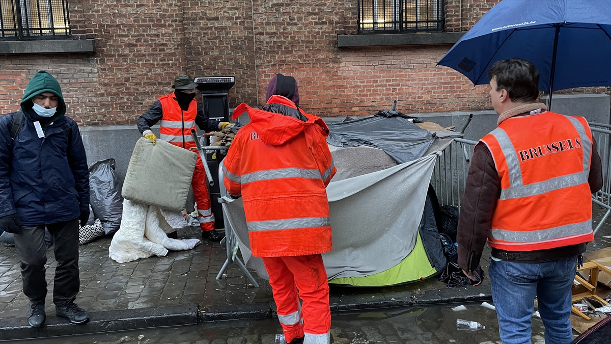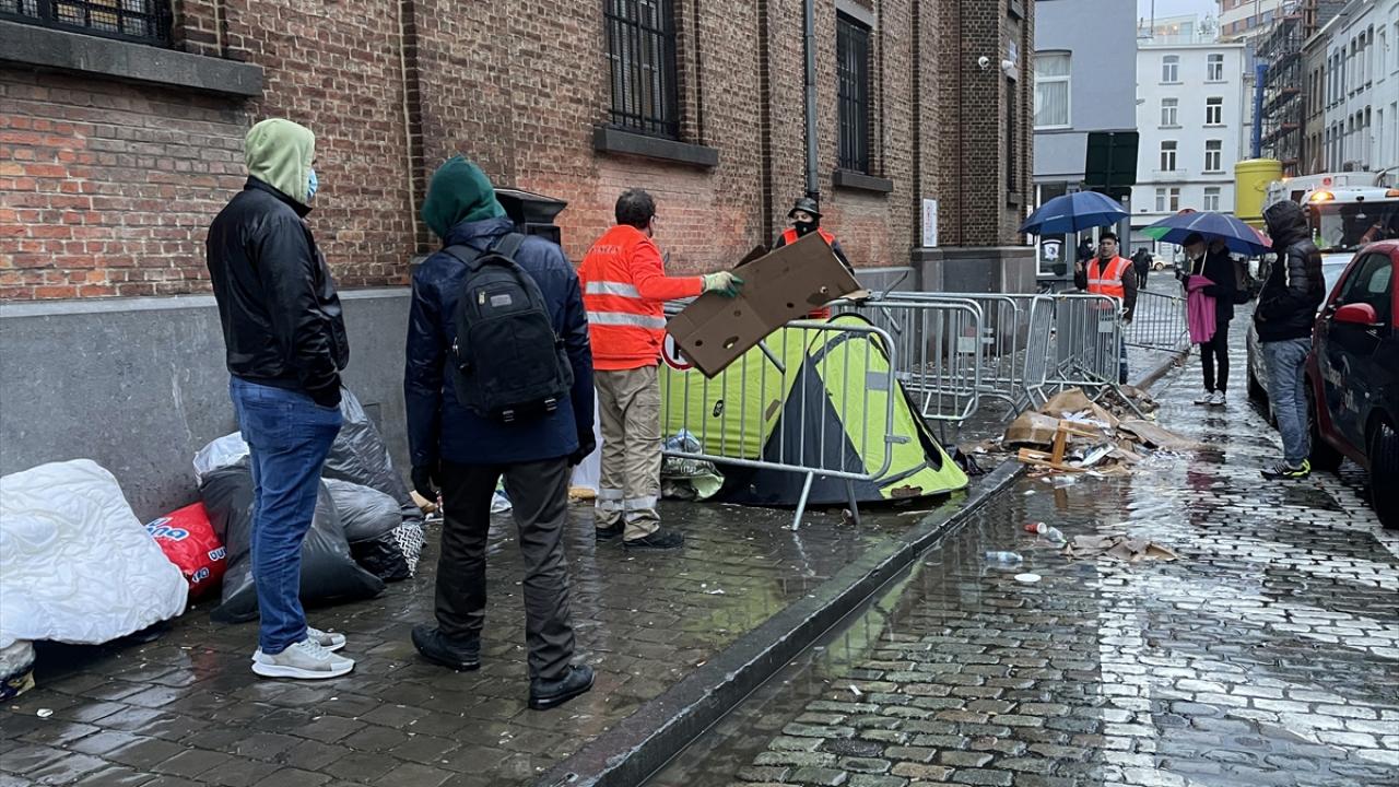 Belçika'nın başkenti Brüksel'de sığınma merkezine alınmak için bekleyen göçmenlerin çadırları söküldü. Çadırlar çöpe atılırken caddeler tazyikli suyla temizlendi. Göçmenler özel eşyalarını alarak yağmur altında beklemeye devam etti.