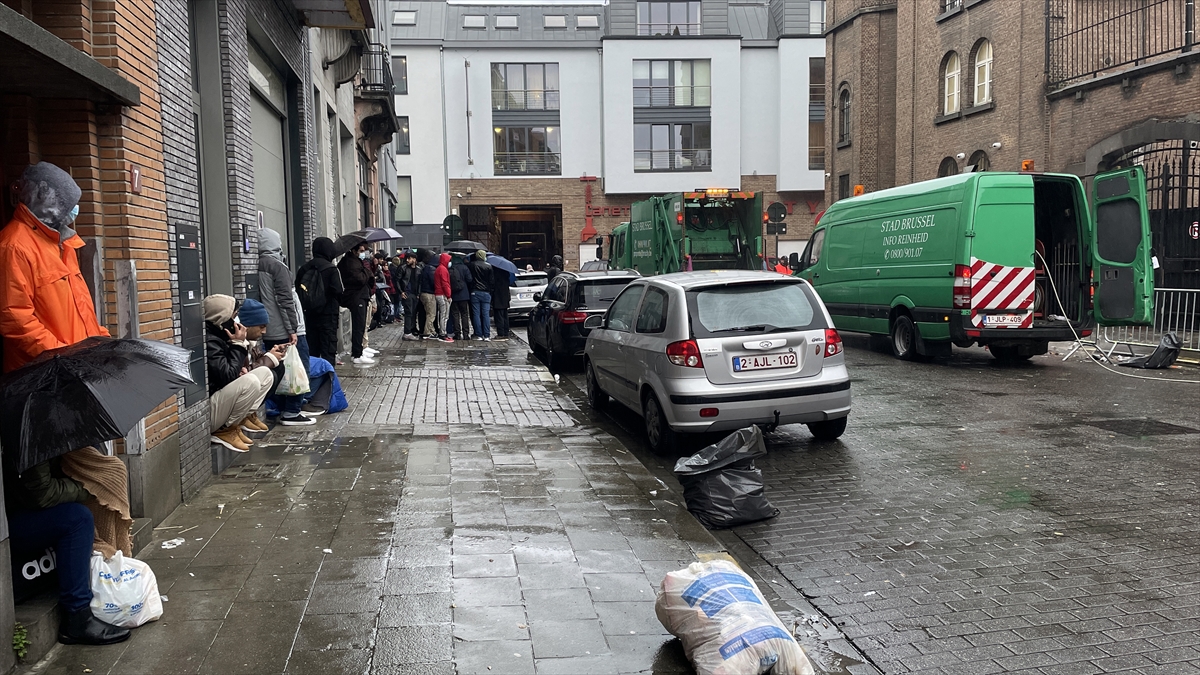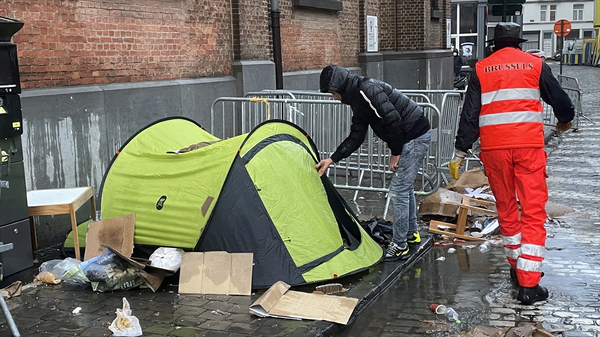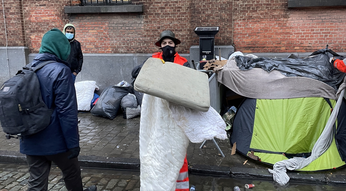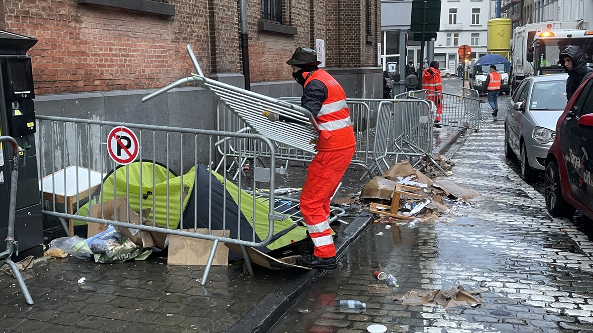 Belçika'nın başkenti Brüksel'de sığınma merkezine alınmak için bekleyen göçmenlerin çadırları söküldü. Çadırlar çöpe atılırken caddeler tazyikli suyla temizlendi. Göçmenler özel eşyalarını alarak yağmur altında beklemeye devam etti.